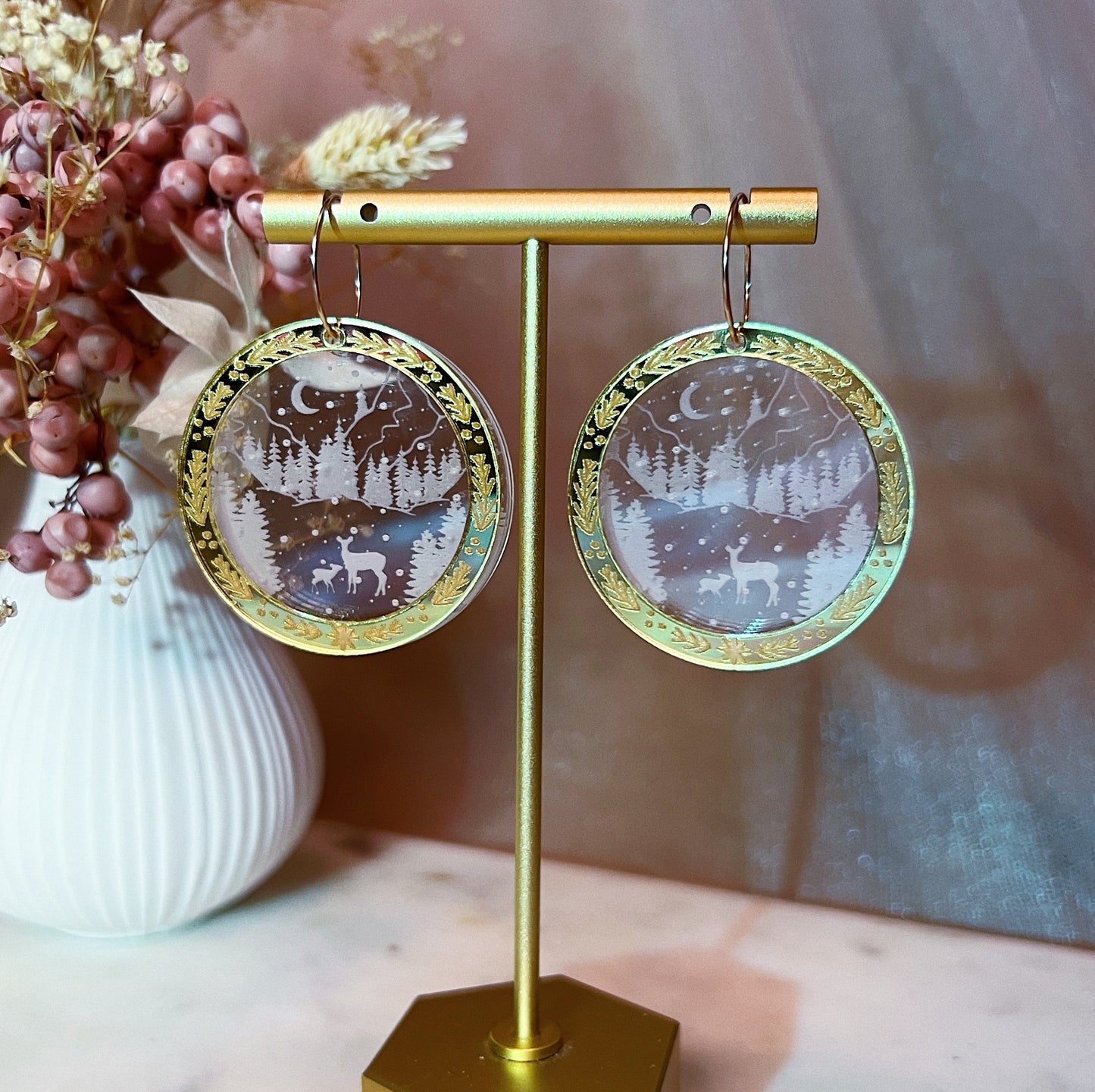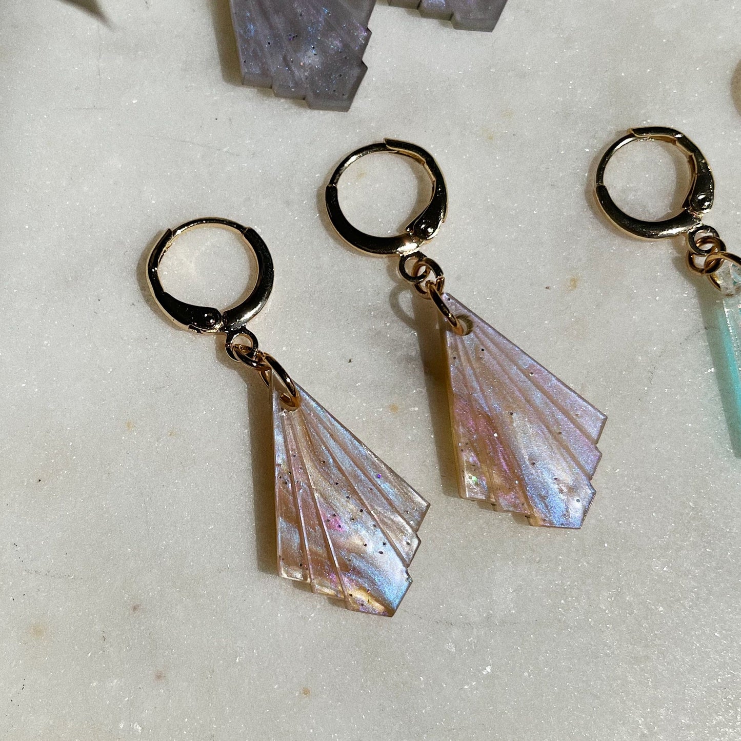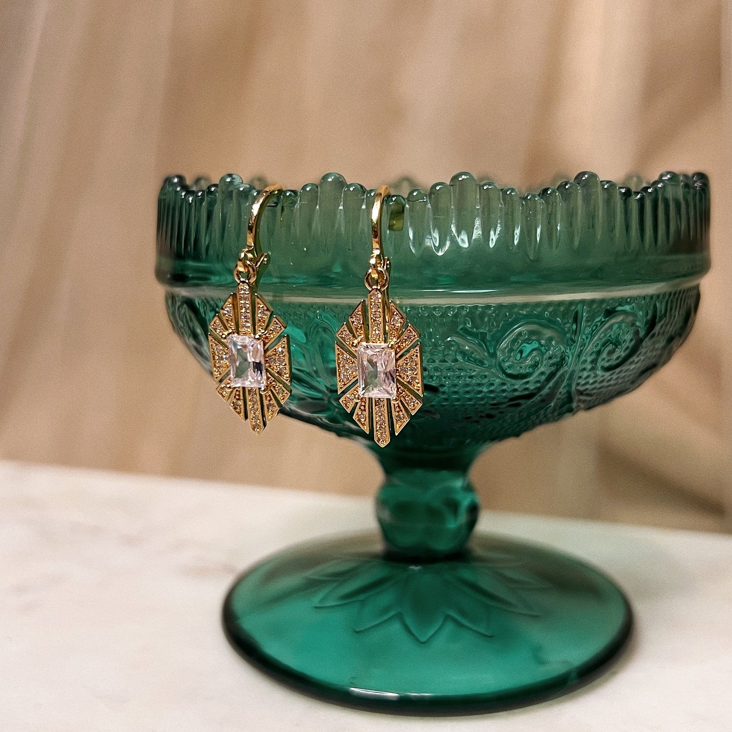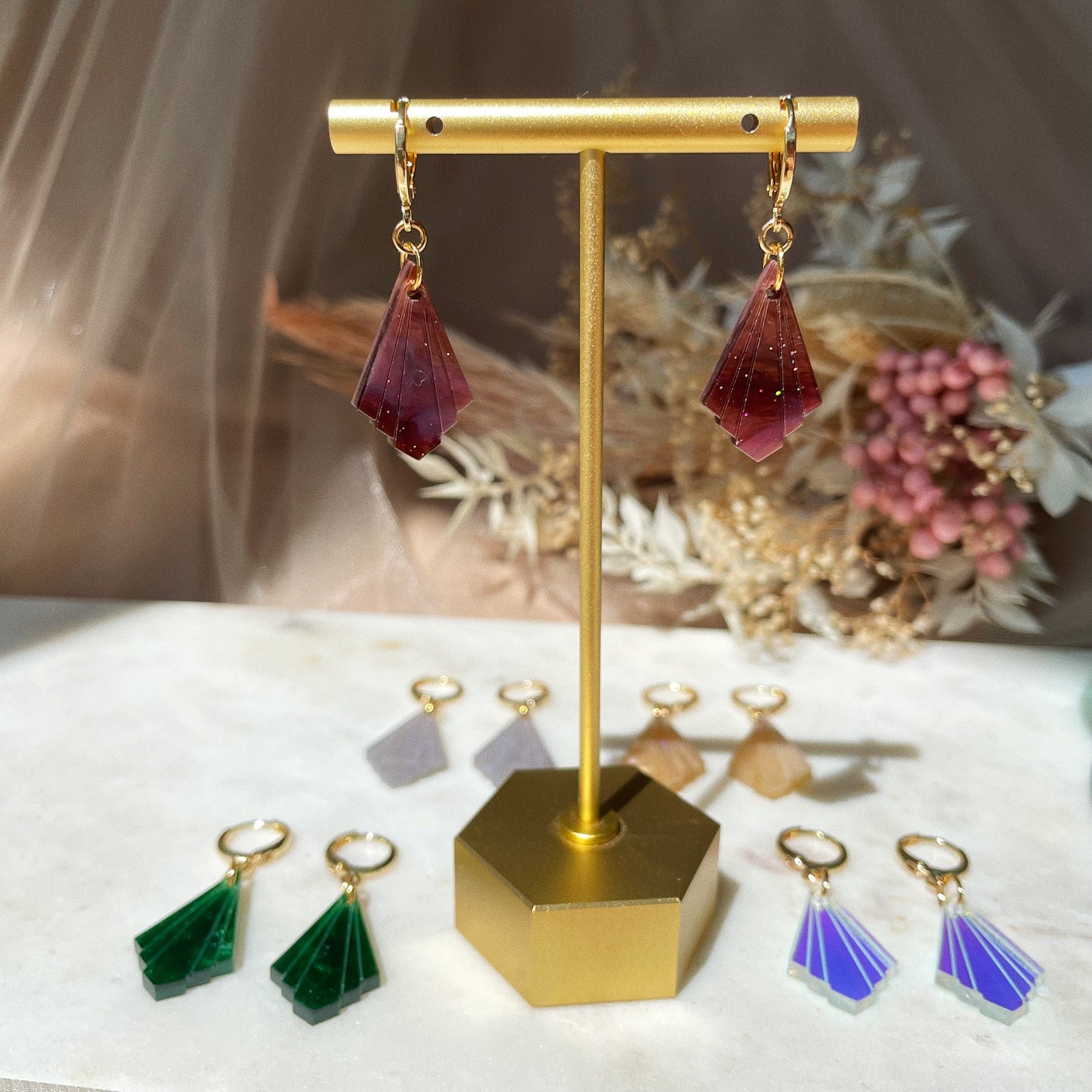 A pair of chandelier earrings with transparent green glass acrylic and gold-filled or sterling silver chains and ear threader, displayed on a stand against a translucent background.