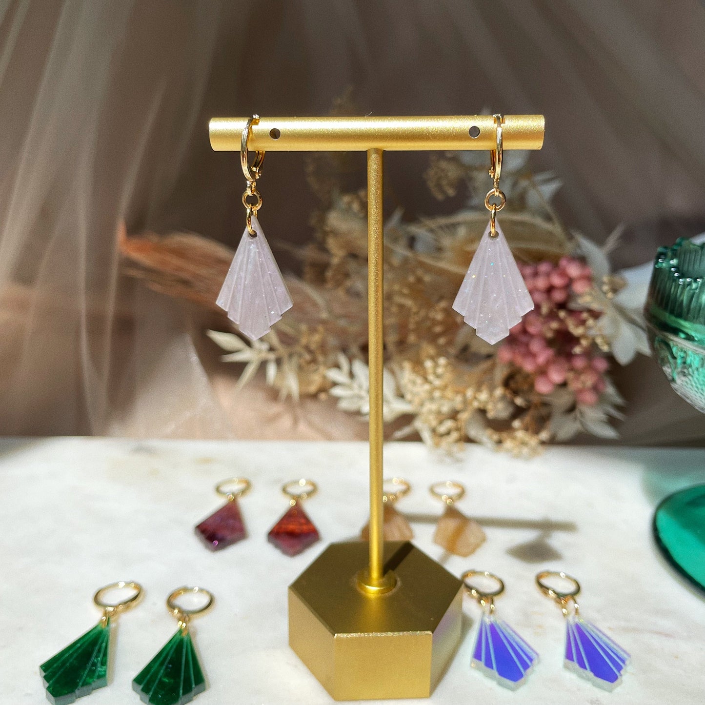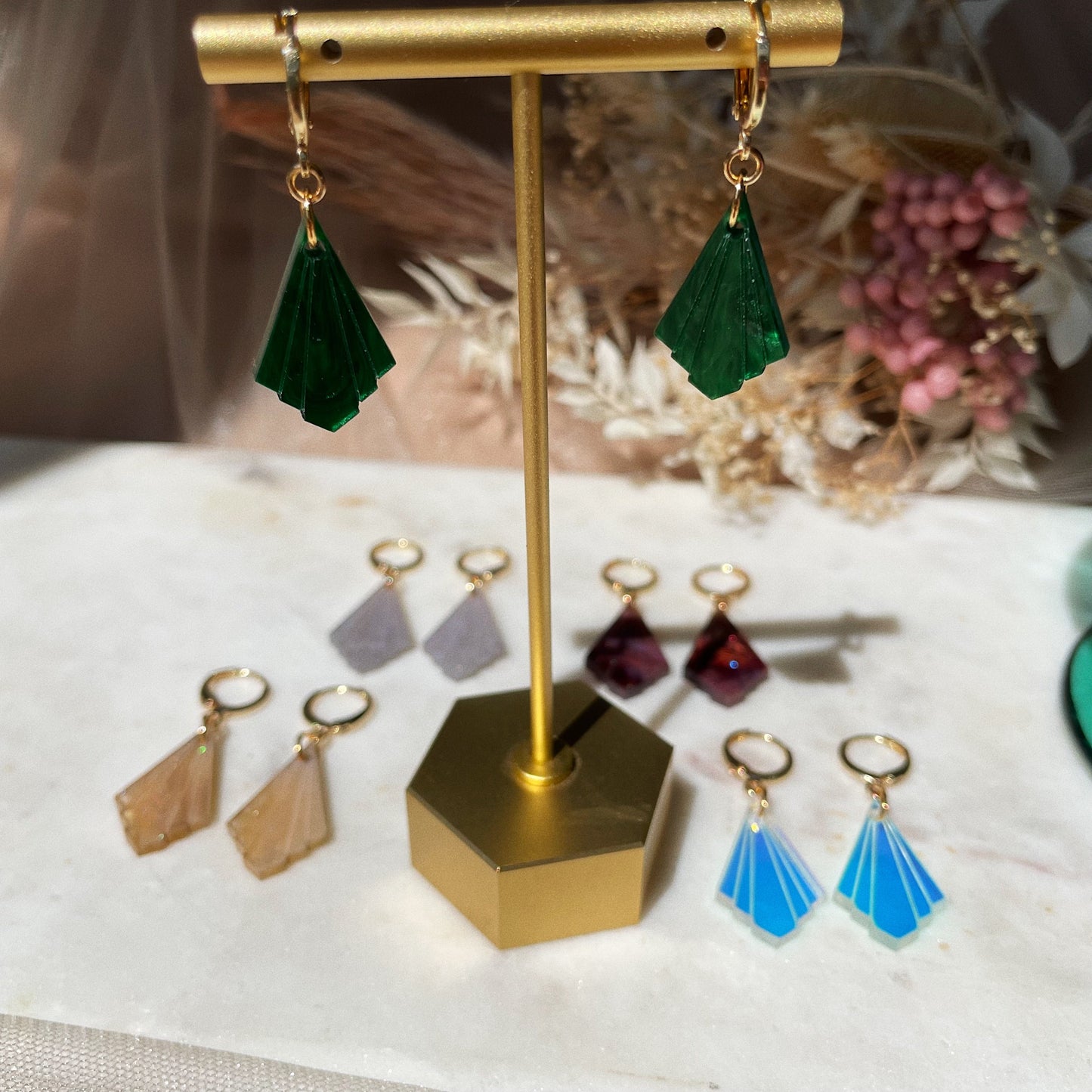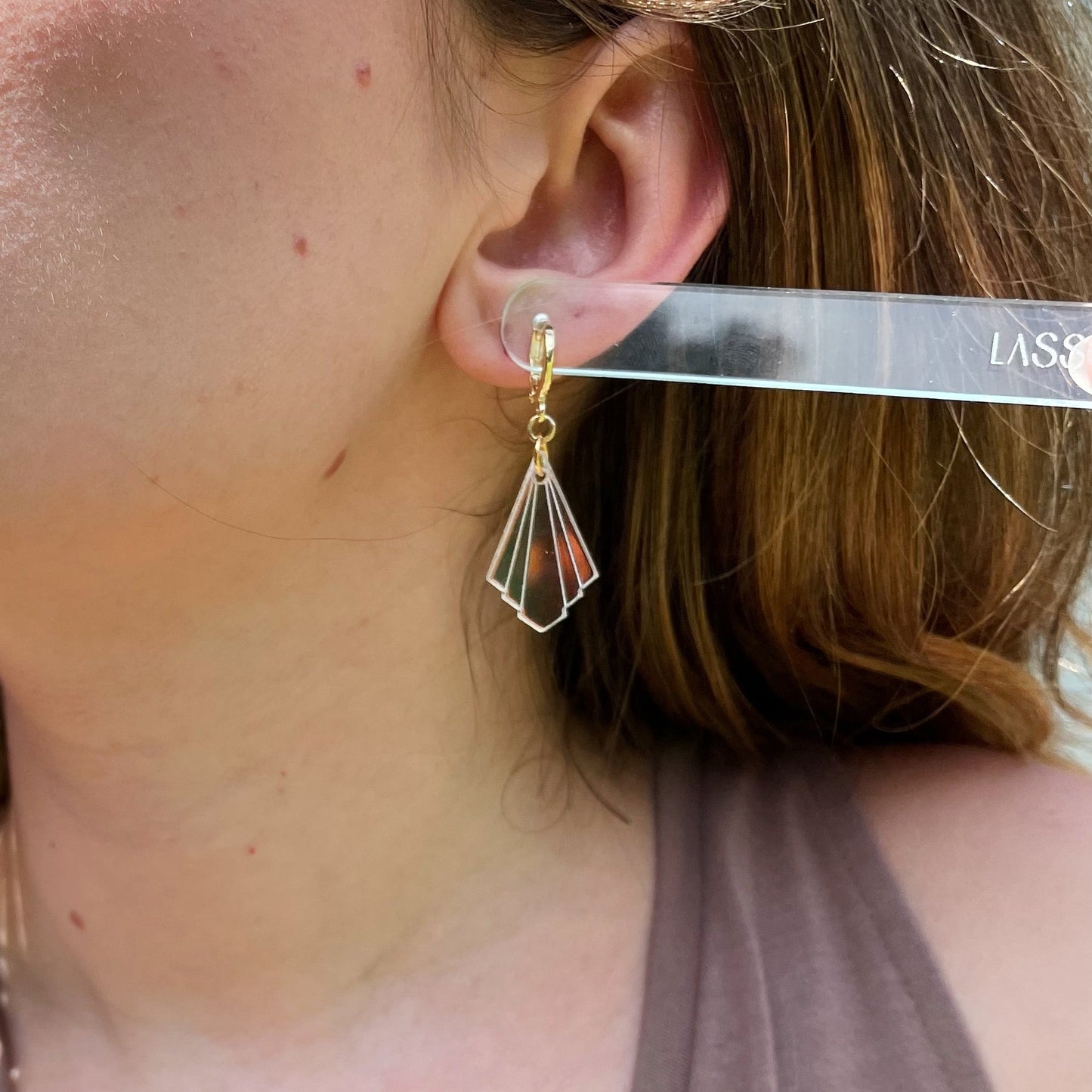 These delicate Art Deco drop earrings are the perfect accessory for every day or a gorgeous, dainty statement. Baby Athena Huggies are made with various colors of premium laser cut acrylic and gold-plated huggie hoops.