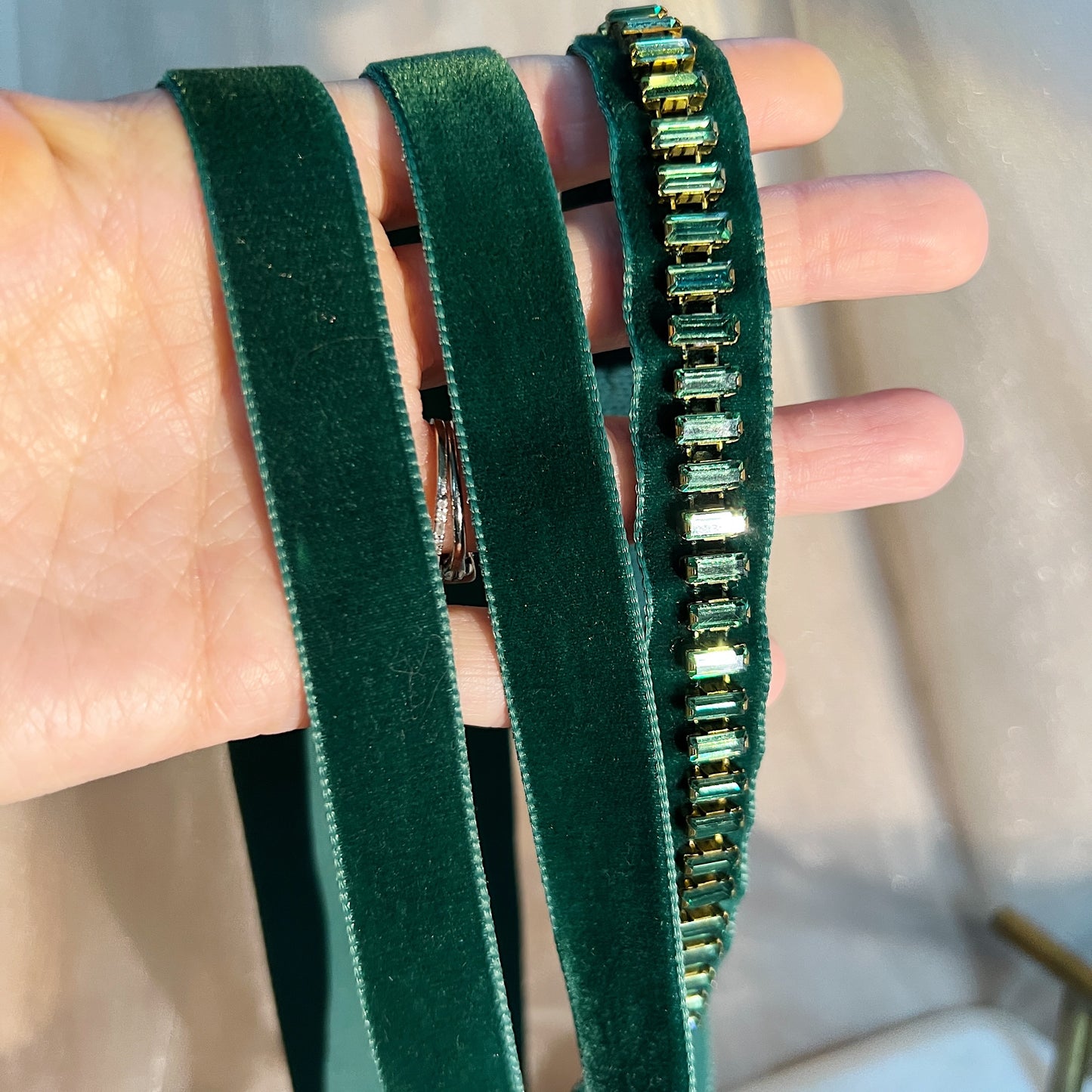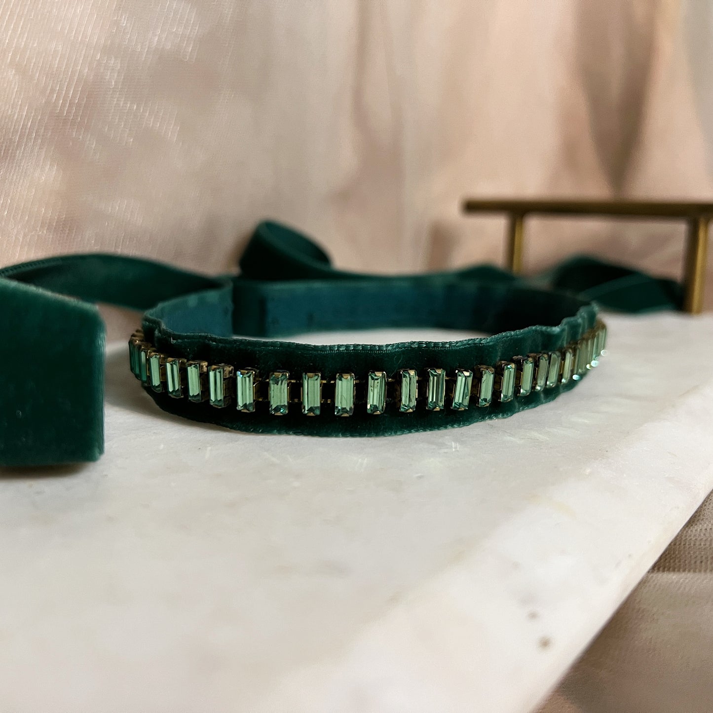 This gorgeous, handsewn necklace is made using a very rare, vintage, light green, swarovski crystal, baguette chain. Each necklace is one-of-a-kind and care is taken to sew each link of the crystal chain to a beautiful deep green velvet ribbon. The Kate necklace can be worn in multiple different ways by tying the ribbon on the front or back of your neck, but it can also be worn in your hair, around a hat, as a belt, or anywhere your heart desires! The possibilities are endless.