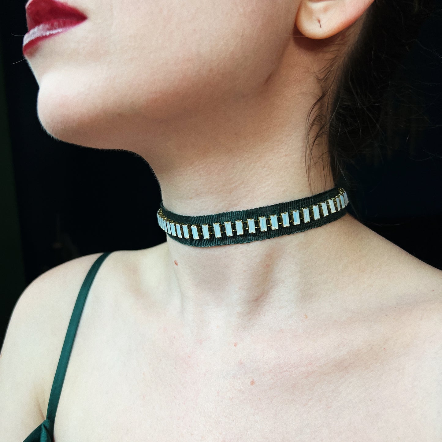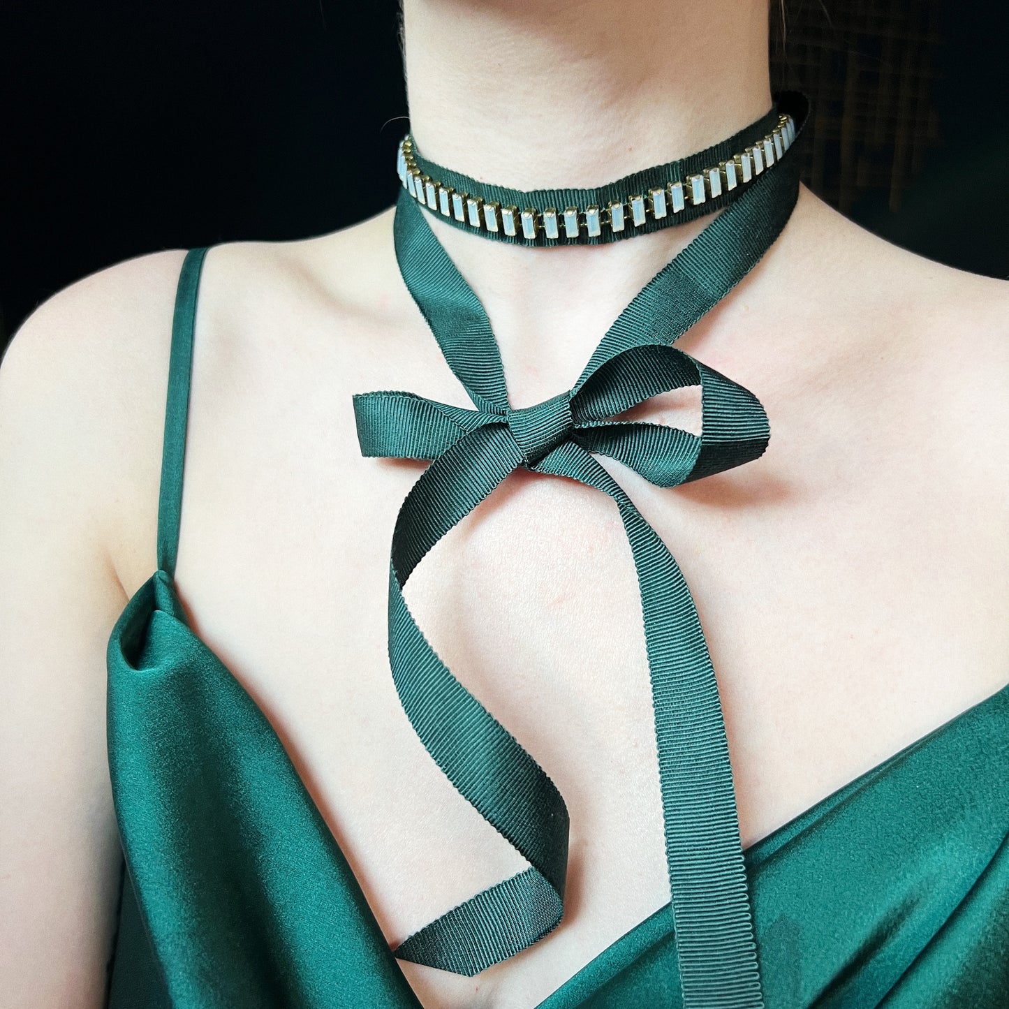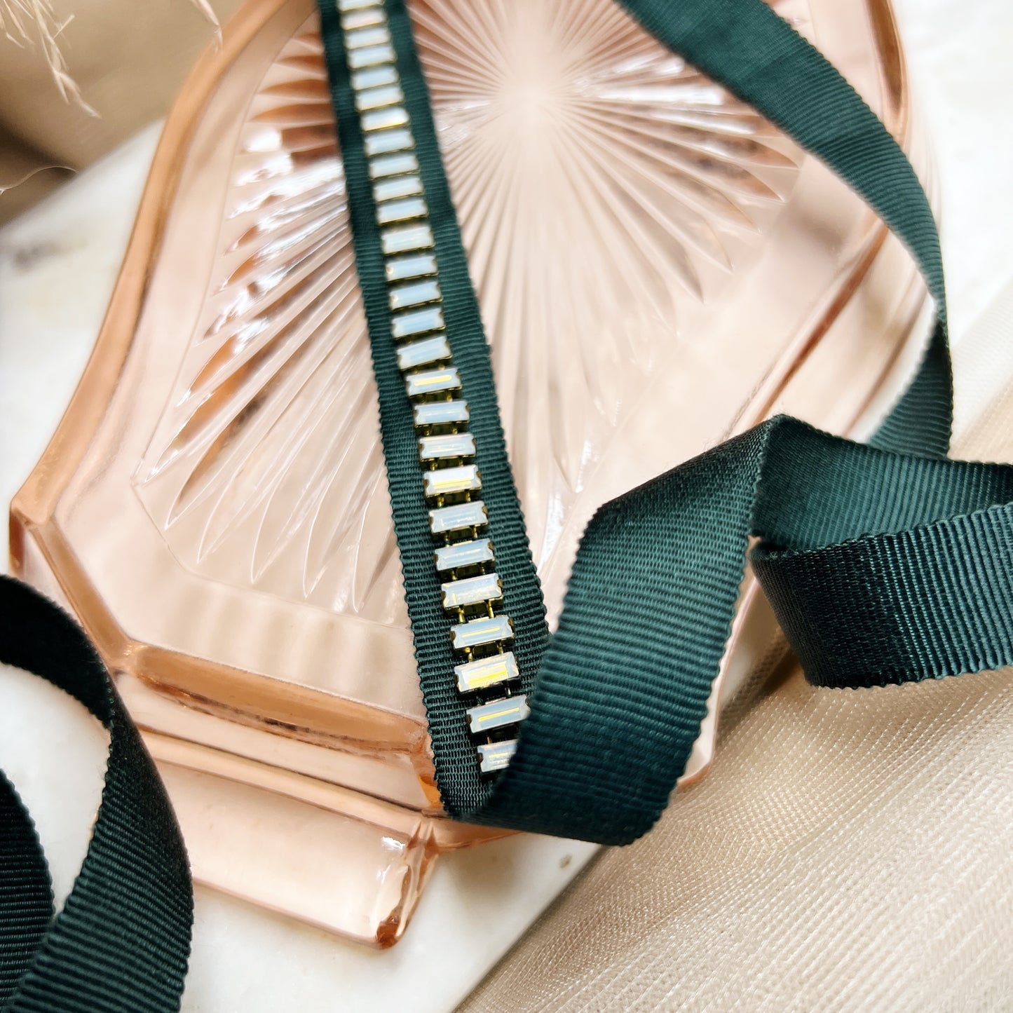 This gorgeous, handsewn necklace is made using a very rare, vintage, milky opal colored swarovski crystal baguette chain. Each necklace is one-of-a-kind and care is taken to sew each link of the crystal chain to a beautiful vintage deep green grosgrain ribbon. The Tiana necklace can be worn in multiple different ways by tying the ribbon on the front or back of your neck, but it can also be worn in your hair, around a hat, as a belt, or anywhere your heart desires! The possibilities are endless.