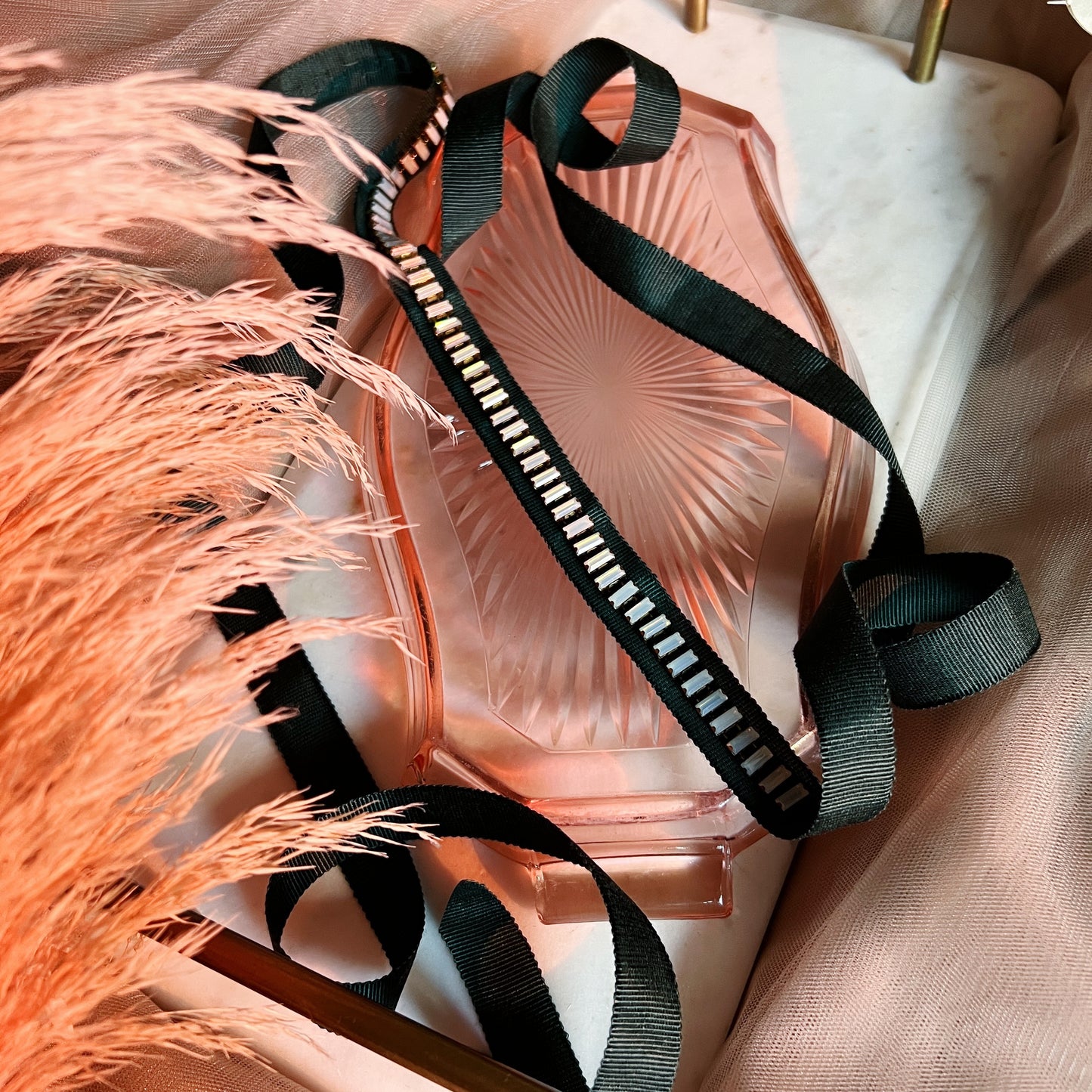 Each Lassoed Moon item is handmade with the utmost care. This handsewn item was made without the use of a machine with each link secured to the ribbon so there will be variety in the stitches. Please note: each vintage swarovski crystal chain is different and may show signs of age around the metal cups or the crystals themselves.