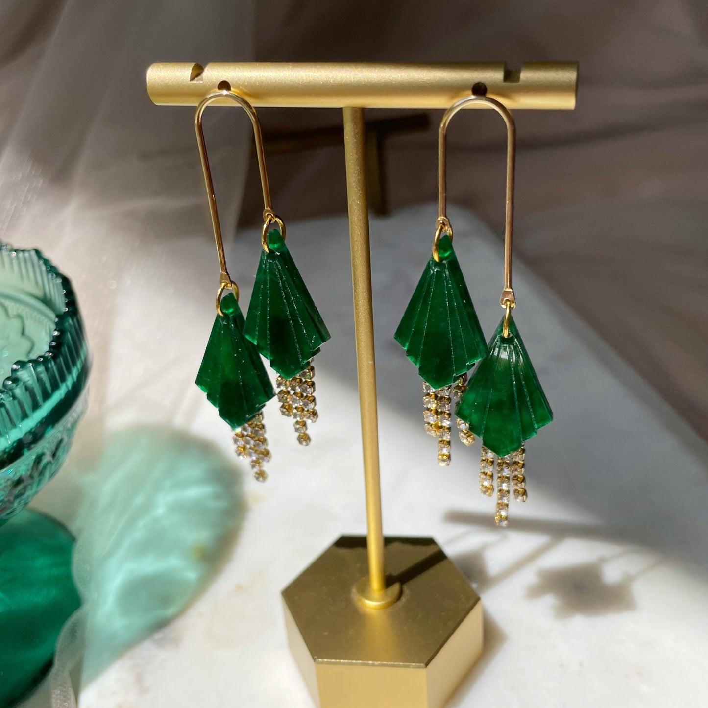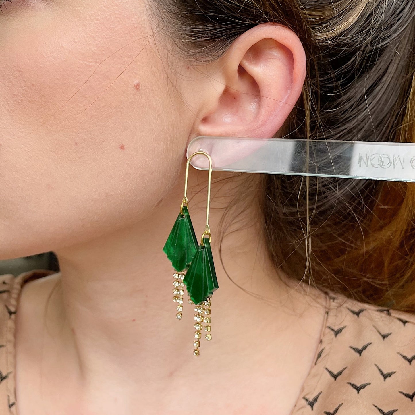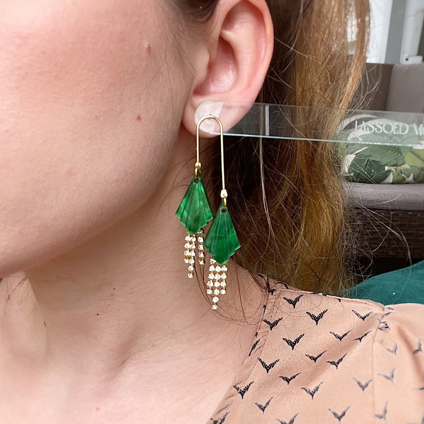 These delicate and glamorous Art Deco drop earrings make a perfect asymmetrical statement. Athena Absinthe earrings are made using pearlescent forest green acrylic and drops of gorgeous Preciosa crystals draped on a gold-plated asymmetrical arch stud with gold-plated Sterling Silver posts.