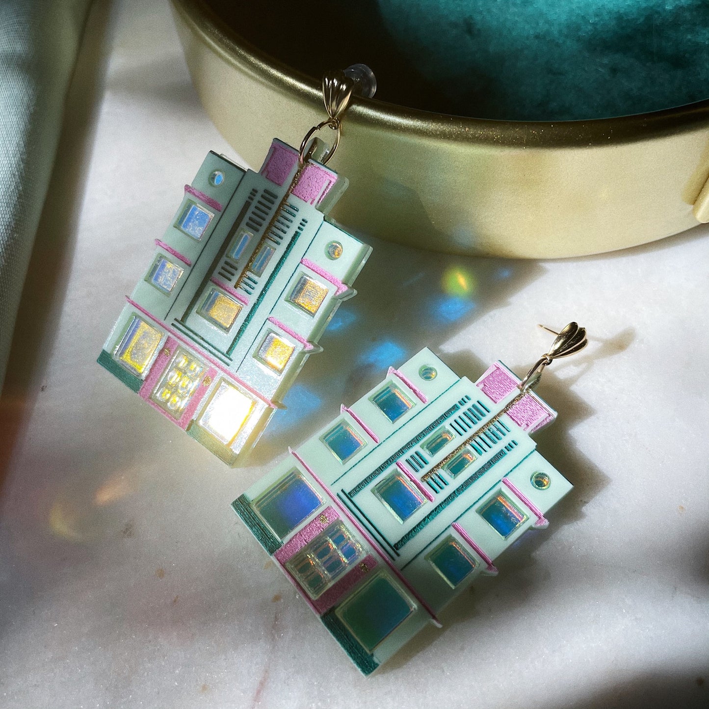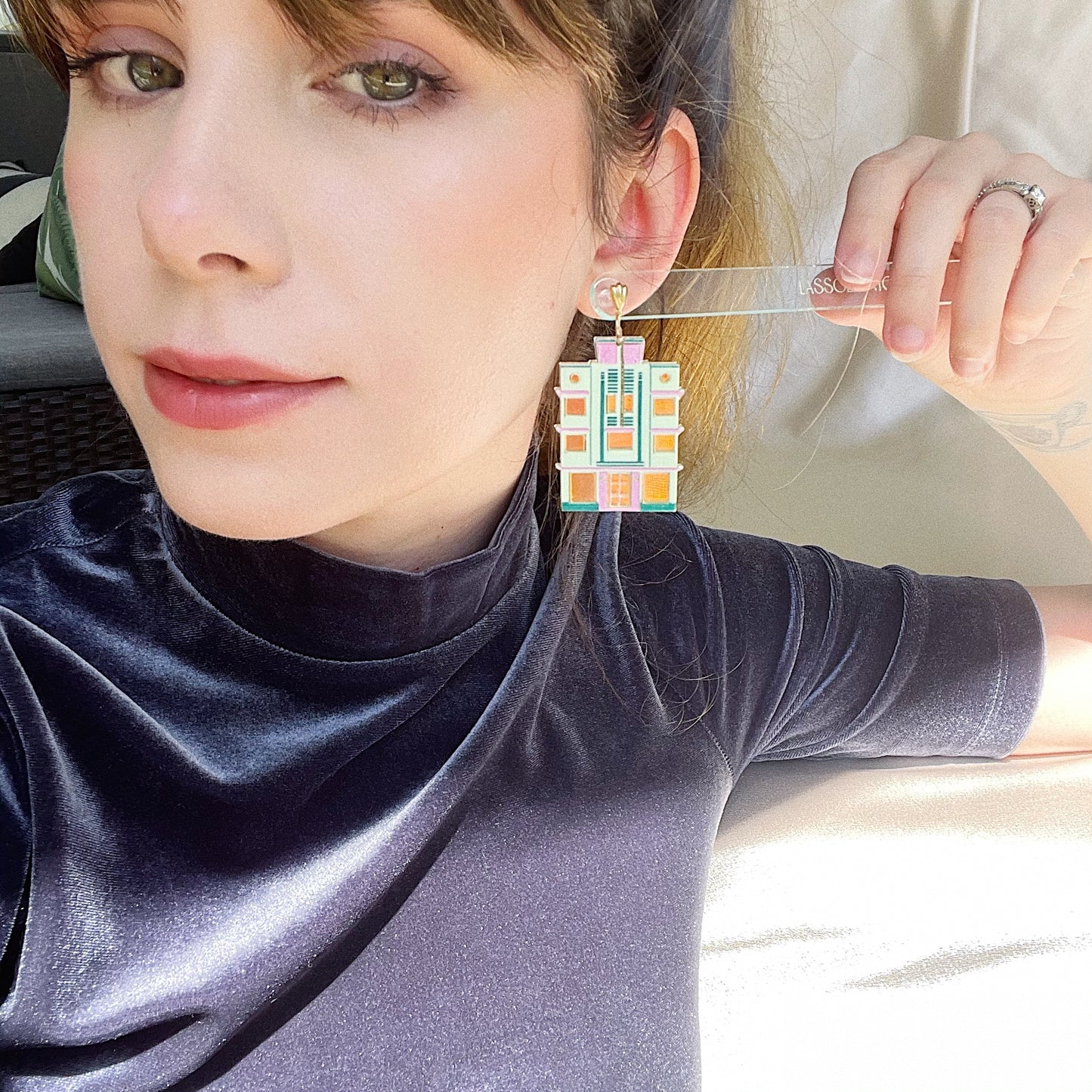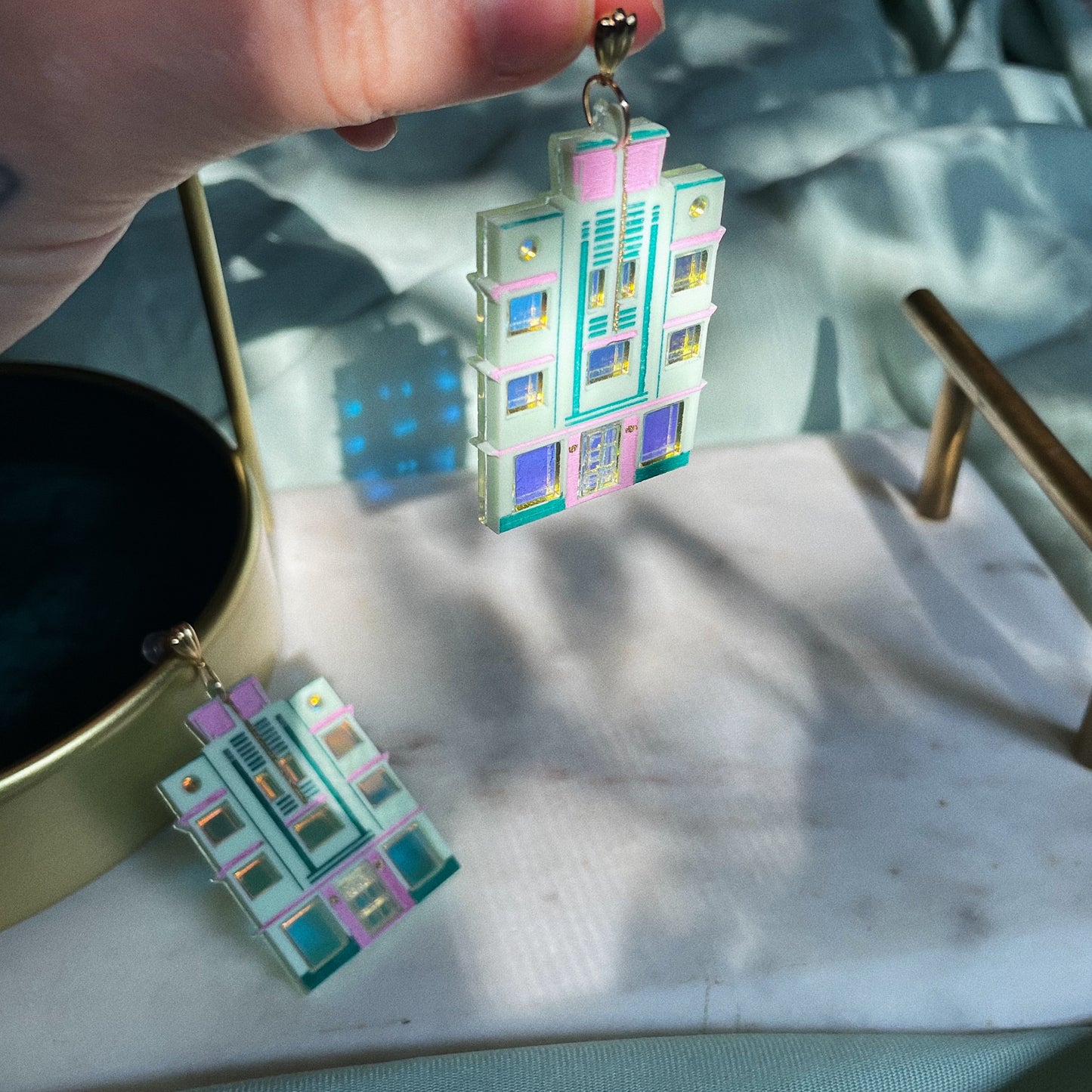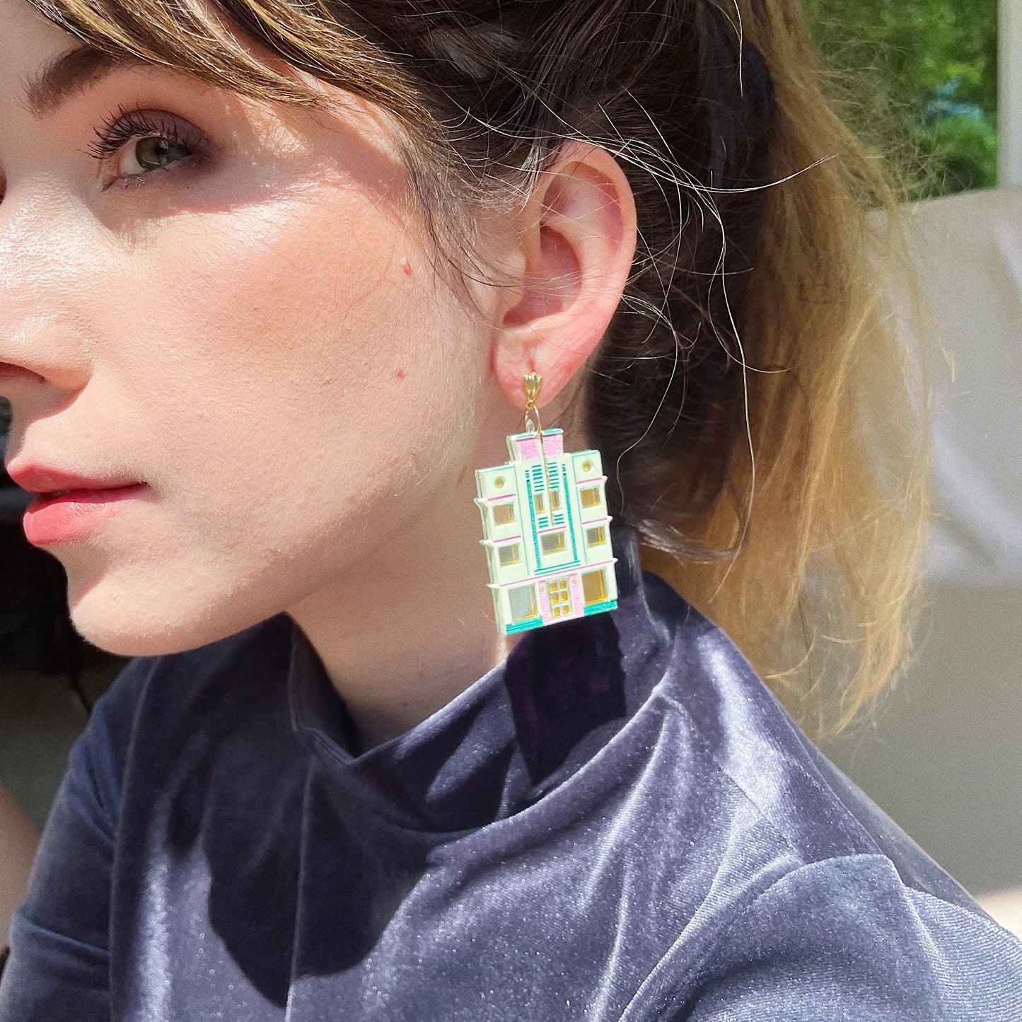 These iconic Art Deco Miami hotel inspired earrings are a unique way to add a ray of sunshine (and some fabulous architecture) to your everyday look. Miami Hotel Earrings are hand-painted, made with layers of premium acrylic (now made from matte mint green acrylic!) and stainless steel shell-shaped earring posts.