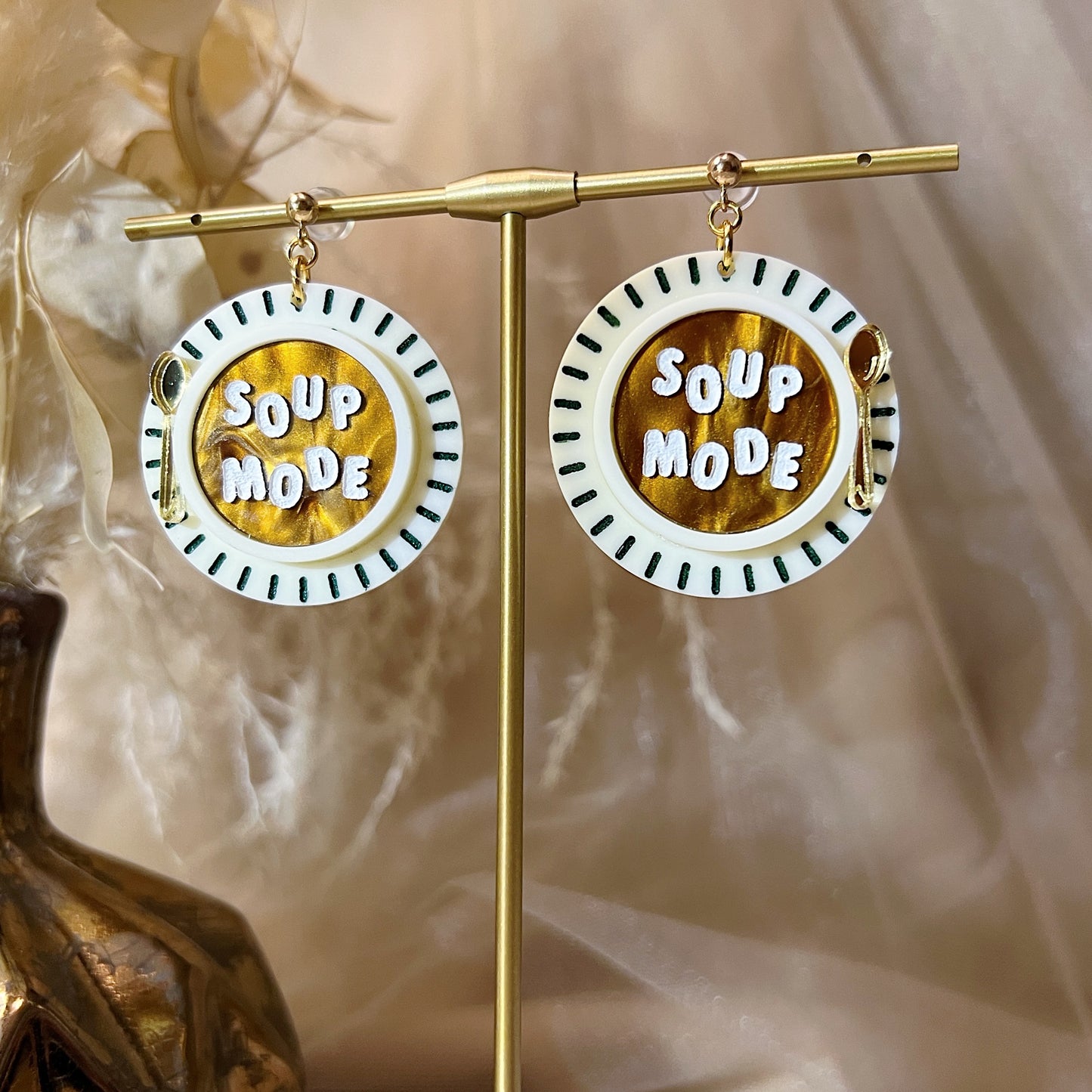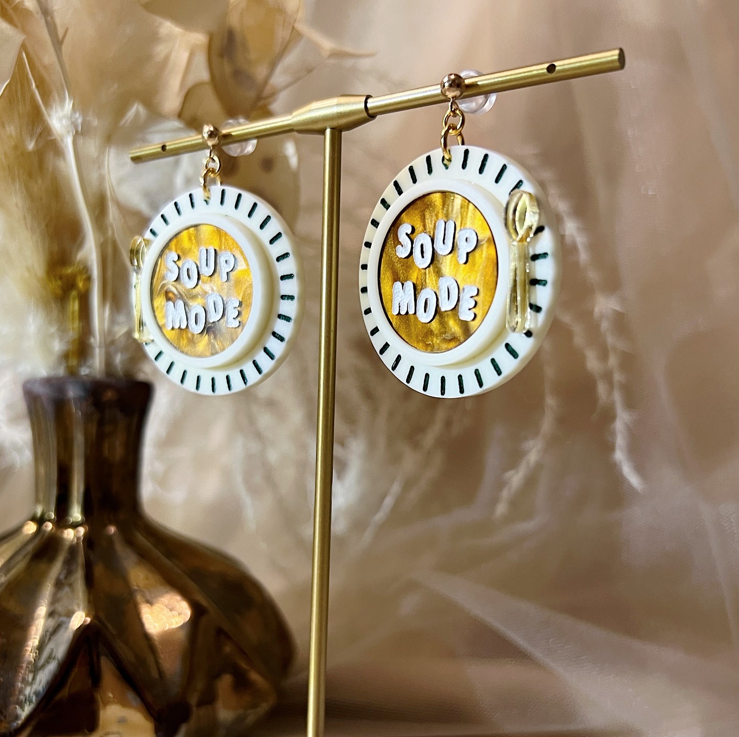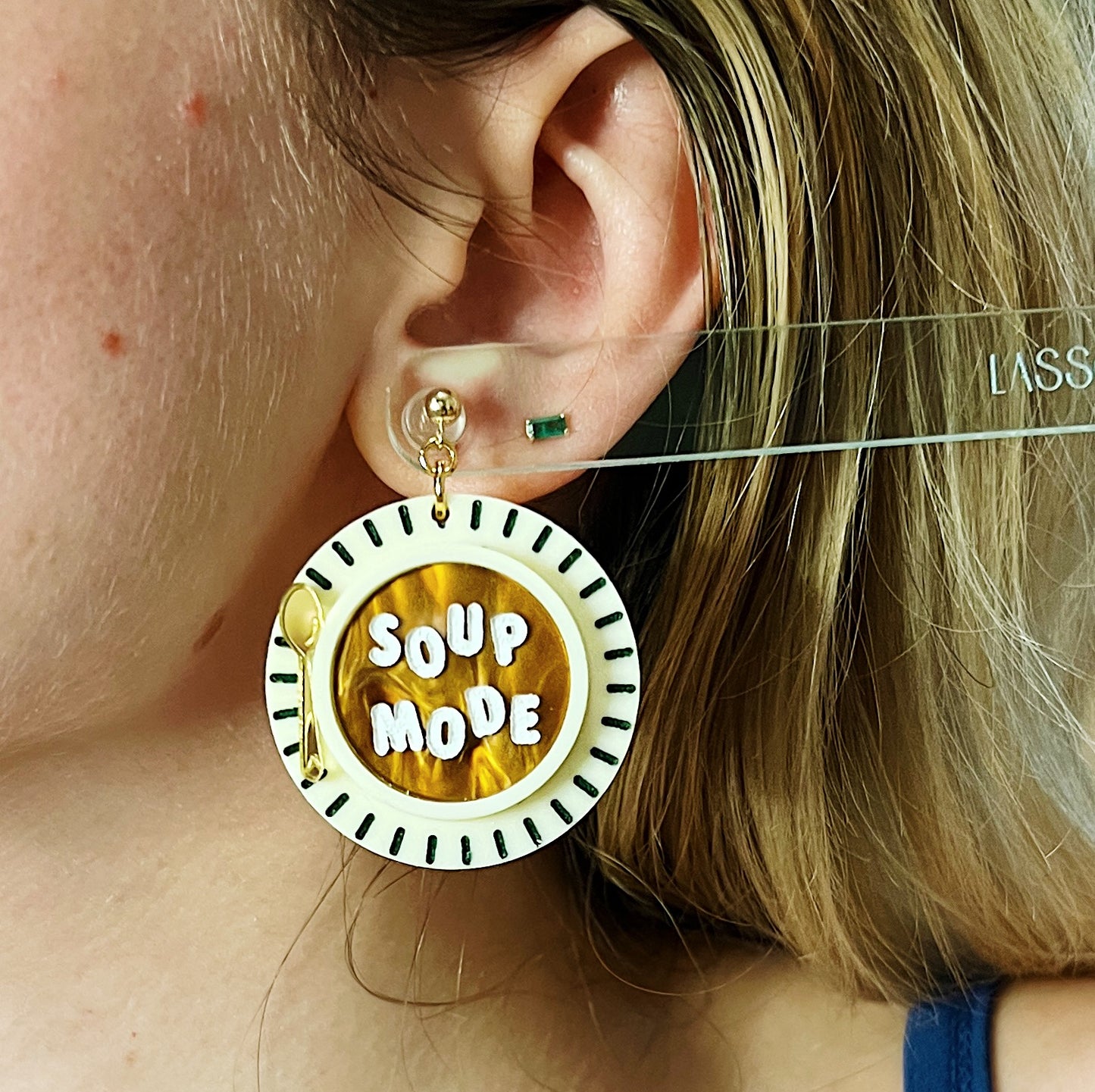 Wear these delicious looking Soup Mode earrings to let everyone know you're shifting into soup mode, or just that you're constantly in soup mode at all times. The Soup Mode earrings are made with multiple layers of laser cut, hand-painted, acrylic and 14K gold-filled ball posts.
