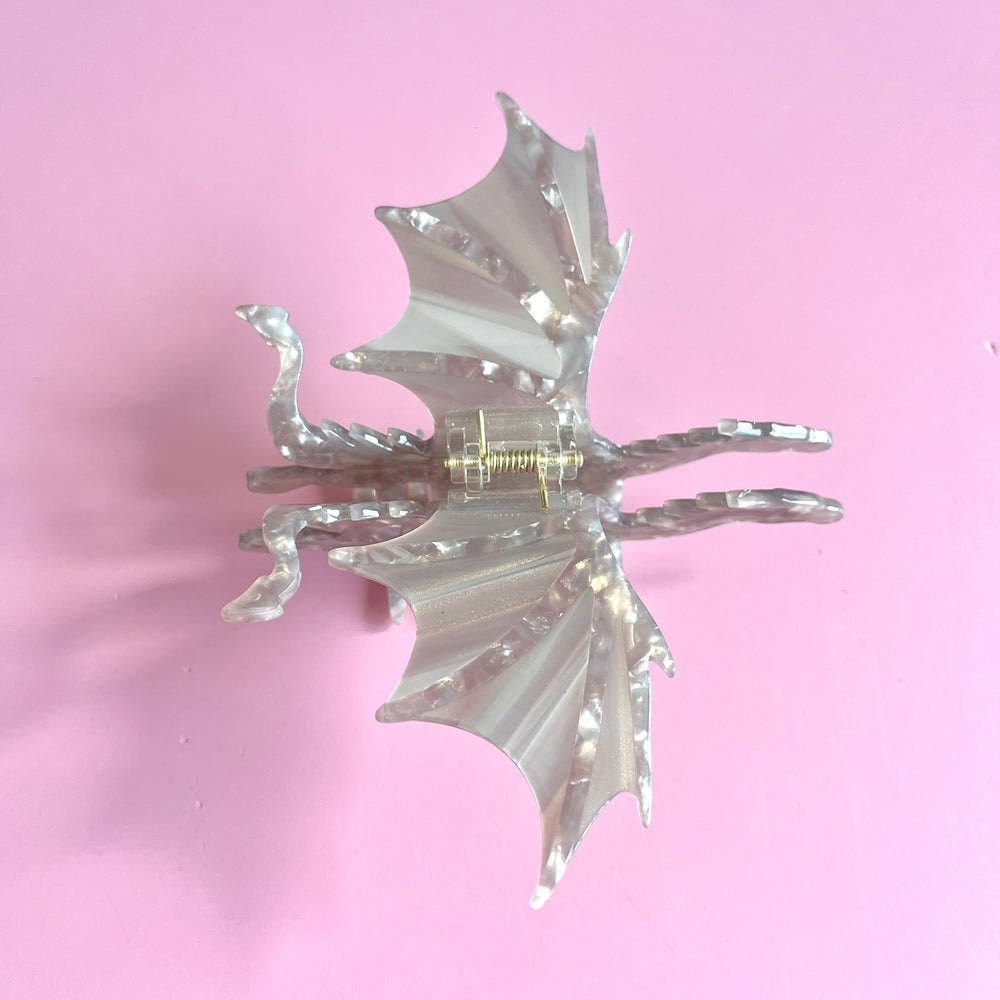 This beautiful iridescent pearl and gold dragon will fly it's way into your heart and your hair! Every day is a good hair day when a fire breathing dragon has your back. This claw clip is made to look great from the side or back with splayed wings in two shades of marbled, pearl acetete, with gold details and spiky spines down it's back and a pointed tail. This clip shows up great in darker hair and works really well for finer hair or half-up hairstyles in thicker hair.