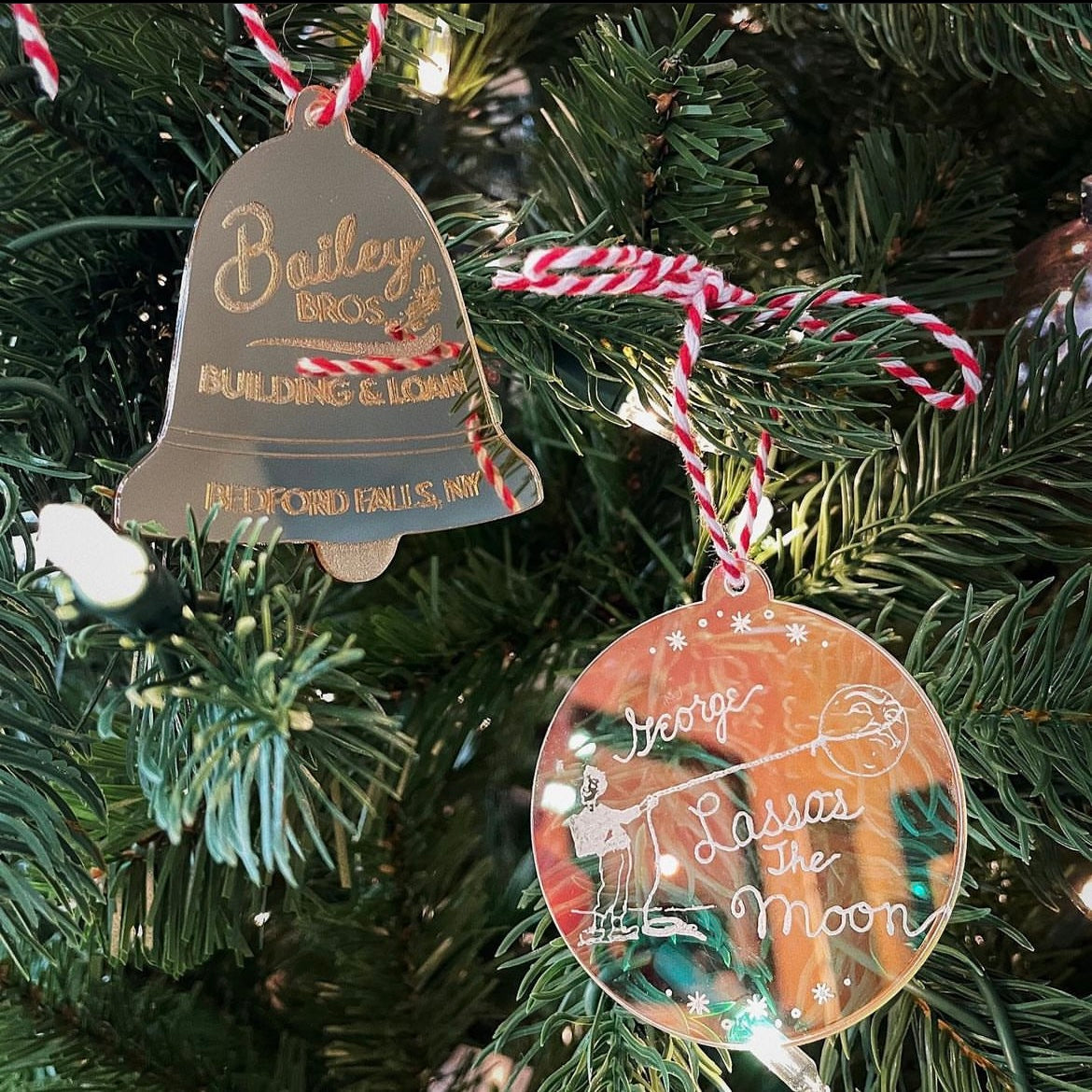 Inspired by the scene in "It's a Wonderful Life" where Lassoed Moon got its name, this beautiful iridescent ornament is sure to be a holiday favorite. Made with laser cute iridescent acrylic engraved with a drawing of George lassoing the moon this ornament hangs from a red and white twine bow. Mary Bailey approved.