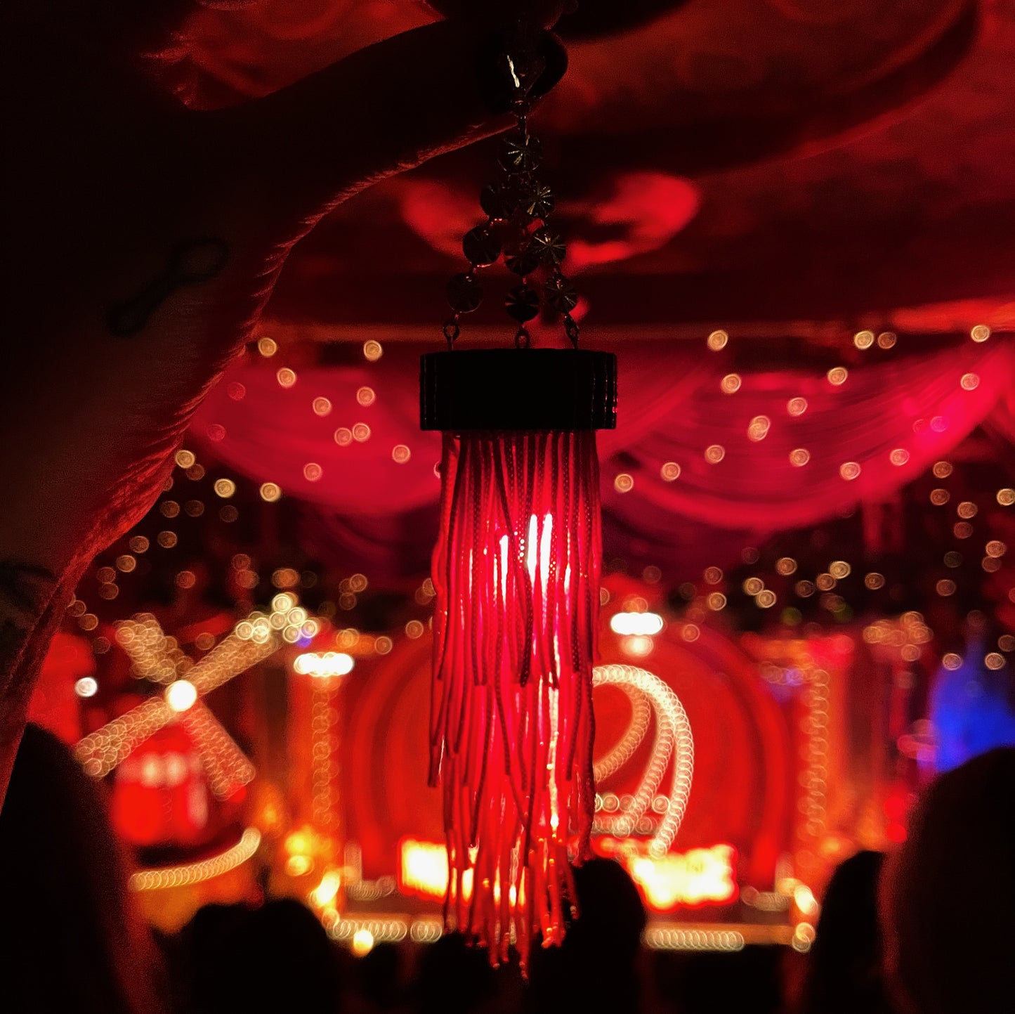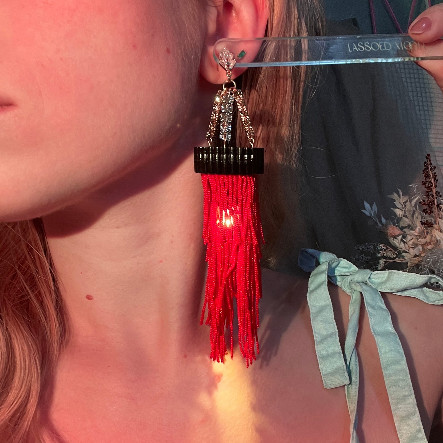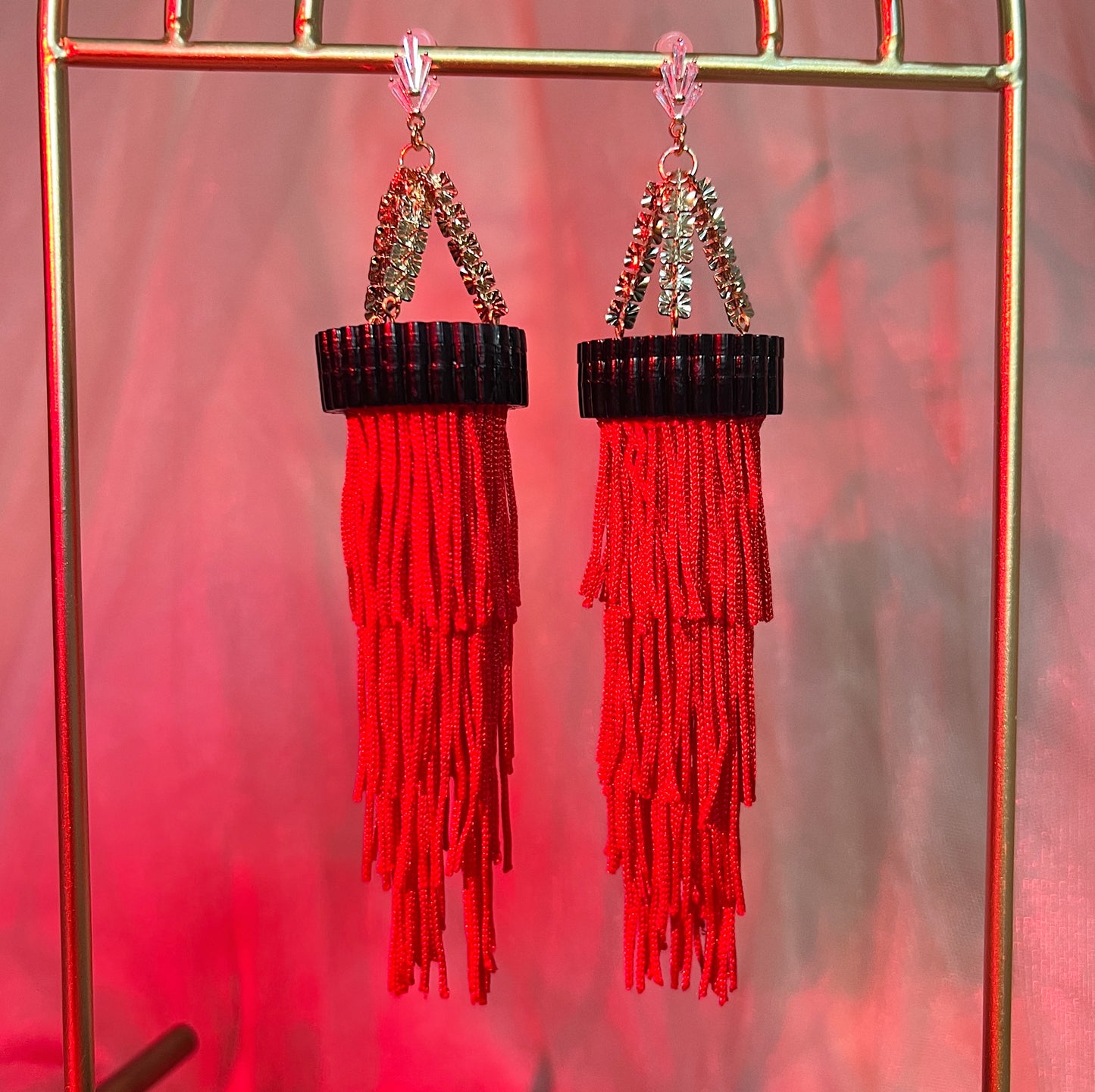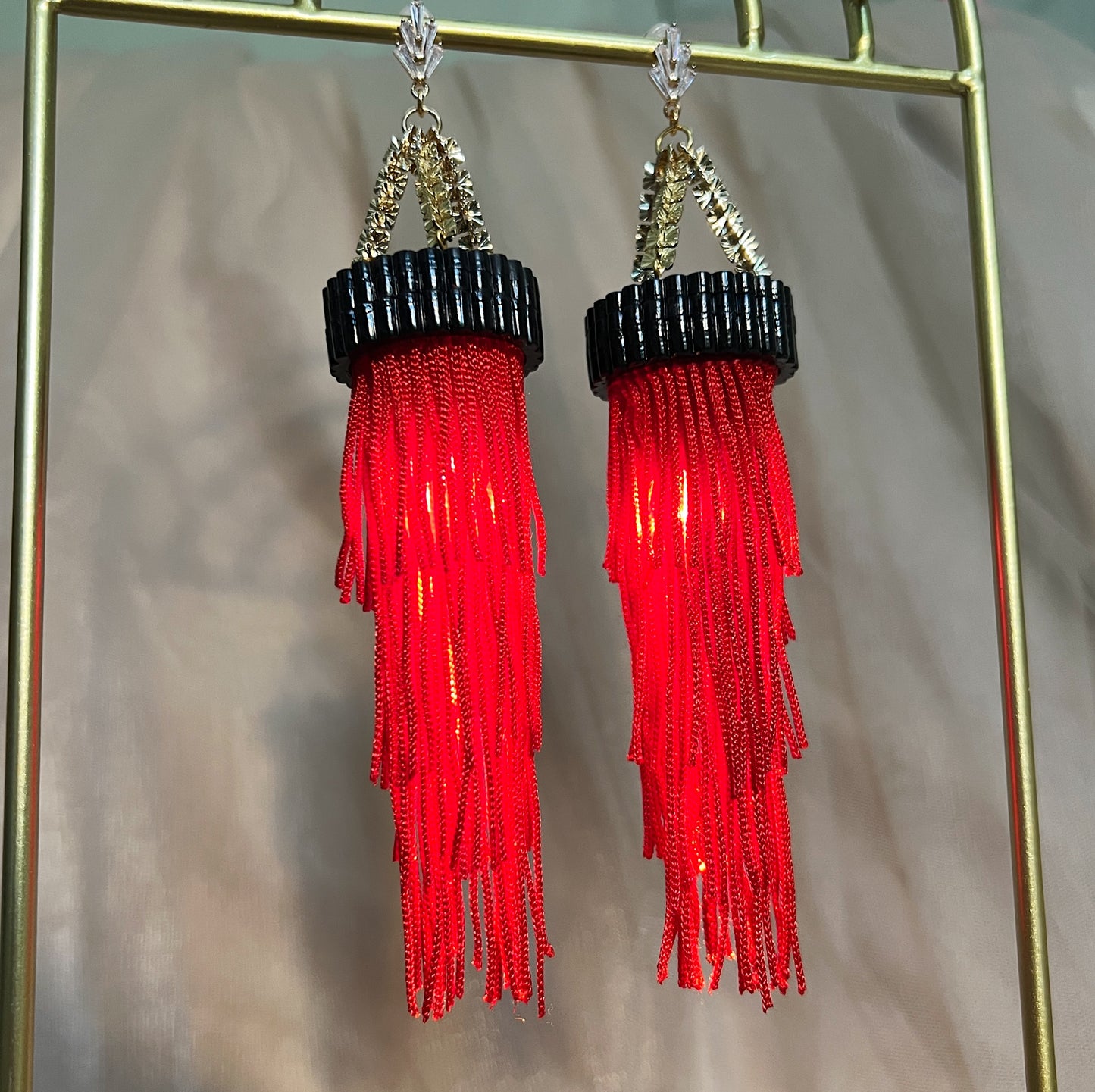 Inspired by vintage fringe lamps, each pair is made with tiered red fabric fringe attached to a black fluted acrylic top and dangling from three strands of beautiful gold-plated starburst chain, all finished with gold-plated sterling silver posts with cubic zirconia details. Inside each earring is a small LED light that can be twisted to turn on or off from underneath the fringe. Each light takes three LR41 batteries and should last through one glamorous night of continuous illumination. Six additional replacement batteries will be included with each pair of earrings. Batteries can be replaced by twisting the light from underneath the earring until it unscrews from the top revealing the battery compartment.