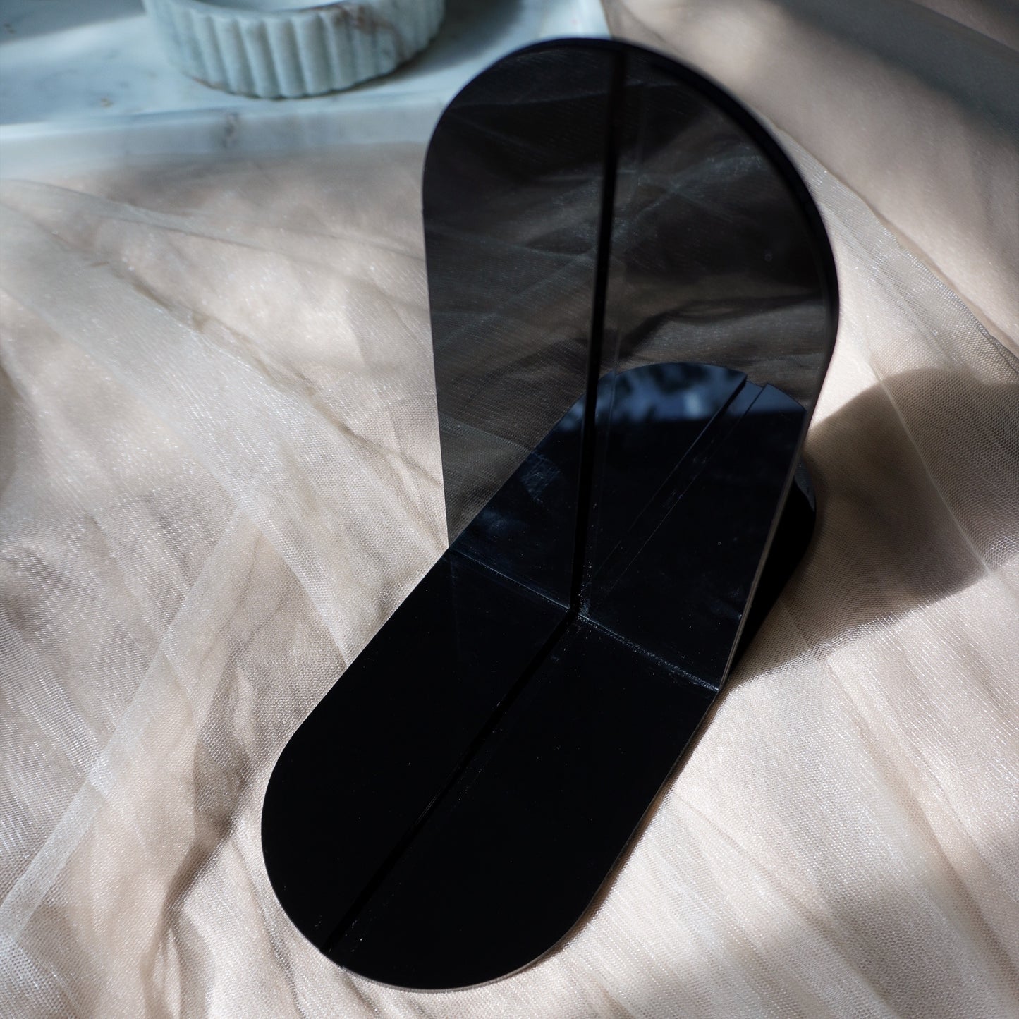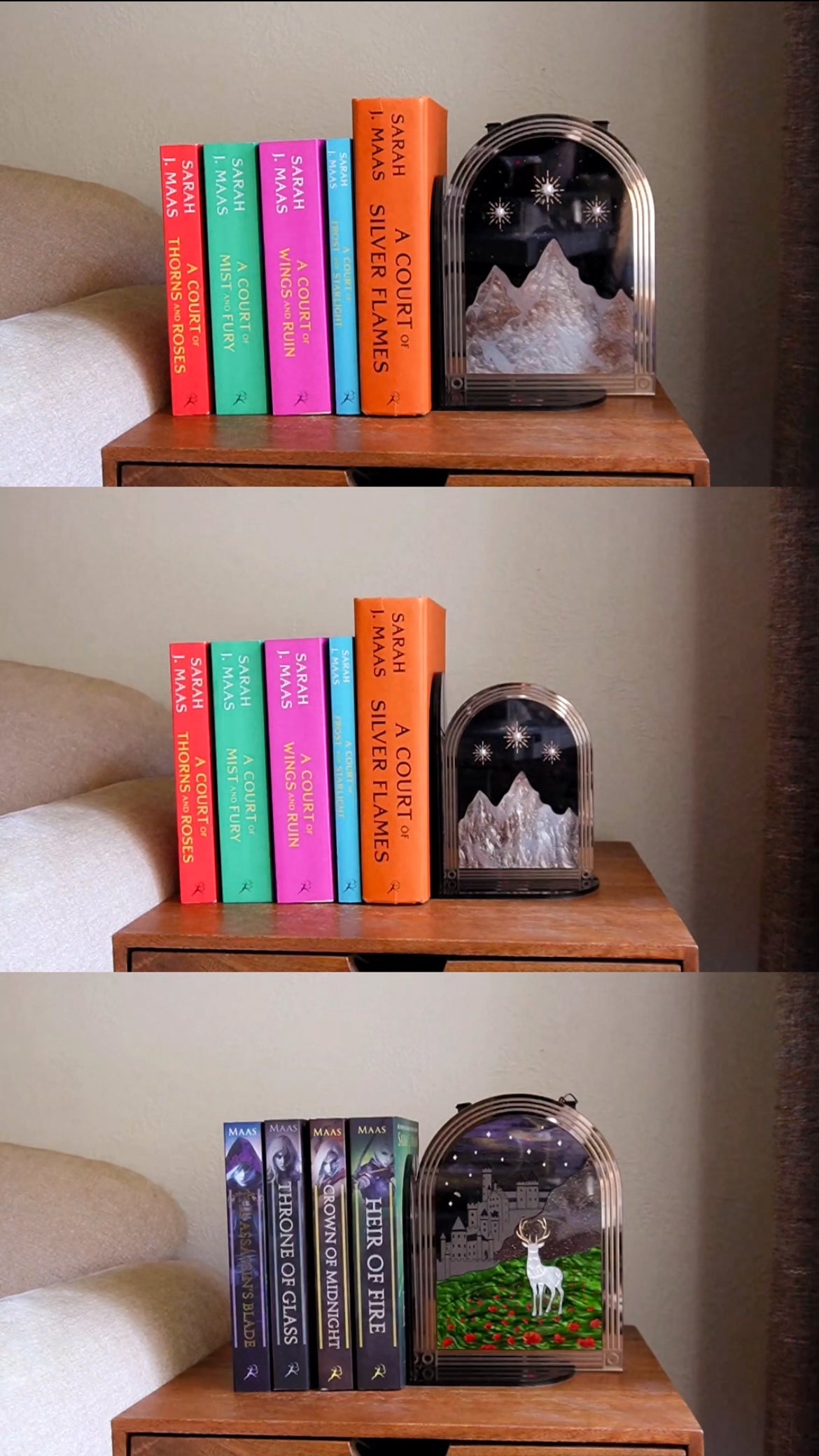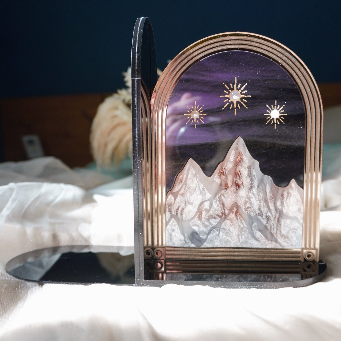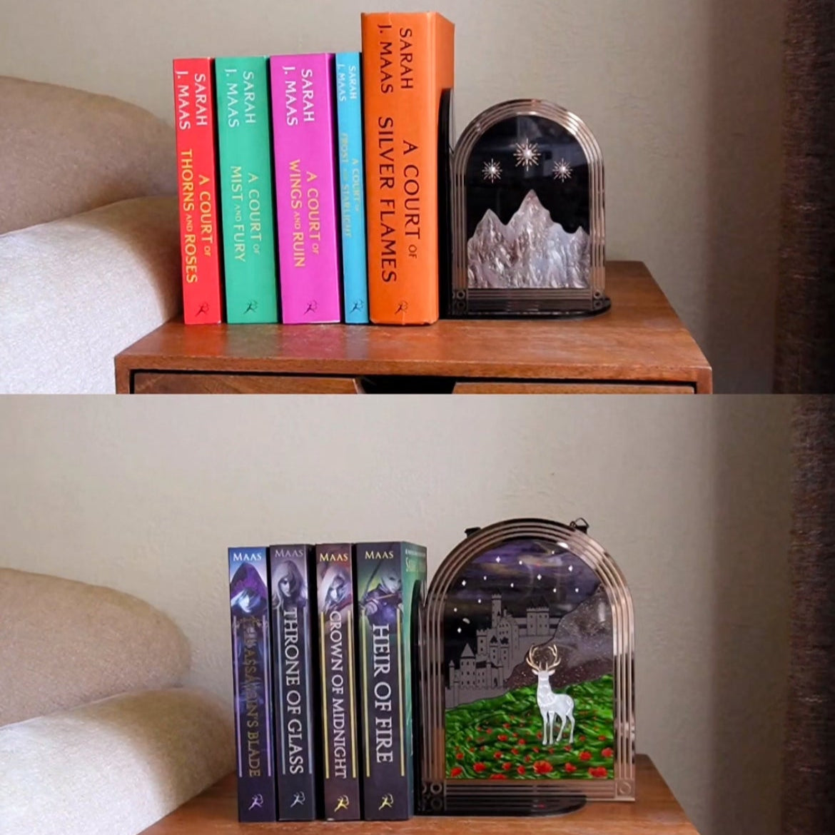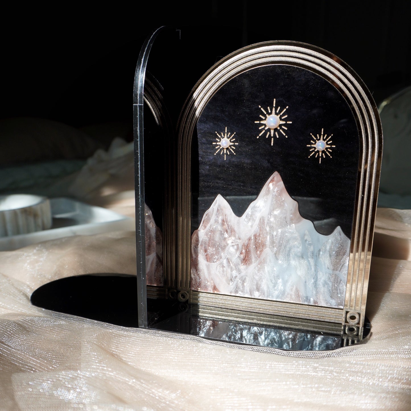 Fantasy meets function with this acrylic bookend! Add a bit of magic to your bookshelves and change your decor as often as you change your TBR by using the Brilliant Bookend to hold any of your Lassoed Moon Wall Hangings, our new Mini Portals, or anything else you'd like to feature that's under 1/4" thick! Our acrylic pieces fit snuggly into the grooves on the bottom and side of the Brilliant Bookend, and the thinner end piece slides comfortably under a stack of books to hold everything in place in style. This will arrive flat to prevent breakage, so some very simple assembly is required, but instructions will be included in your package. No tools needed.