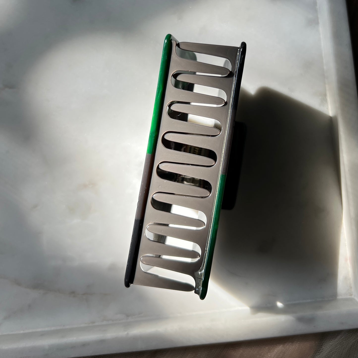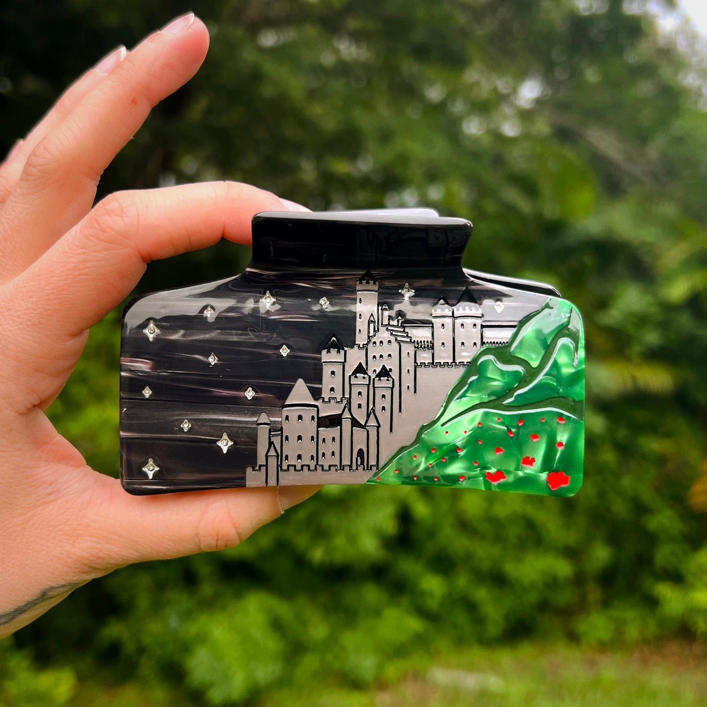 A claw clip fit for a queen, or a young princess in a land long since burned to ash, who loves her kingdom very much! Every day is a good hair day when you wear this acetate claw clip featuring various shades of acetate and hand-painted details portraying a beautiful detailed castle, mountainscape, a field of red kingsflame flowers, and finished with 13 stars in the sky each set with a small crystal. Includes a free reusable green velvet carrying pouch.