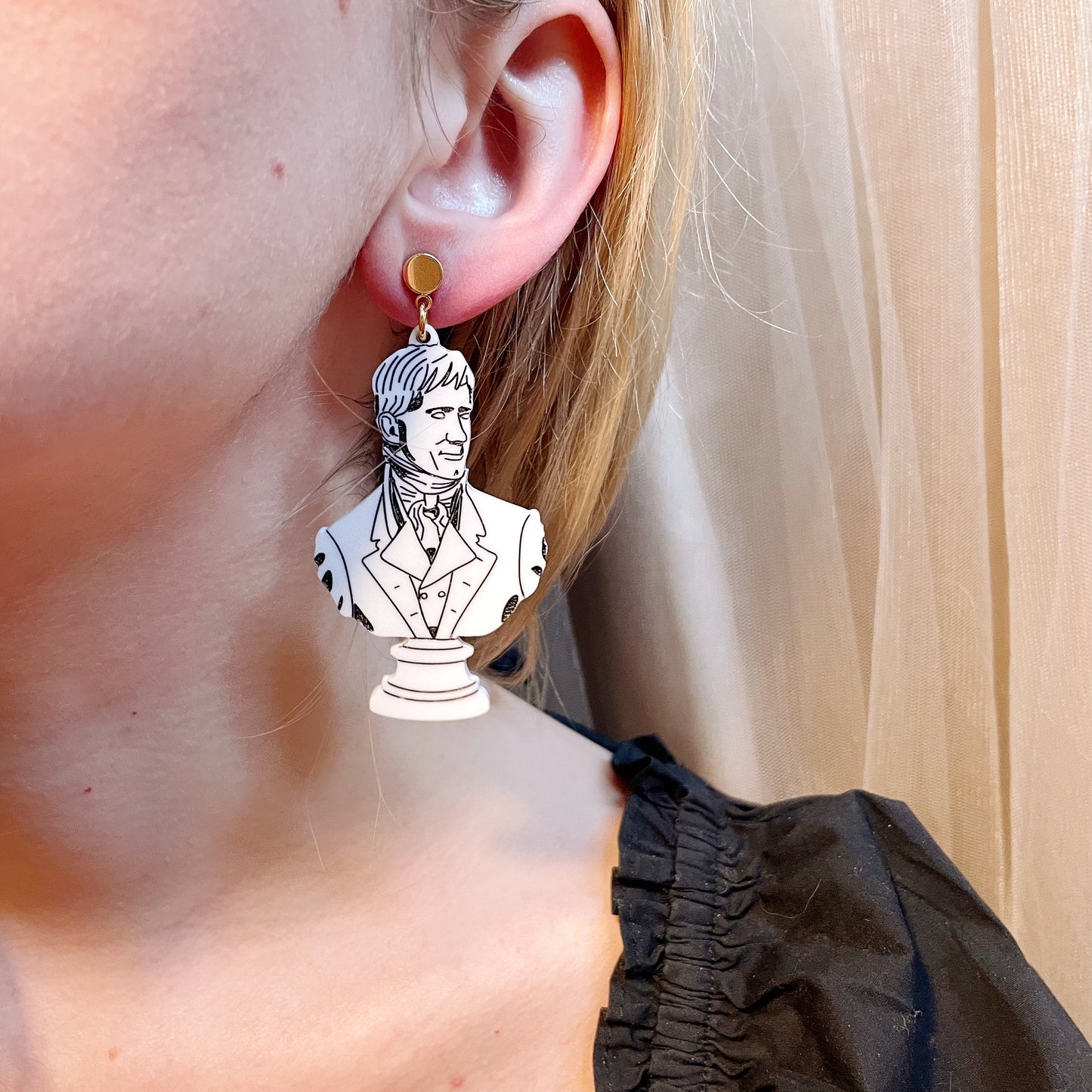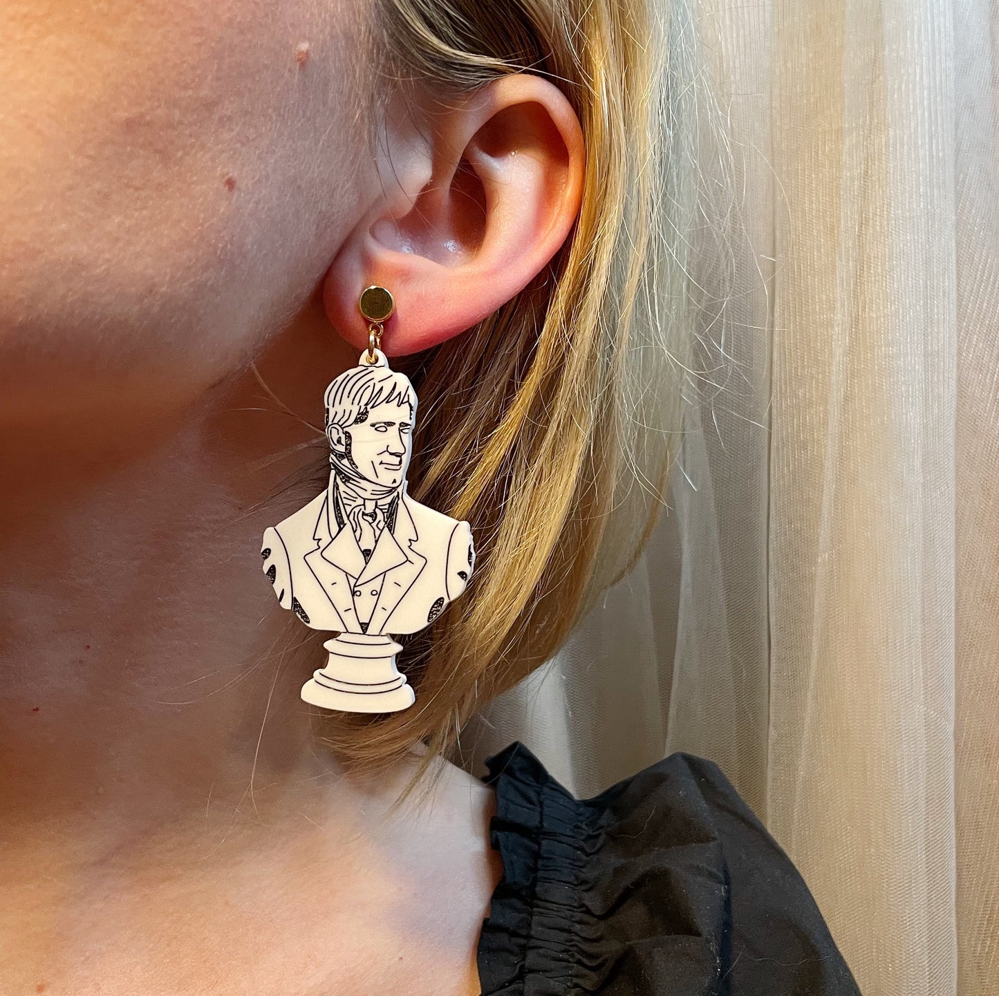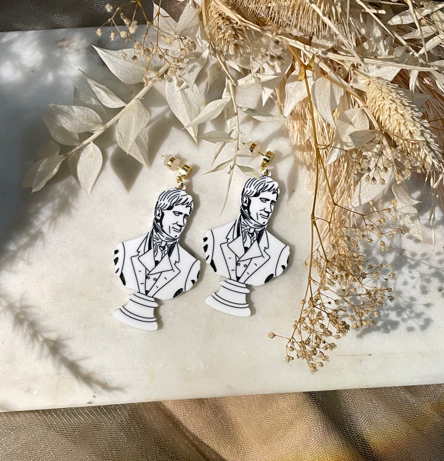 Handsome earrings that you'll love, most ardently and wish from this day forth to never be parted from. Perfect for those who have a habit of bewitching bodies and souls. Each pair is printed on white acrylic from hand drawn artwork and hand painted before being assembled with 18K gold-plated posts.