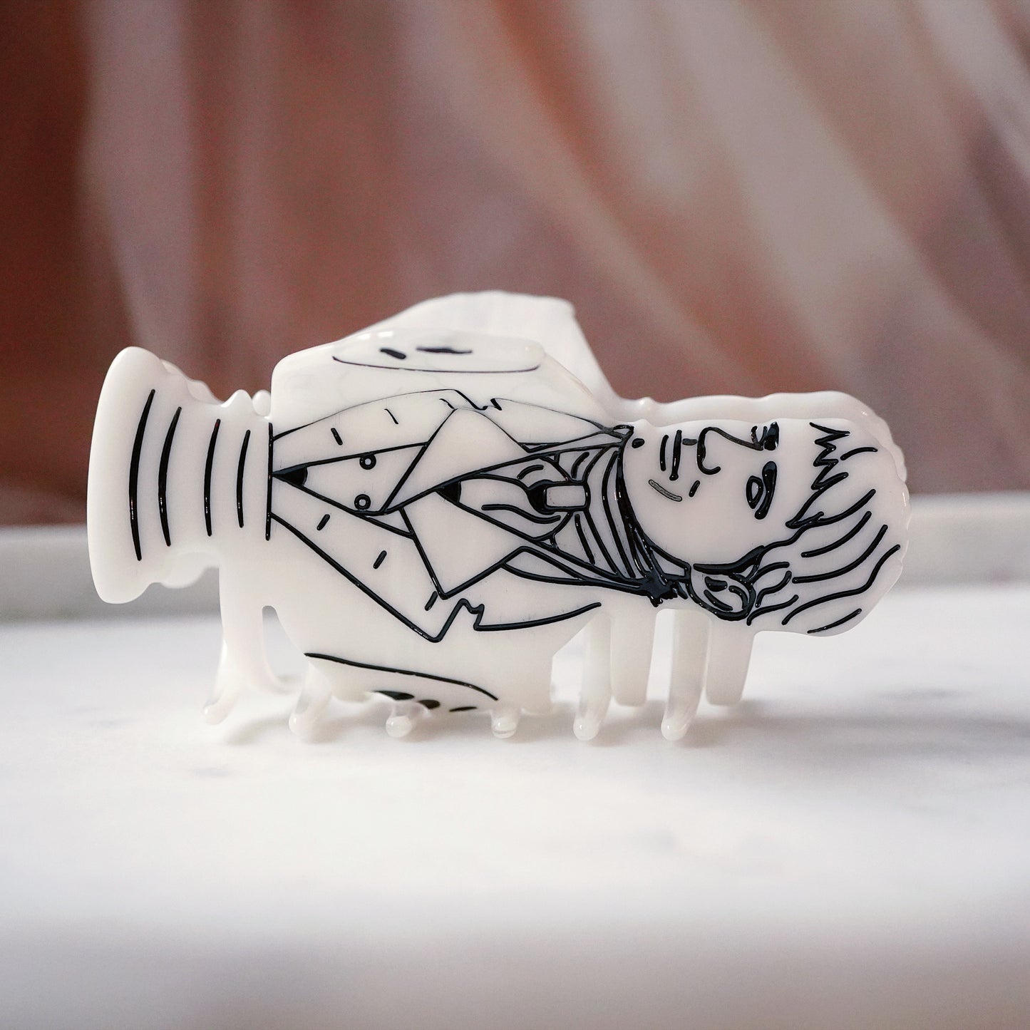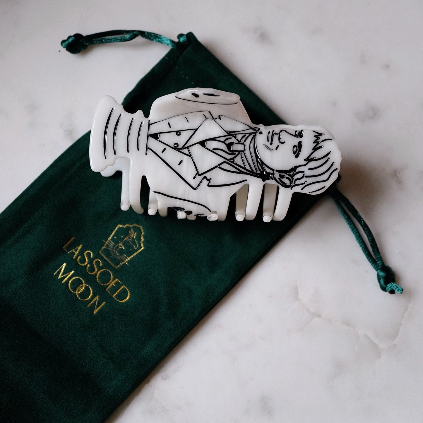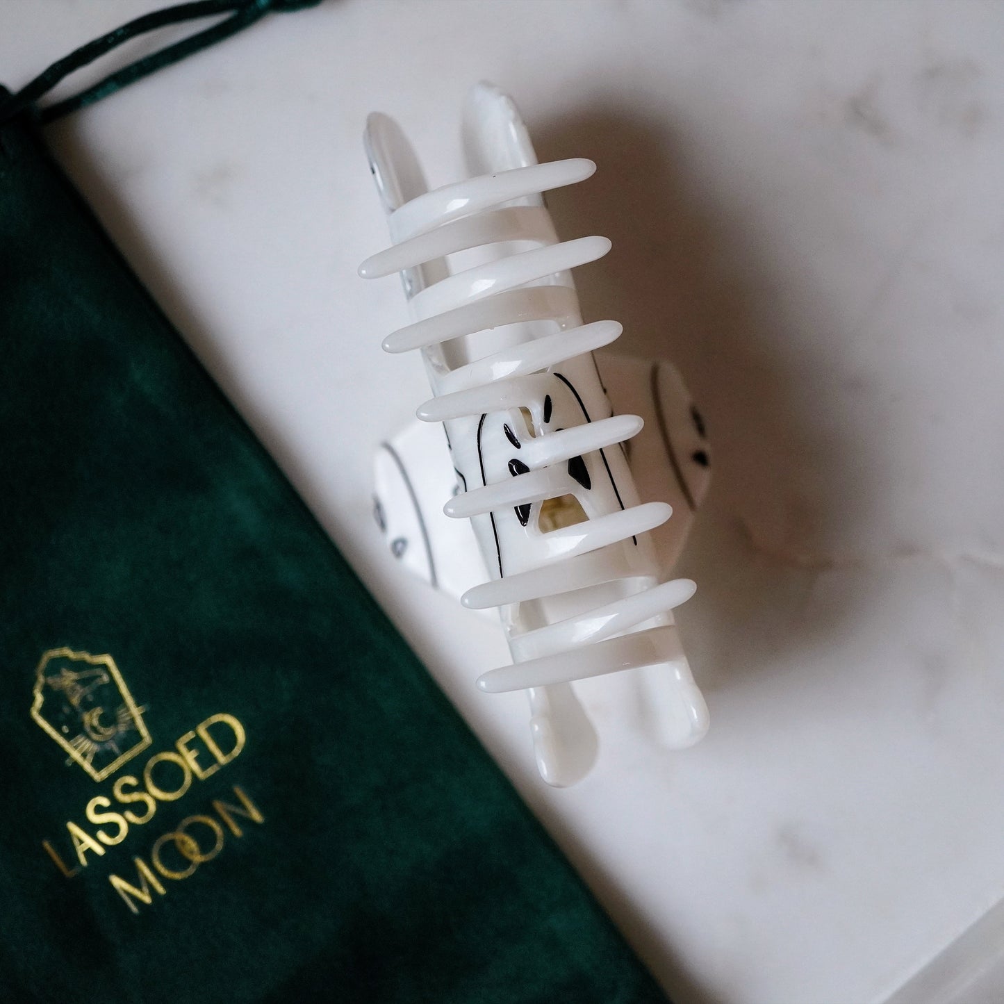 A handsome claw clip that you'll love, most ardently, and wish from this day forth to never be parted from. Perfect for those who have a habit of bewitching bodies and souls. Each claw clip is made with a marbled white acetate and black painted details. Includes a free reusable green velvet carrying pouch.