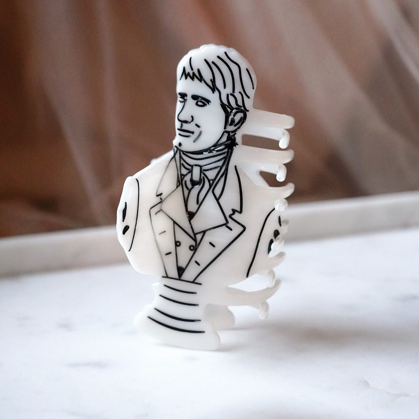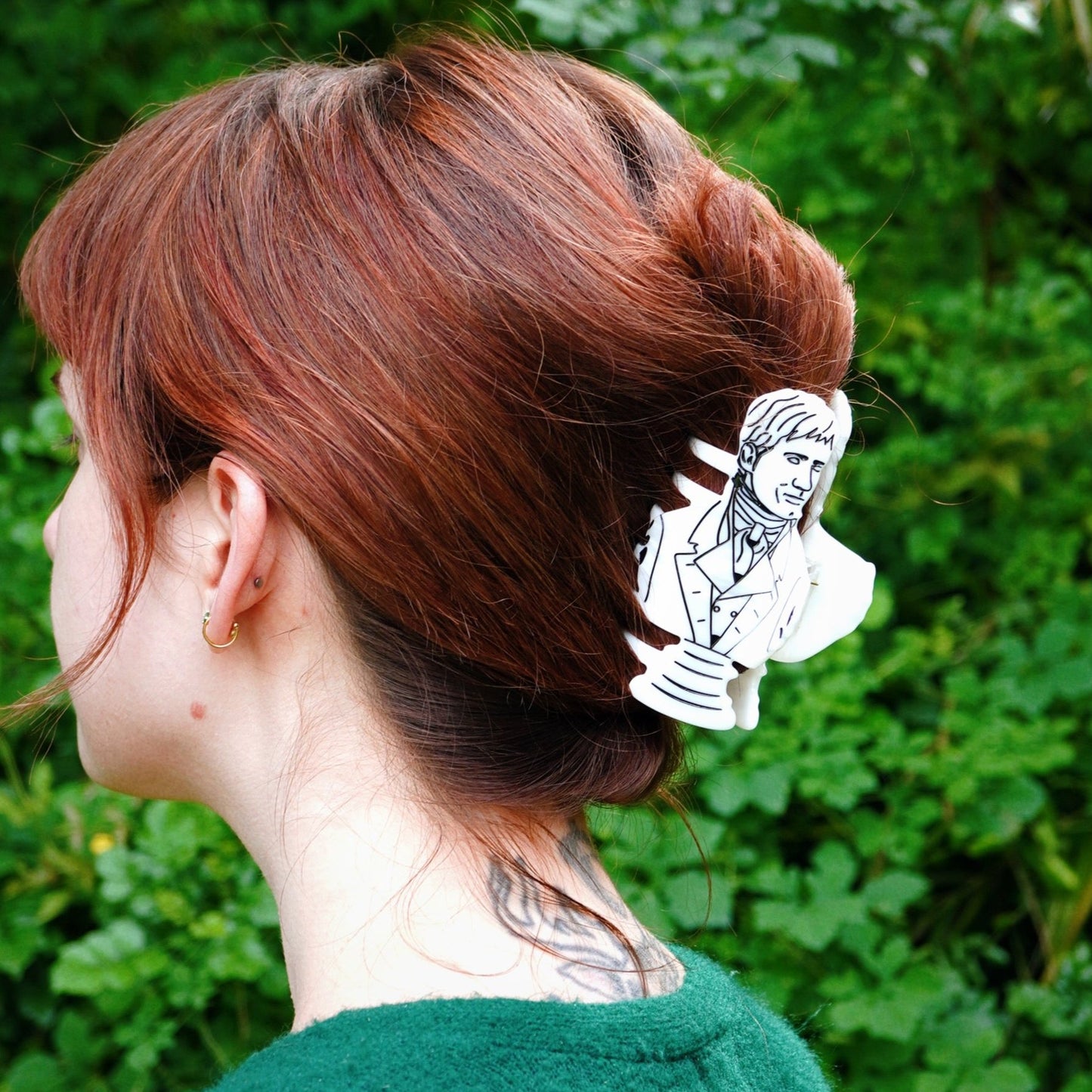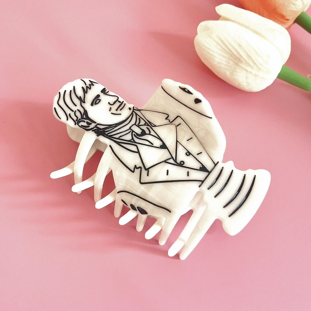 A handsome claw clip that you'll love, most ardently, and wish from this day forth to never be parted from. Perfect for those who have a habit of bewitching bodies and souls. Each claw clip is made with a marbled white acetate and black painted details. Includes a free reusable green velvet carrying pouch.