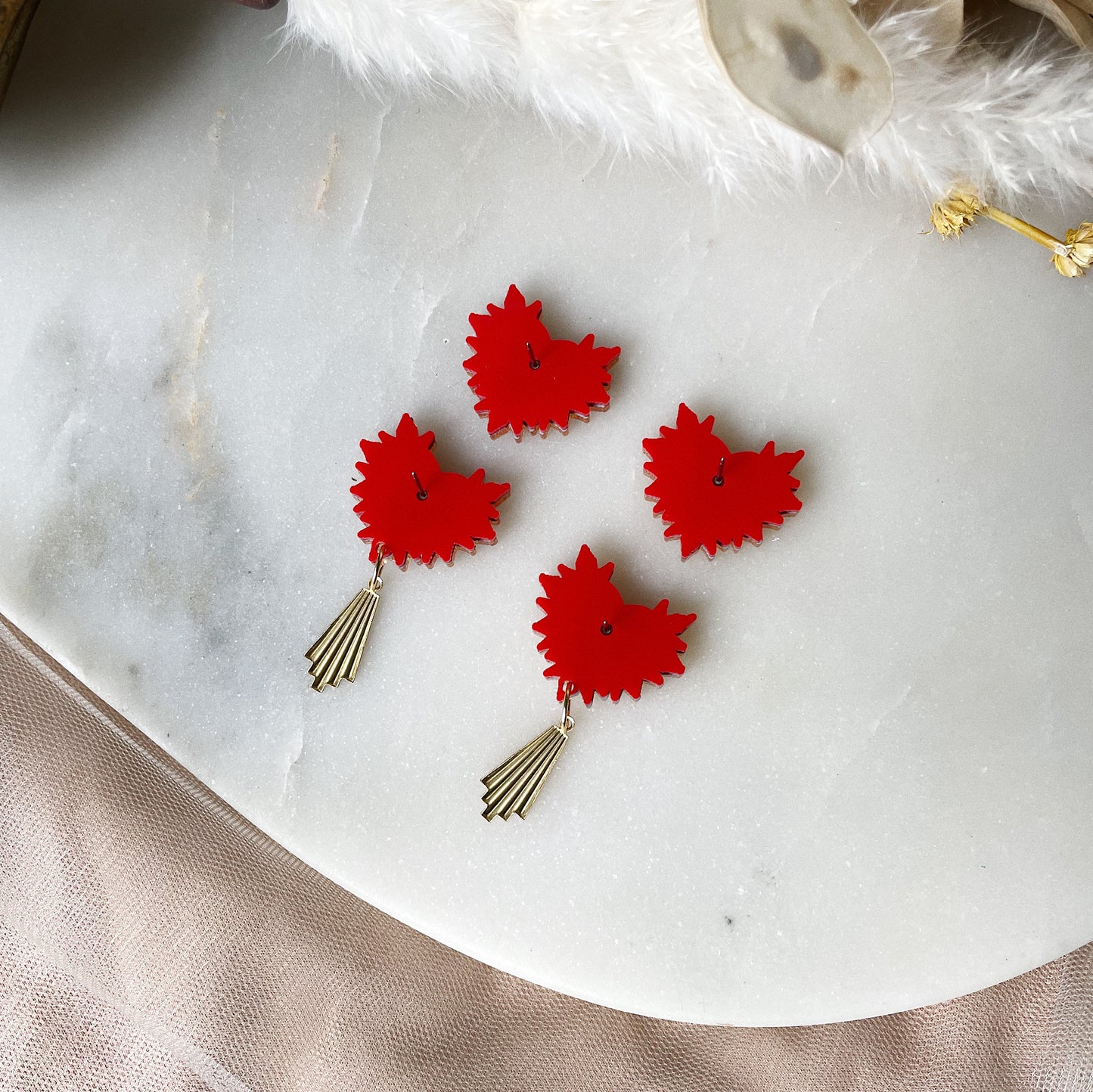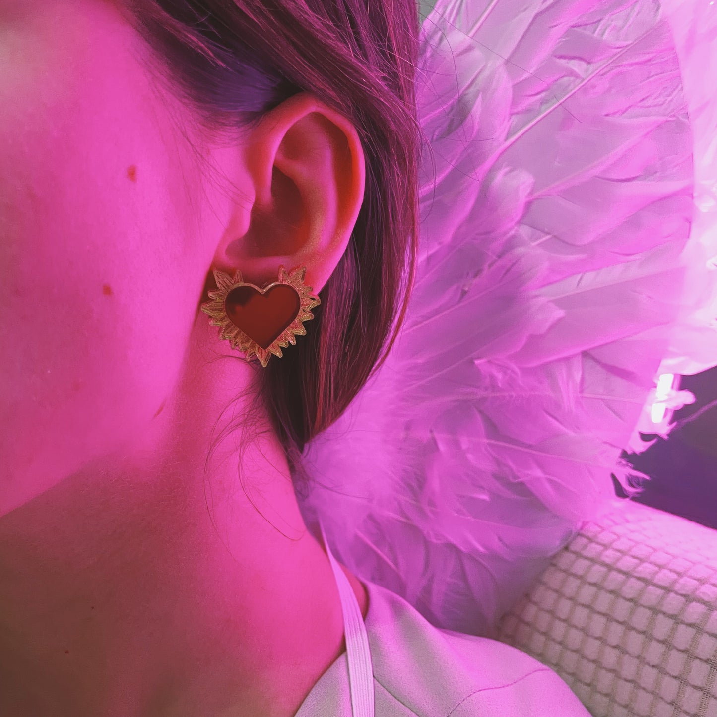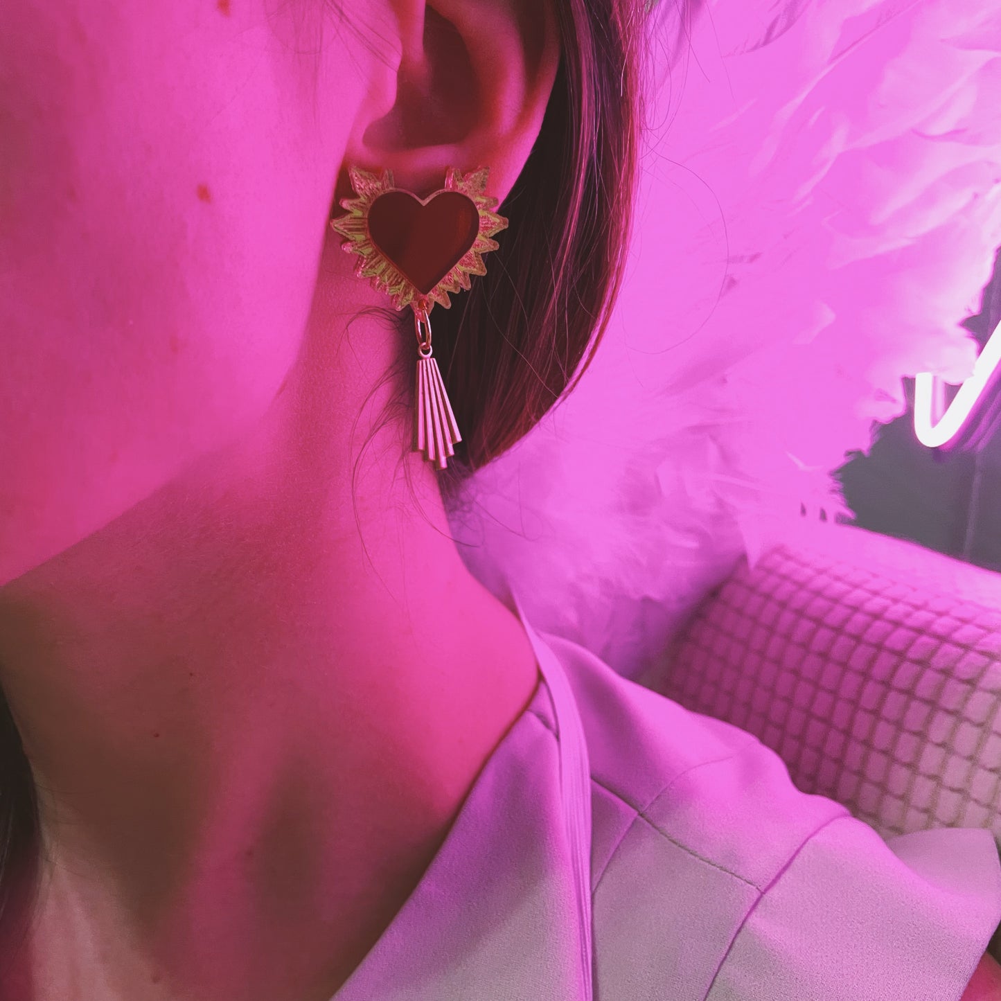 Wear your heart on your ears with these gorgeous sacred heart studs in two styles! The Montague Stud earrings are made using premium laser cut gold and red mirror acrylic layered on a base of red acrylic that embeds the hypoallergenic titanium posts for a clean look and comfort. These studs are offered with or without a brass art deco fan dangle.