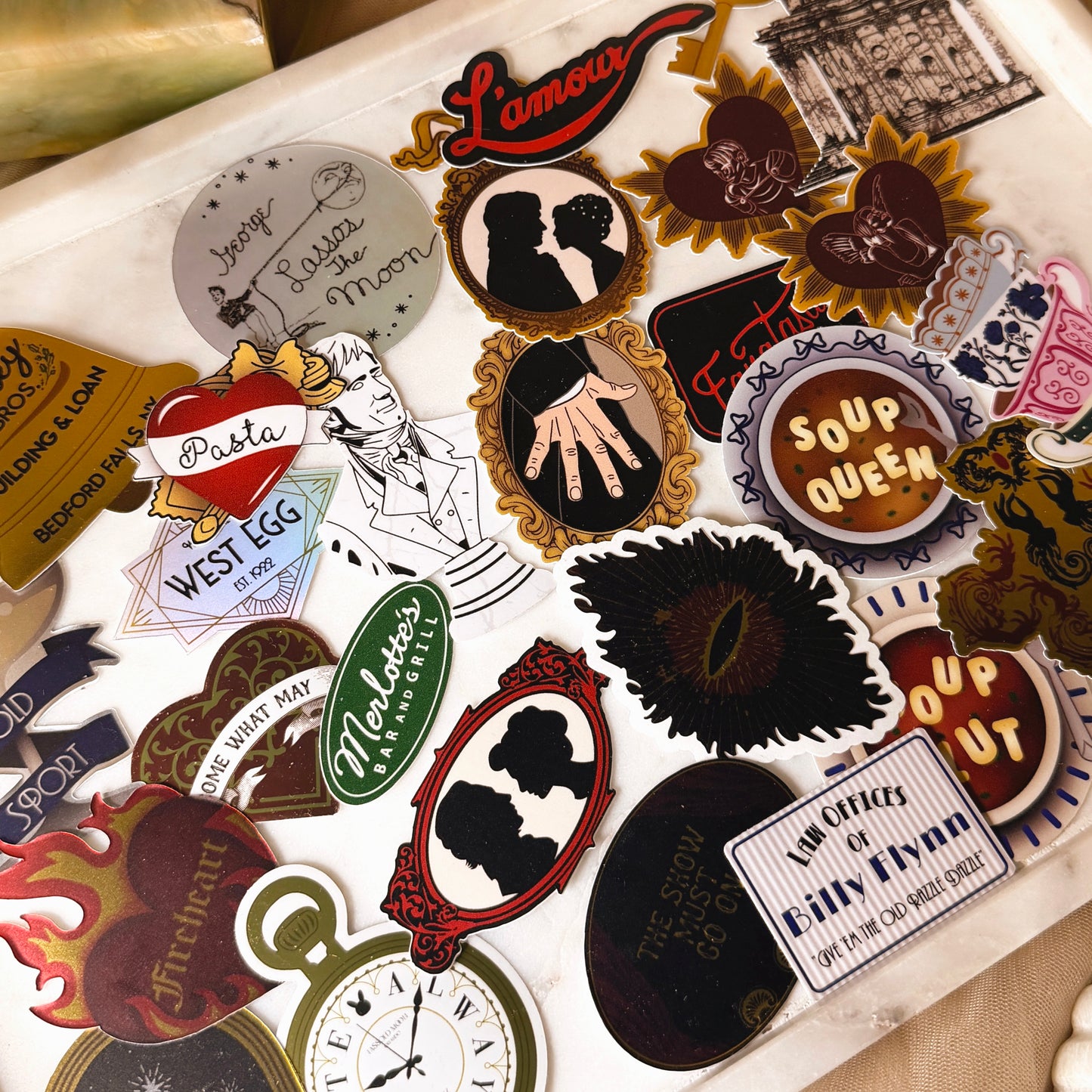 Hand holding a 'Lassoed Moon' Book Club bookmark with decorative background of small figurines.