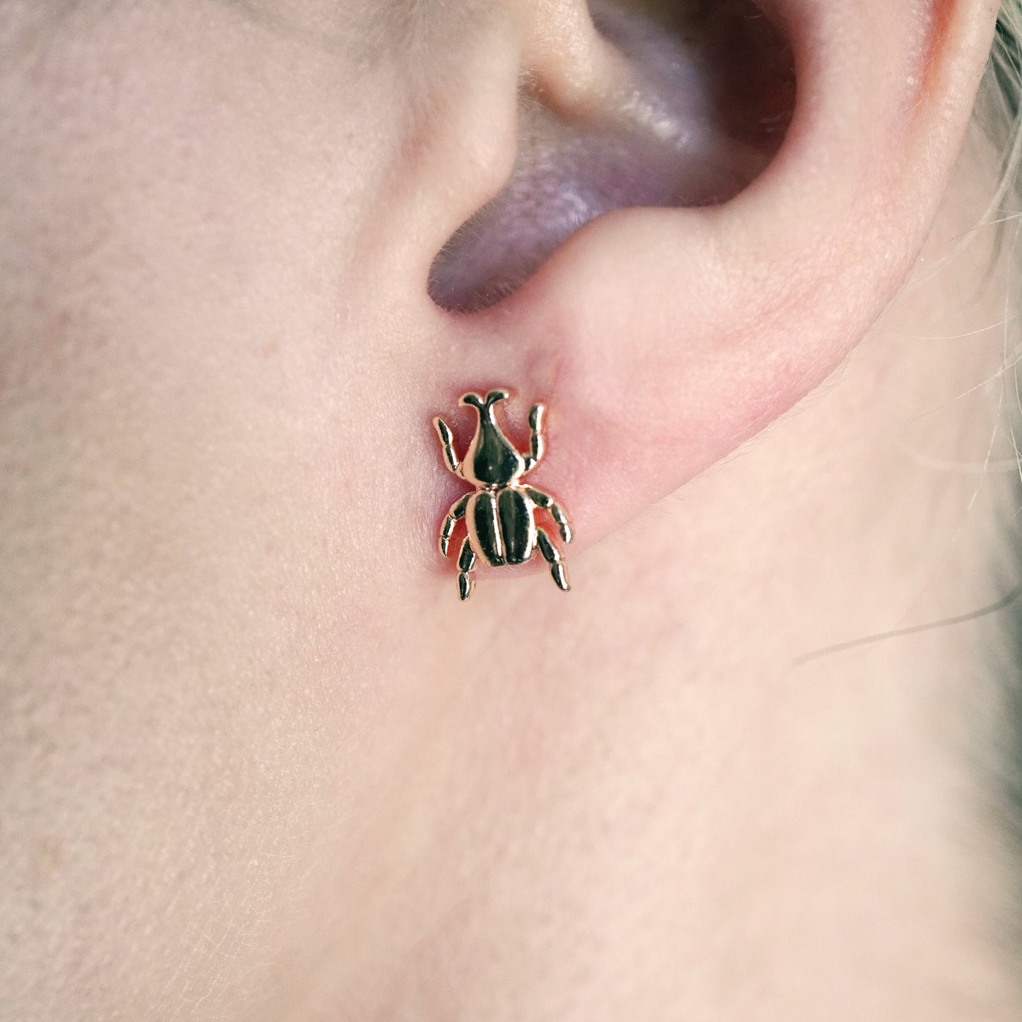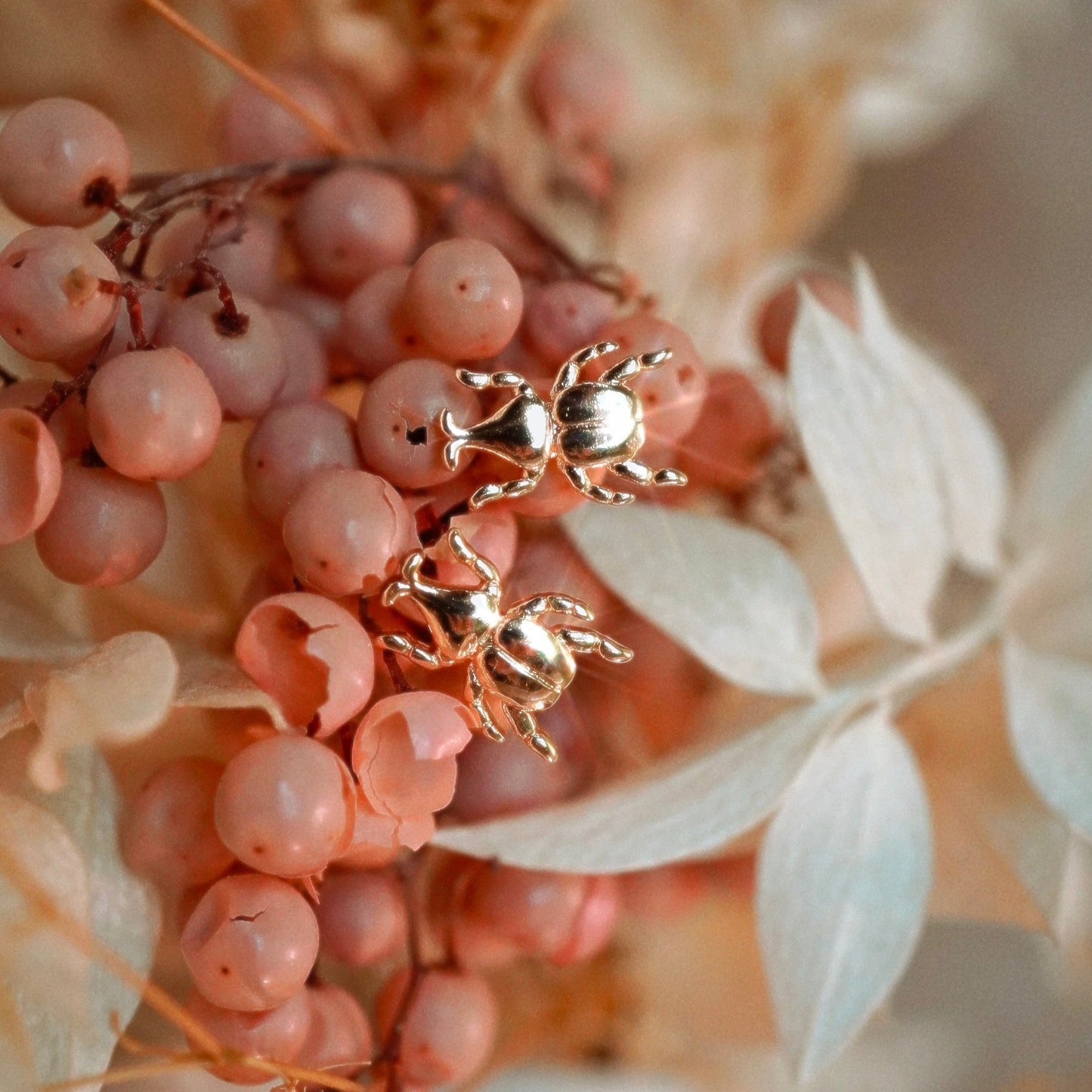 These itty-bitty beetle studs will crawl into your heart! Classy, understated, and dainty enough for everyday, made with nickel free gold-plated brass, gold-plated sterling silver posts, small heart-shaped silicone earring backs, and shipped in a gorgeous green velvet reusable jewelry pouch.