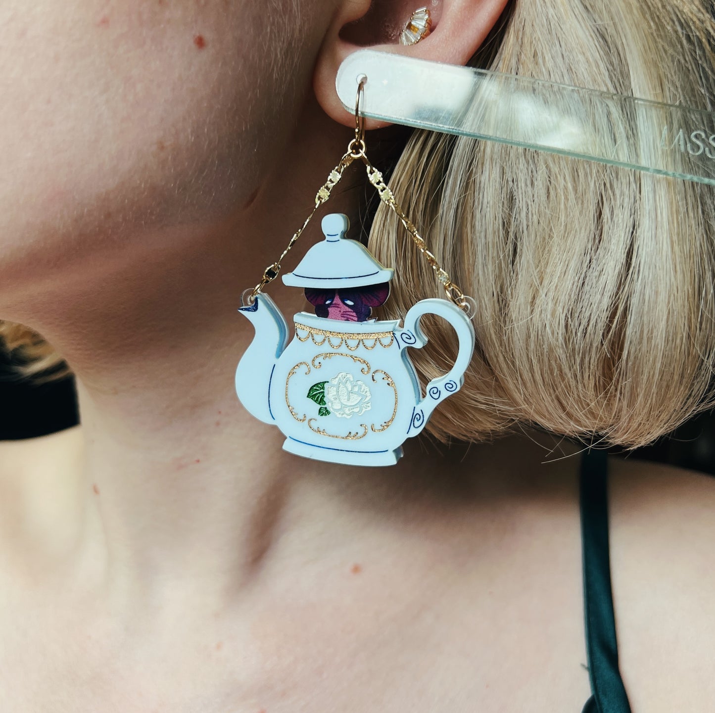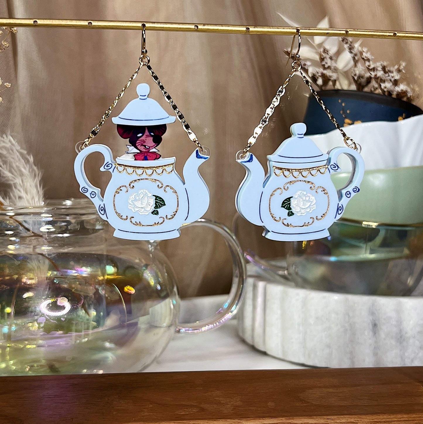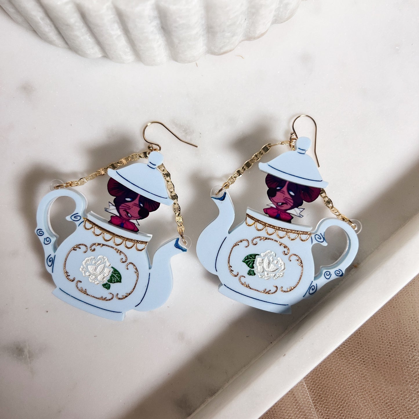 These functional, moving earrings showcase an adorable, sleepy dormouse that pops in and out of a light blue teapot using a small lever on the back of each earring. The teapot itself is hand painted with gold and blue details and a white rose (in defiance of the queen of hearts). Each teapot hangs from a gold-plated stamped chain and is finished with a 14K gold-filled hook.