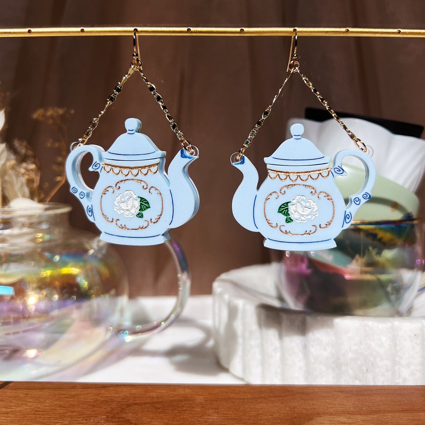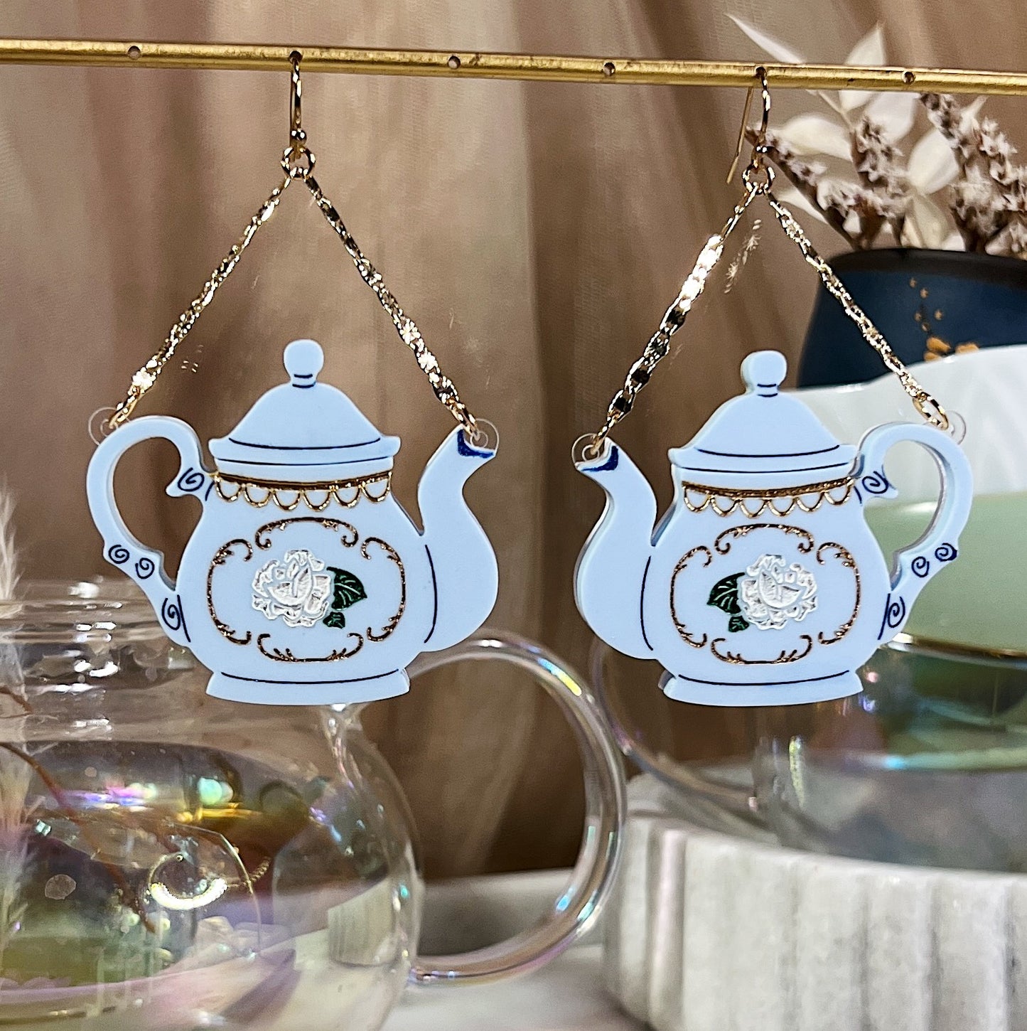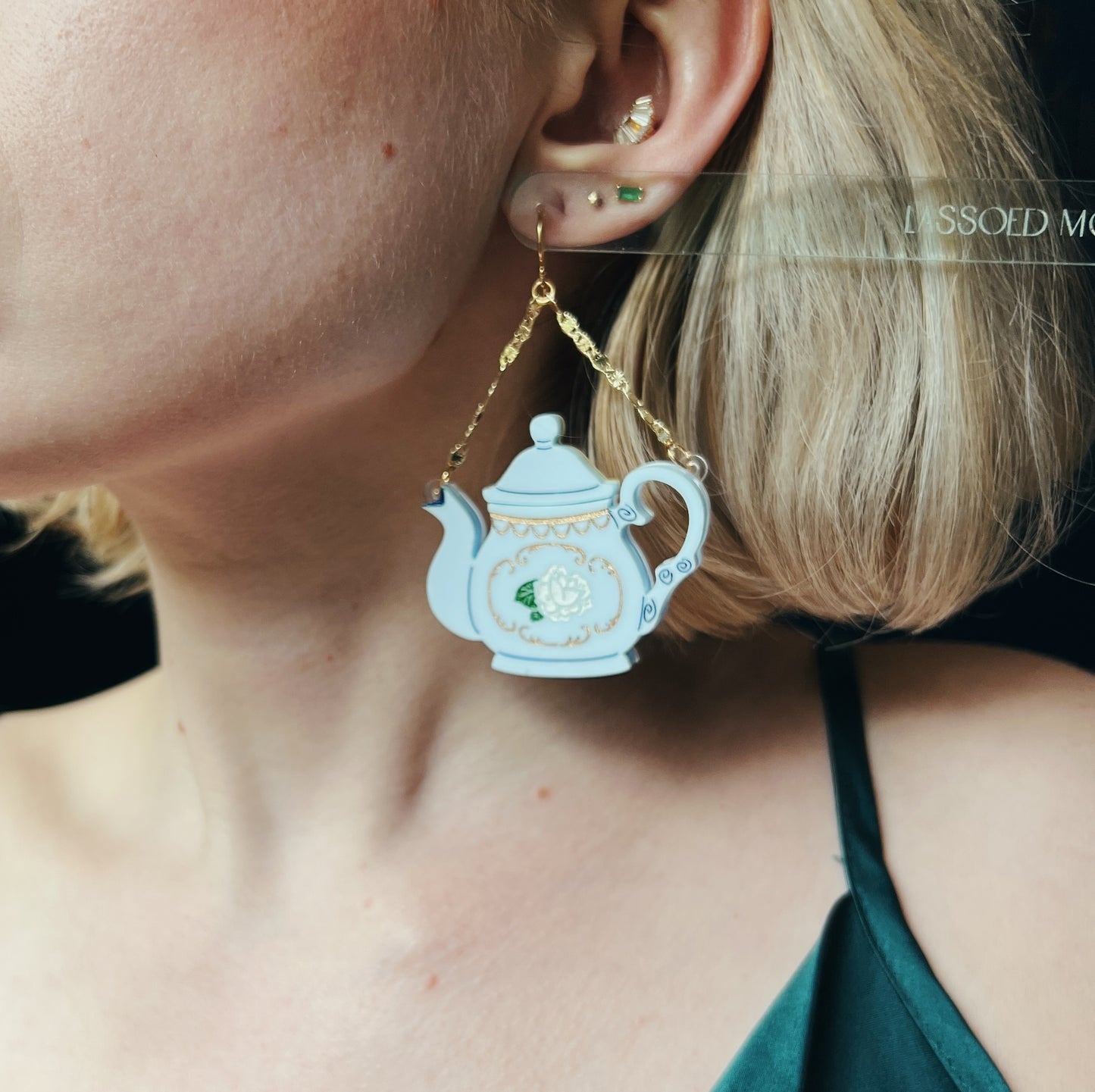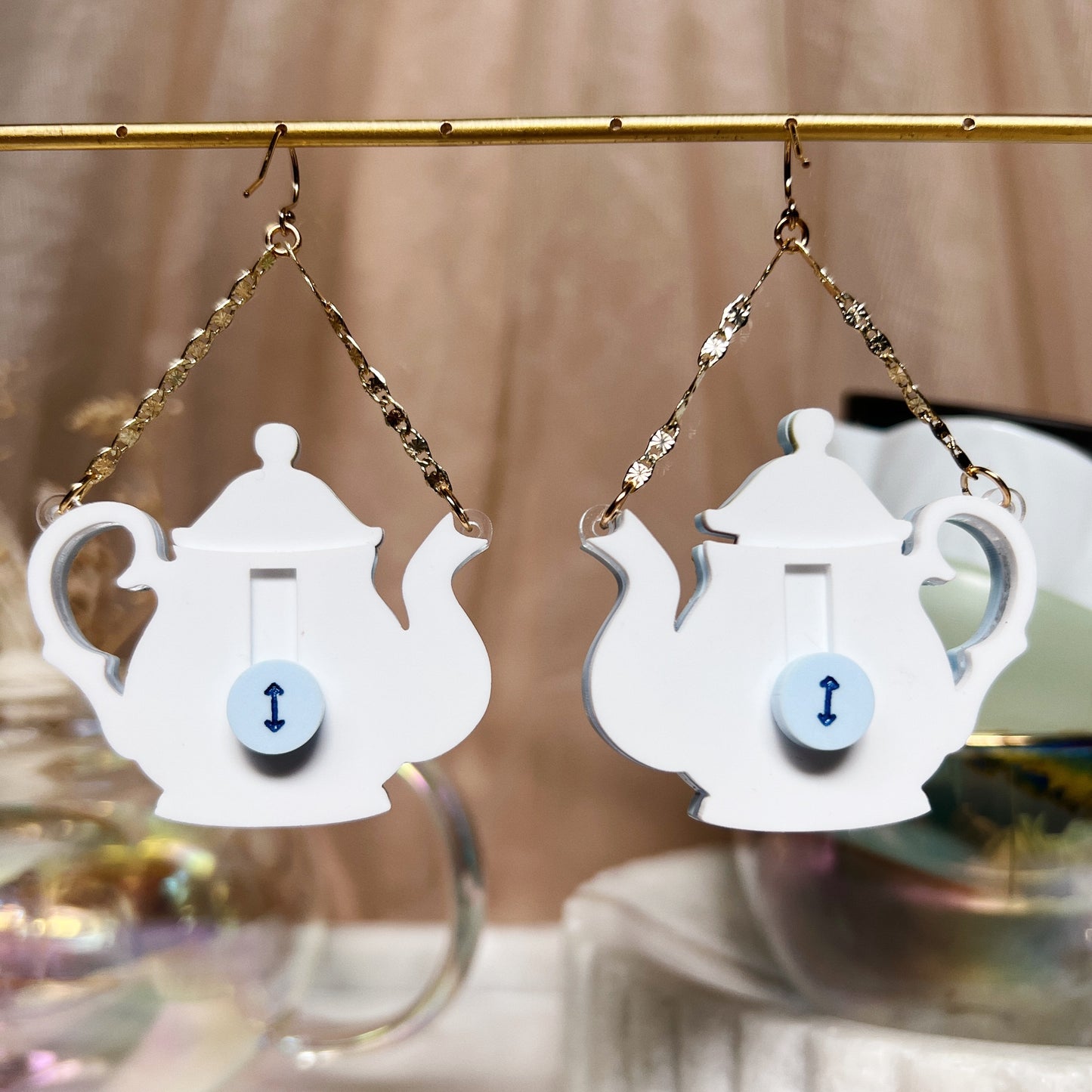 These functional, moving earrings showcase an adorable, sleepy dormouse that pops in and out of a light blue teapot using a small lever on the back of each earring. The teapot itself is hand painted with gold and blue details and a white rose (in defiance of the queen of hearts). Each teapot hangs from a gold-plated stamped chain and is finished with a 14K gold-filled hook.