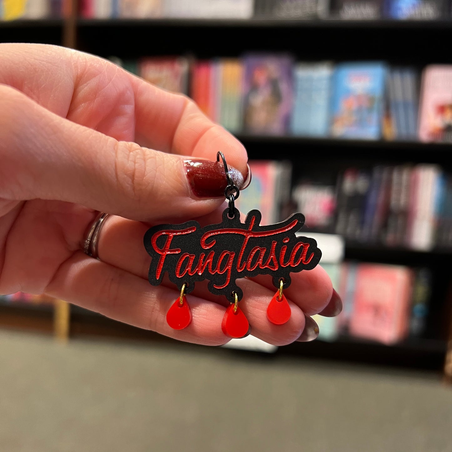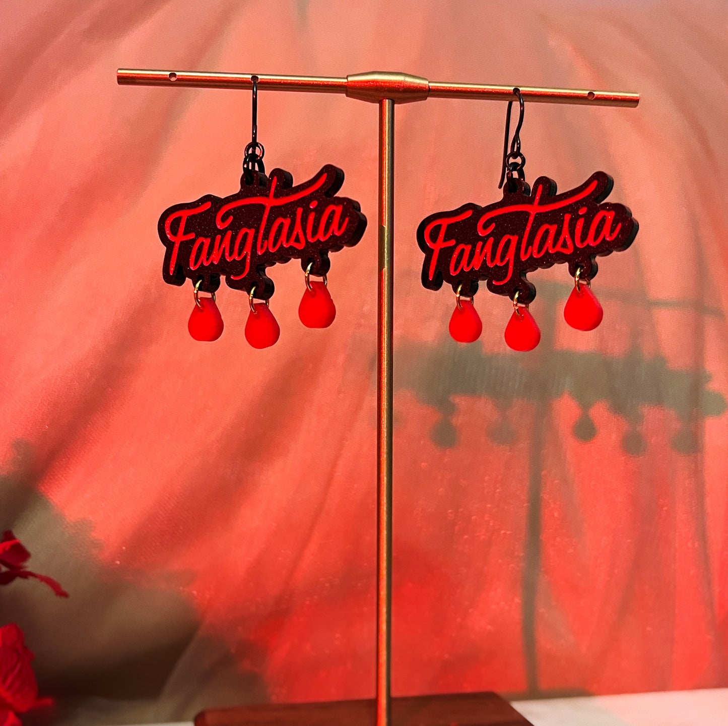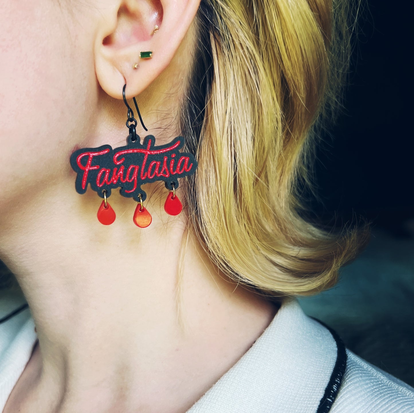"Life Begins at Night" These Fangtasia earrings are inspired by the show "True Blood", and are a perfect way to celebrate everyone's favorite Viking vampire, Eric Northman. These earrings are made with engraved, matte black acrylic, glossy red blood drops, and are hand painted. They hang from black jump rings and hypoallergenic niobium ear hooks.