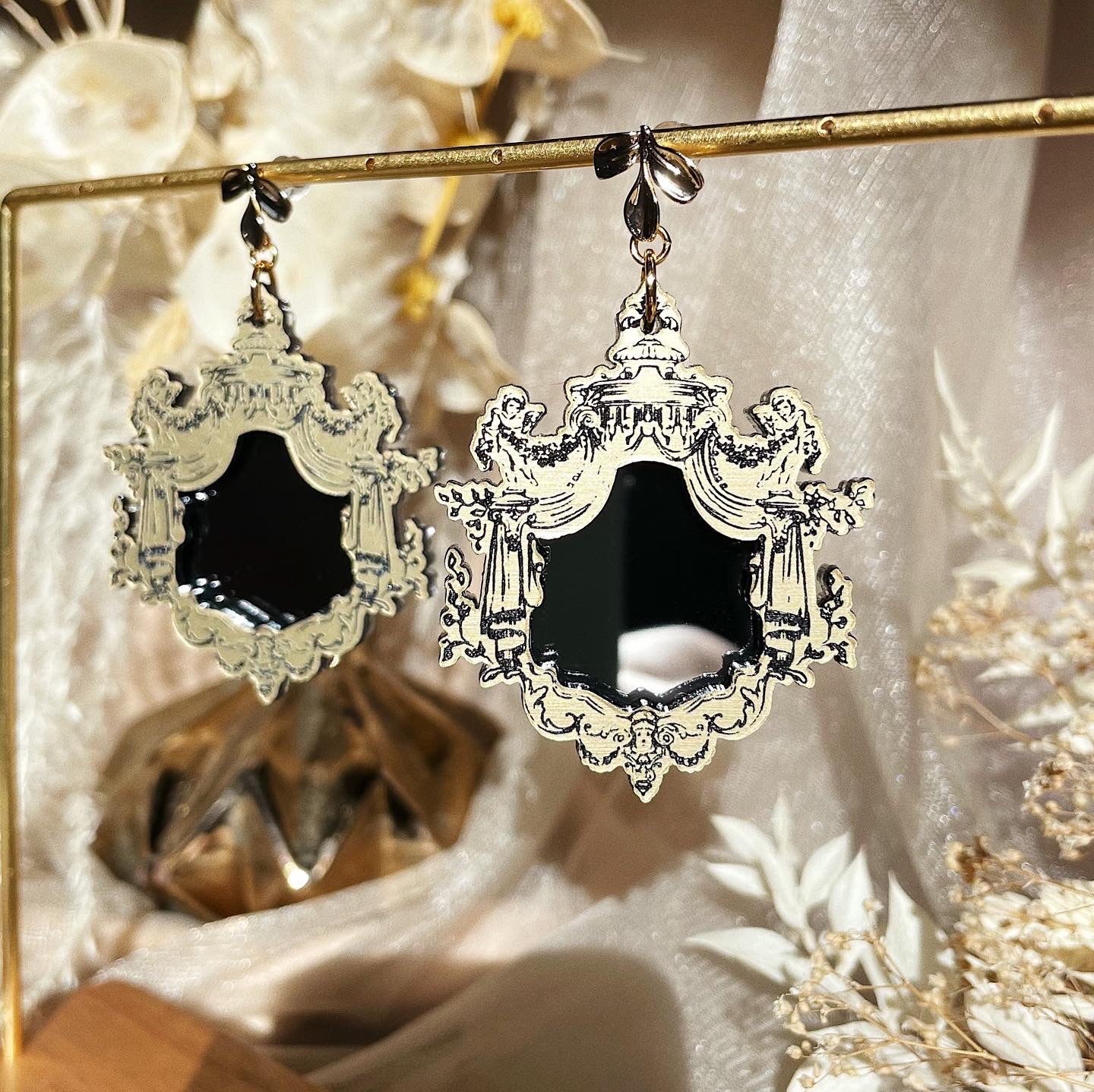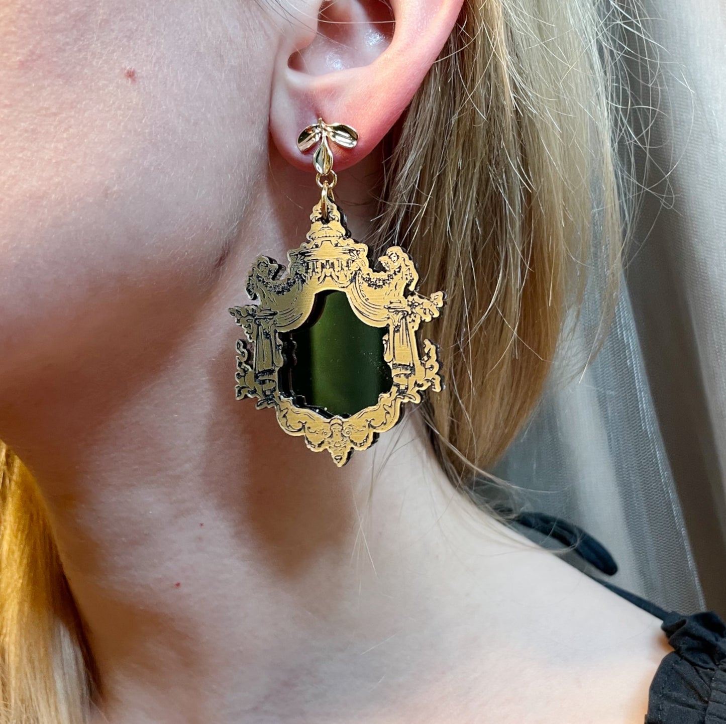 Maybe Narcissus was onto something... but luckily you can't fall into these pools of your own beauty. These earrings are made with a mirror surrounded by a Rococo style engraved brushed gold frame dangling from gold-plated leaf studs.