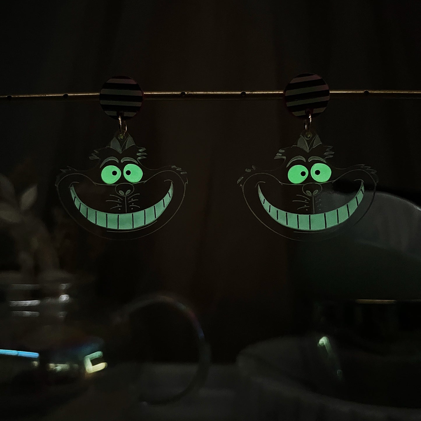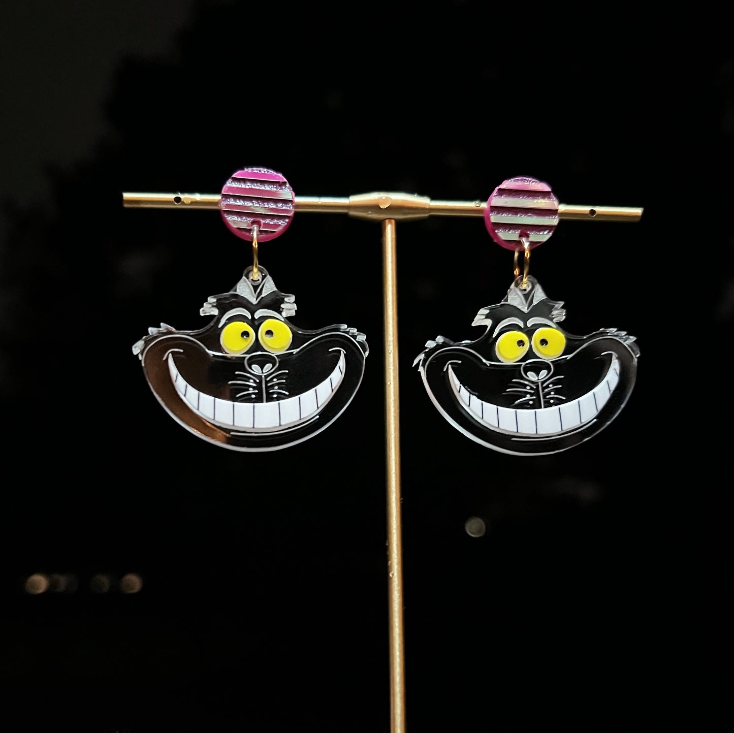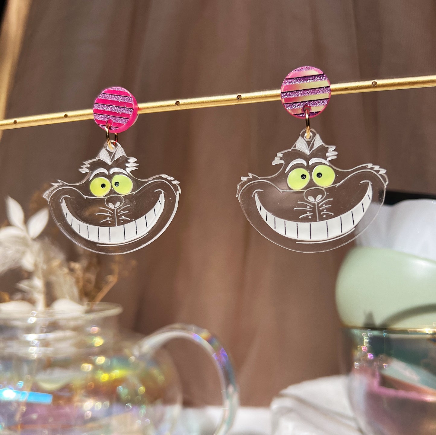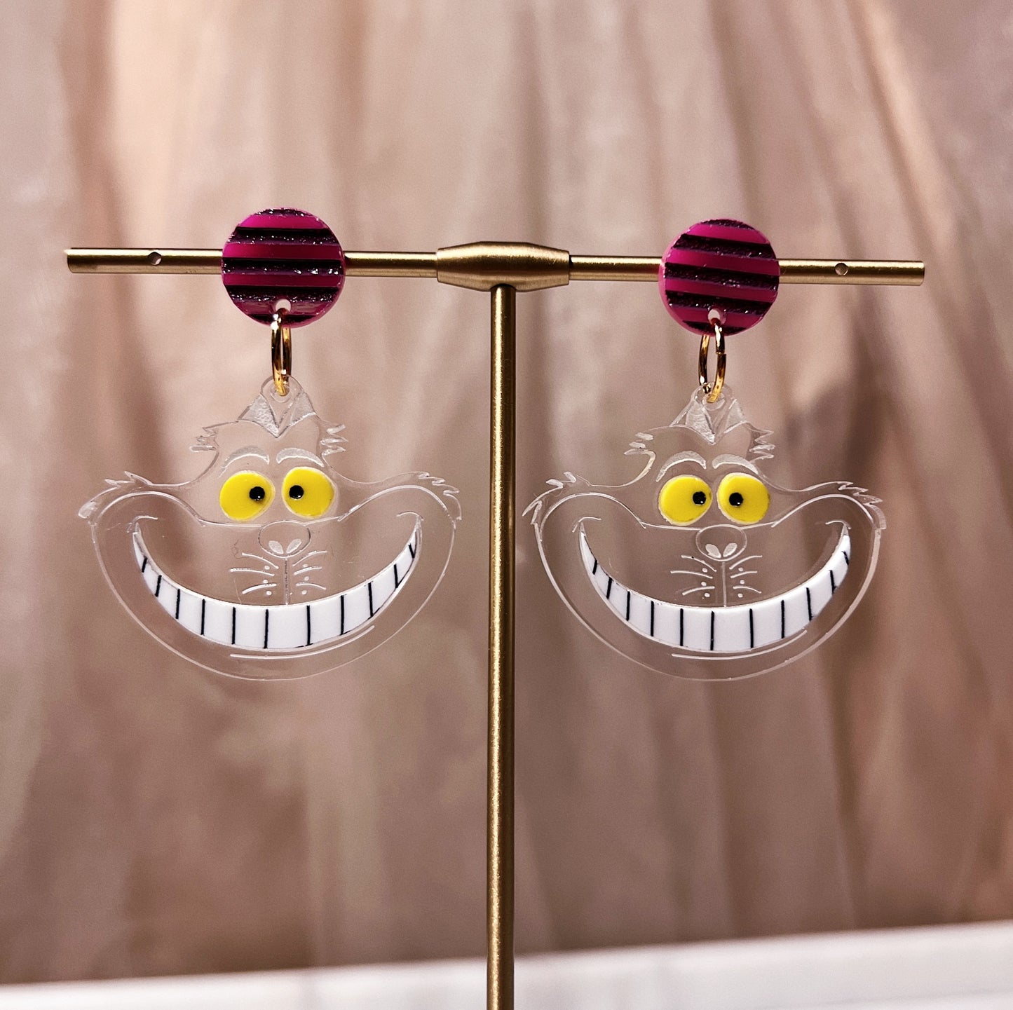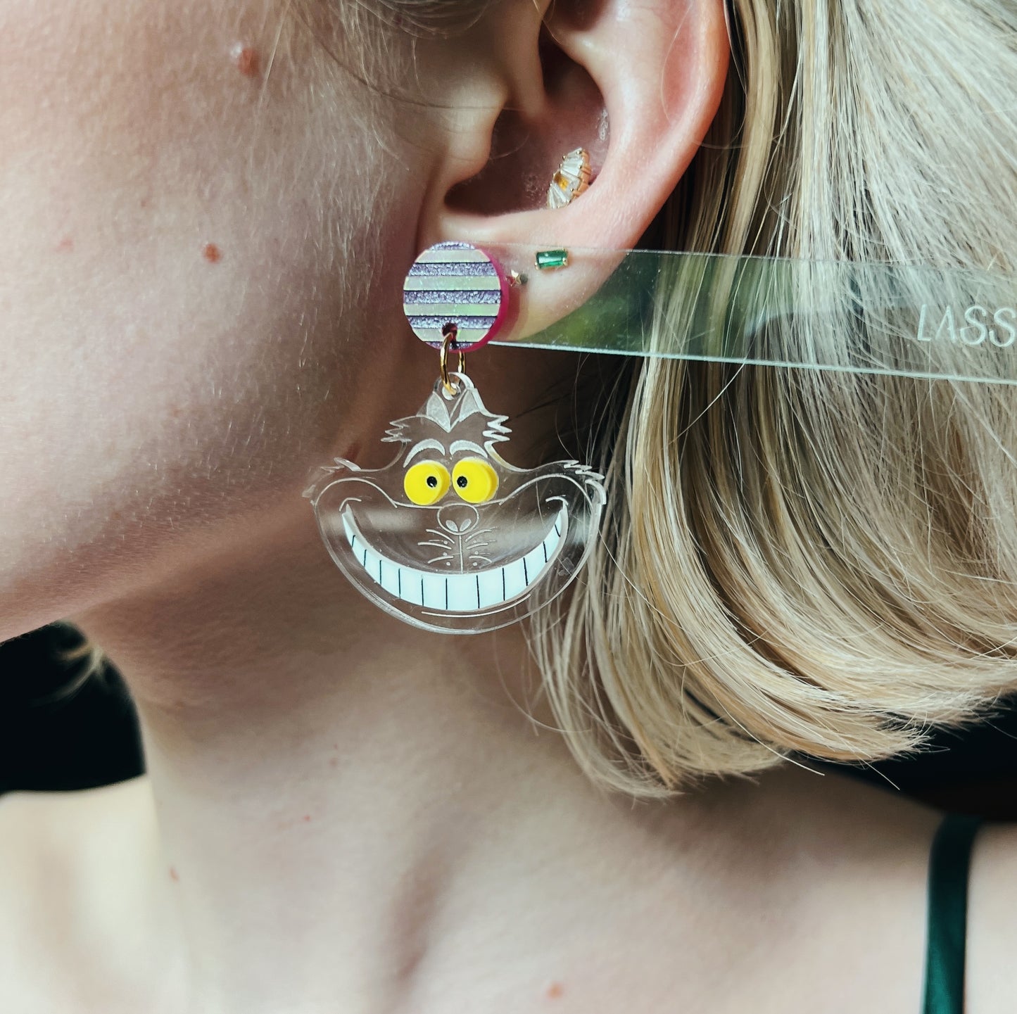 "Most everyone's mad here, you may have noticed that I'm not all there myself." These Cheshire Cat inspired earrings are inspired by his partial disappearing acts with a transparent acrylic face and opaque smile and eye details, also available in a glow-in-the-dark version. The stud details mimic the cats purple and pink stripes with an iridescent glow and hypoallergenic titanium posts (great for sensitive ears)!