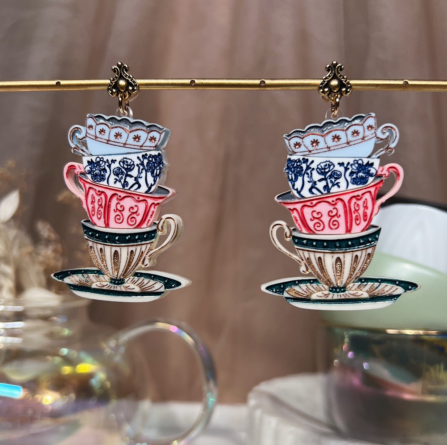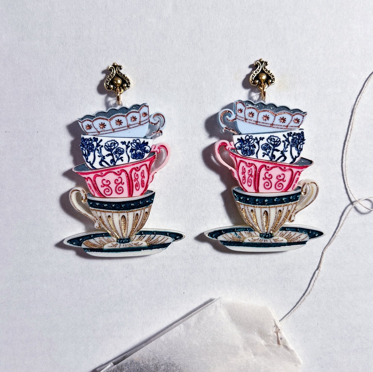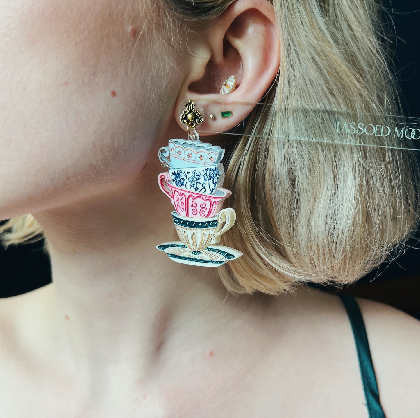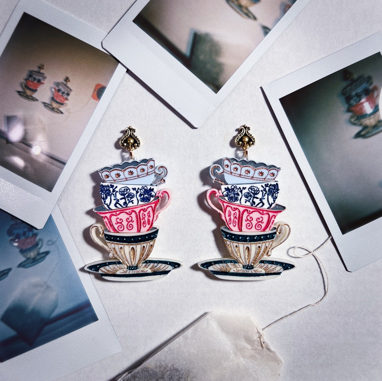 Have a very merry unbirthday tea party with these intricate hand-painted teacup stack earrings. Each of the four teacups, is cut from a different color of acrylic and painted with unique details before being pieces together on a clear acrylic backing. The scroll detail studs are antique gold-plated pewter with hypoallergenic titanium posts (great for sensitive ears)!