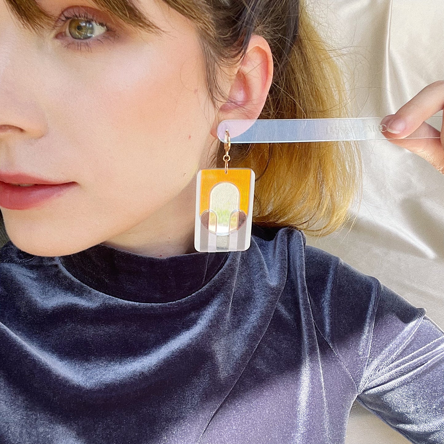 These gorgeous, modern deco earrings are like a piece of art hanging on either side of a real piece of art (that's you!). Each pair is made with eight colors of layered premium acrylic and gold-plated huggie hoops.