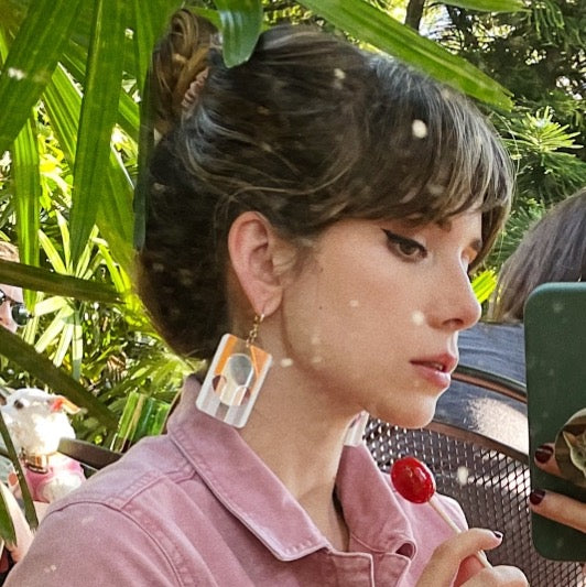 Regular price $48.00These gorgeous, modern deco earrings are like a piece of art hanging on either side of a real piece of art (that's you!). Each pair is made with eight colors of layered premium acrylic and gold-plated huggie hoops.