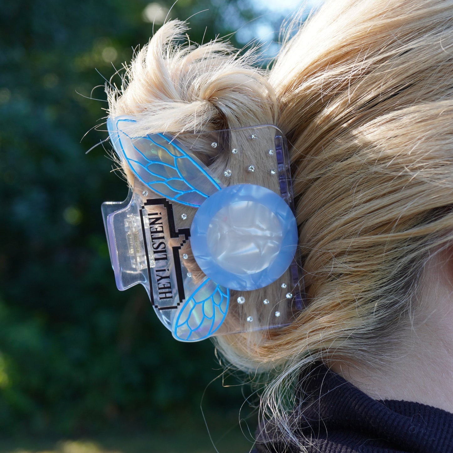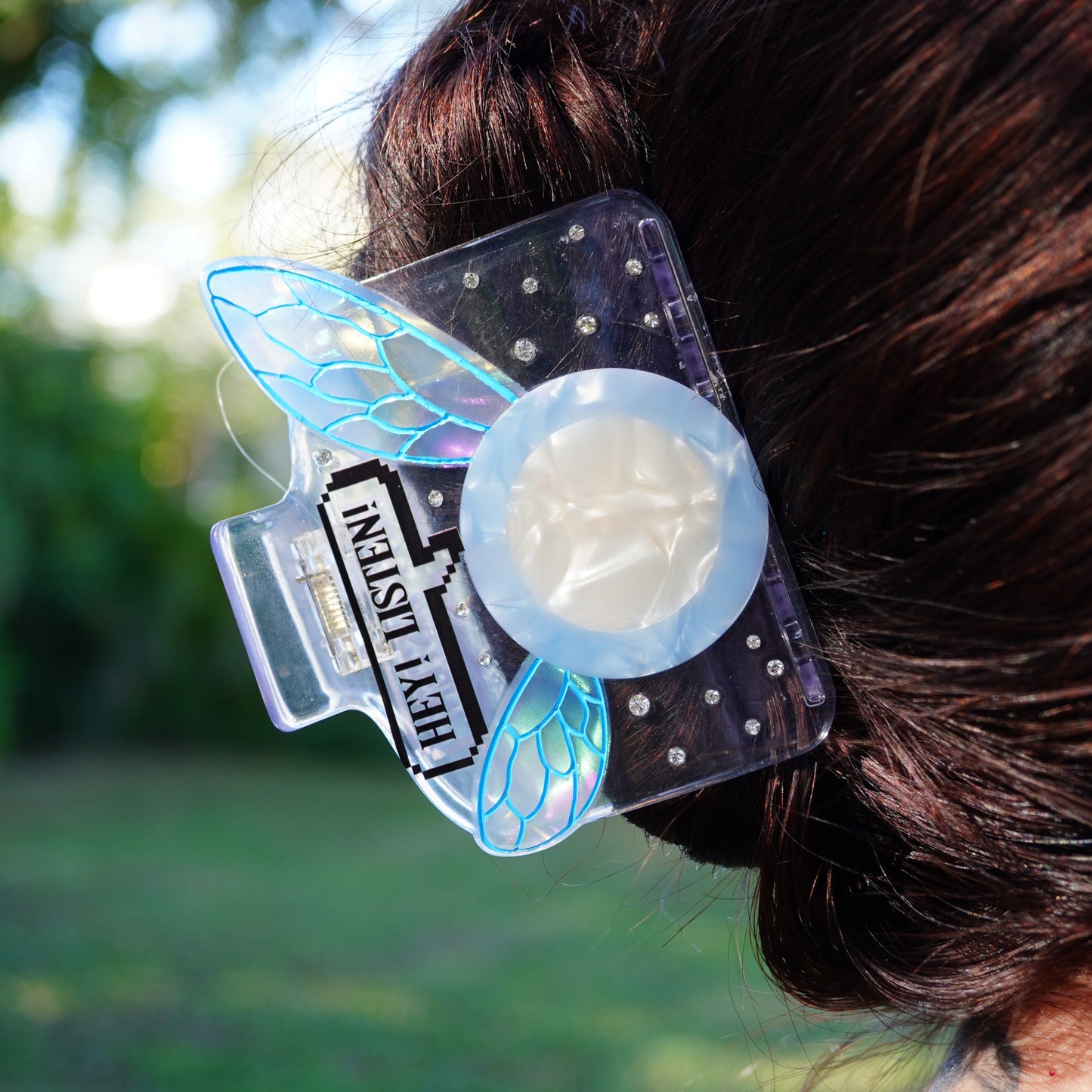 Hey! Listen! Carry around everyone's favorite, not at all annoying sidekick Navi with this adorable claw clip inspired by Ocarina of Time. The clear claw clip gives the illusion that Navi is floating in your hair with little crystal "fairy dust" sprinkled throughout the clear finish which adds a beautiful effect when worn. Navi's signature phrase "Hey! Listen!" is printed on the back of the clip in black. Includes a free reusable green velvet carrying pouch.