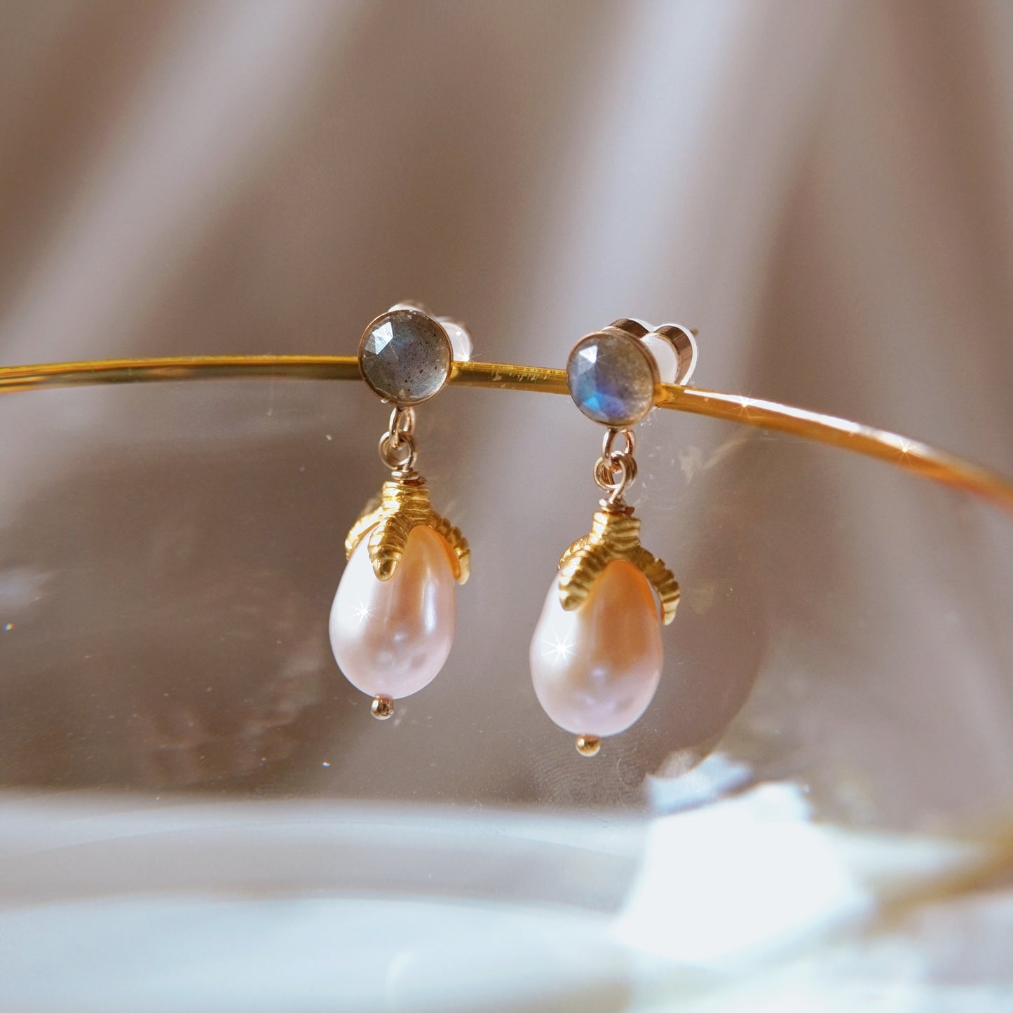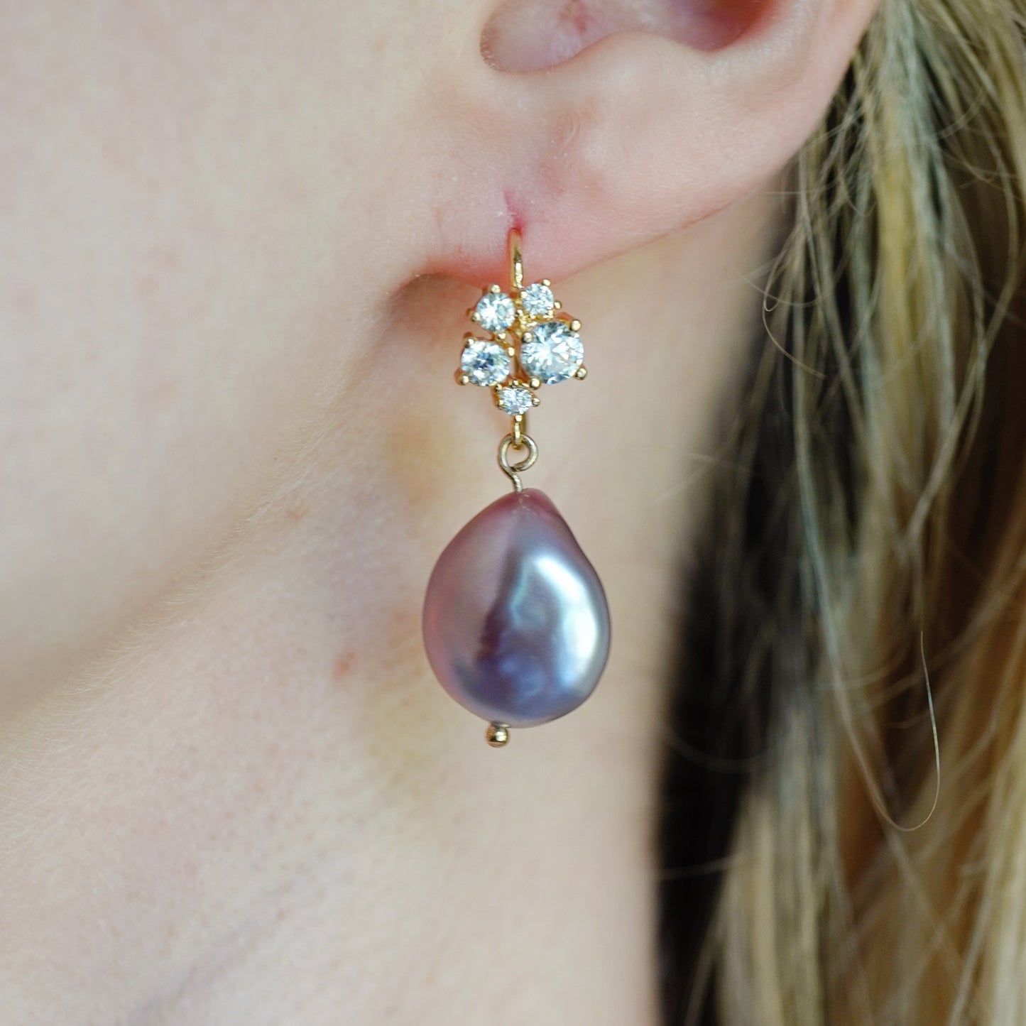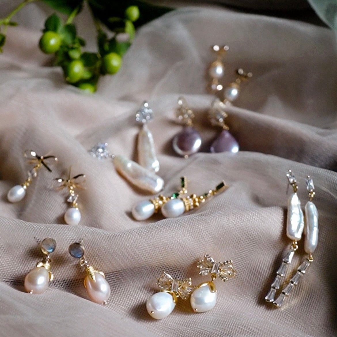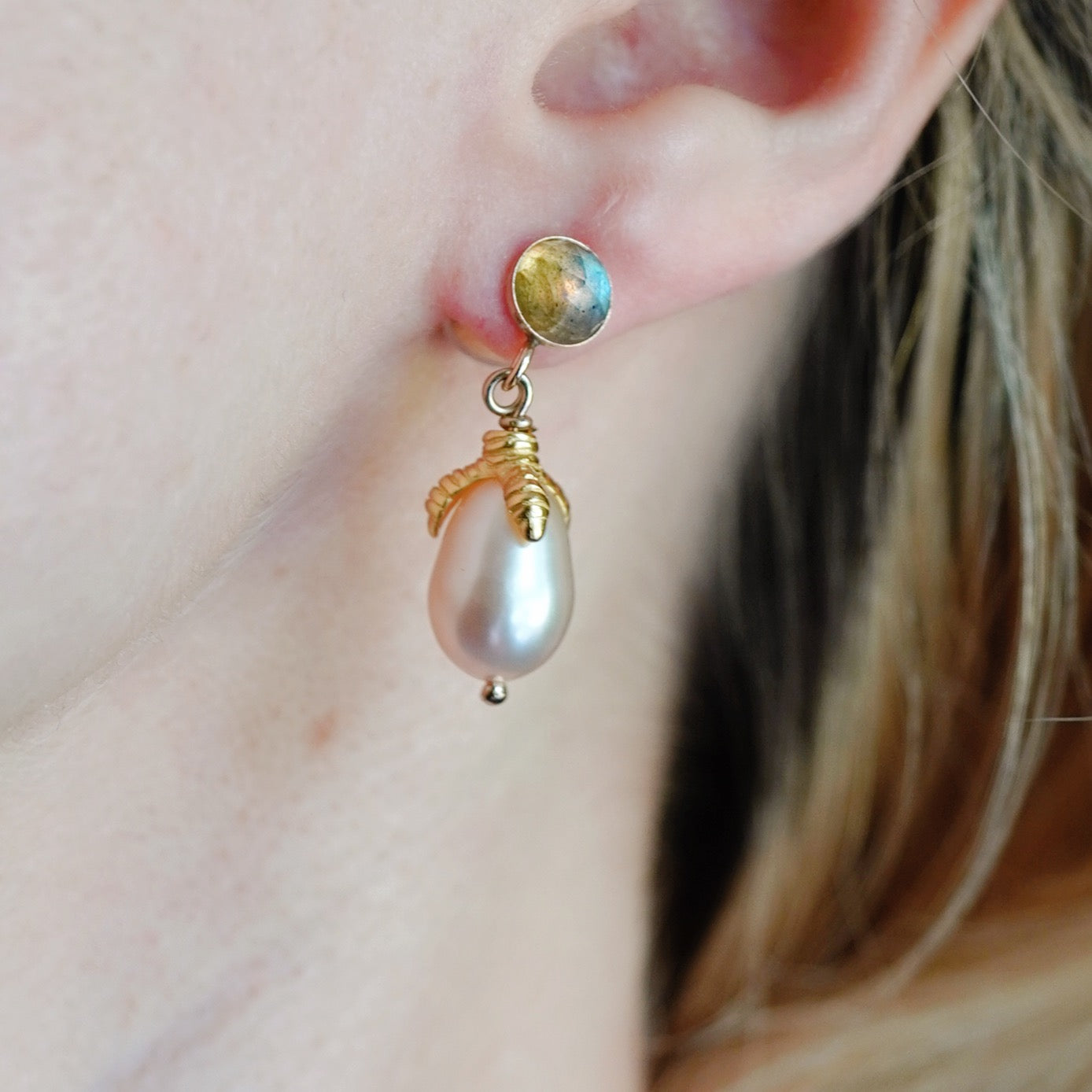 These beautiful pearl earrings come in a variety of limited edition and one-of-a-kind styles. Using a wide array of materials curated to match each style of freshwater pearl, each design is thoughtfully made to elevate your look for an evening out or an everyday touch of glamour. The materials vary by piece, with gold-filled, vermeil, and gold-plated elements. Natural stones like labradorite are featured on the Dragon's Egg pair with cubic zirconia stones featured on many others. The material each earring post is made out of is dictated in the style name with (GF) for gold-filled, (V) for Vermeil, and (GP) for gold-plated.