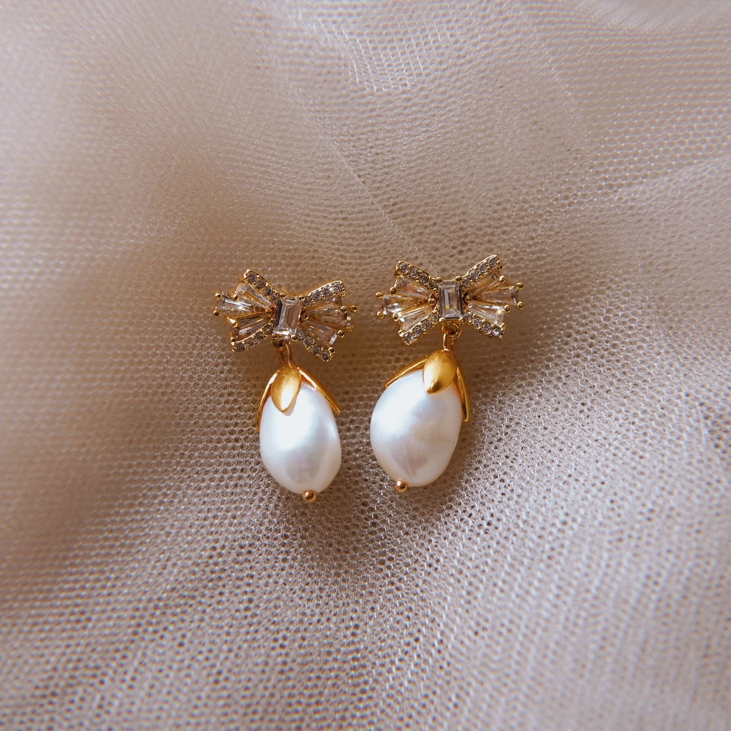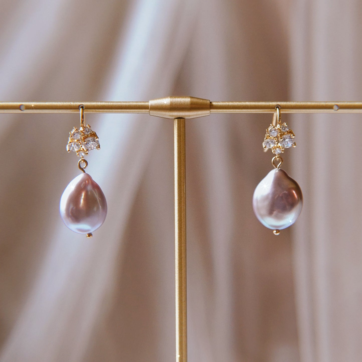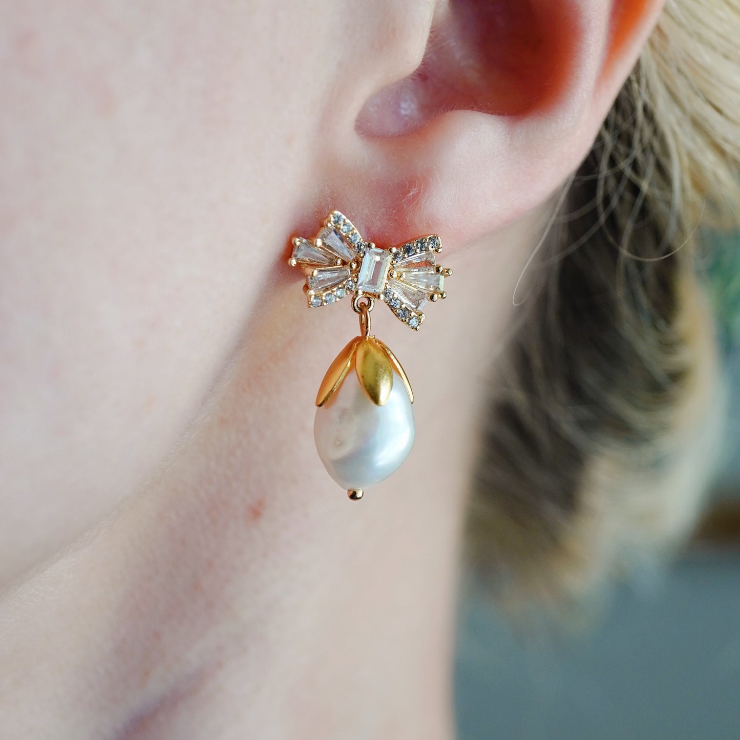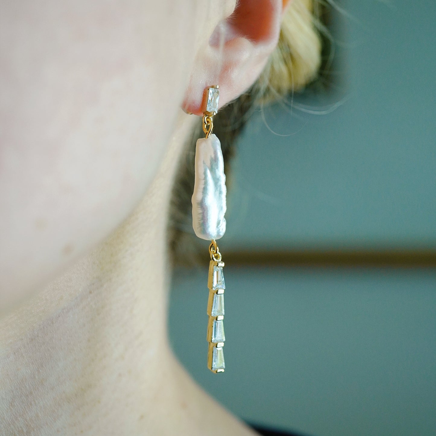 These beautiful pearl earrings come in a variety of limited edition and one-of-a-kind styles. Using a wide array of materials curated to match each style of freshwater pearl, each design is thoughtfully made to elevate your look for an evening out or an everyday touch of glamour. The materials vary by piece, with gold-filled, vermeil, and gold-plated elements. Natural stones like labradorite are featured on the Dragon's Egg pair with cubic zirconia stones featured on many others. The material each earring post is made out of is dictated in the style name with (GF) for gold-filled, (V) for Vermeil, and (GP) for gold-plated.