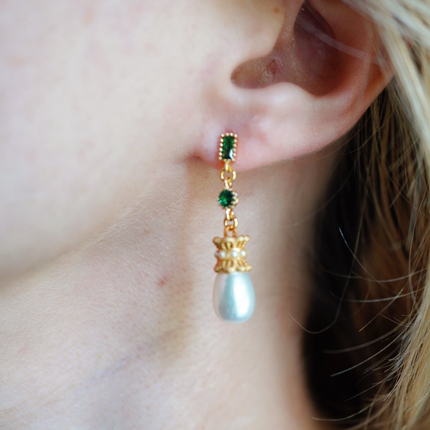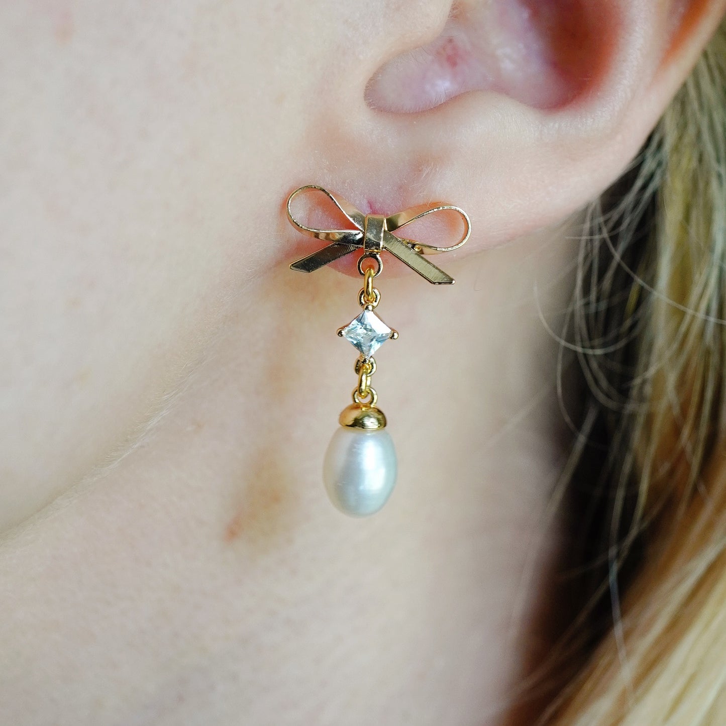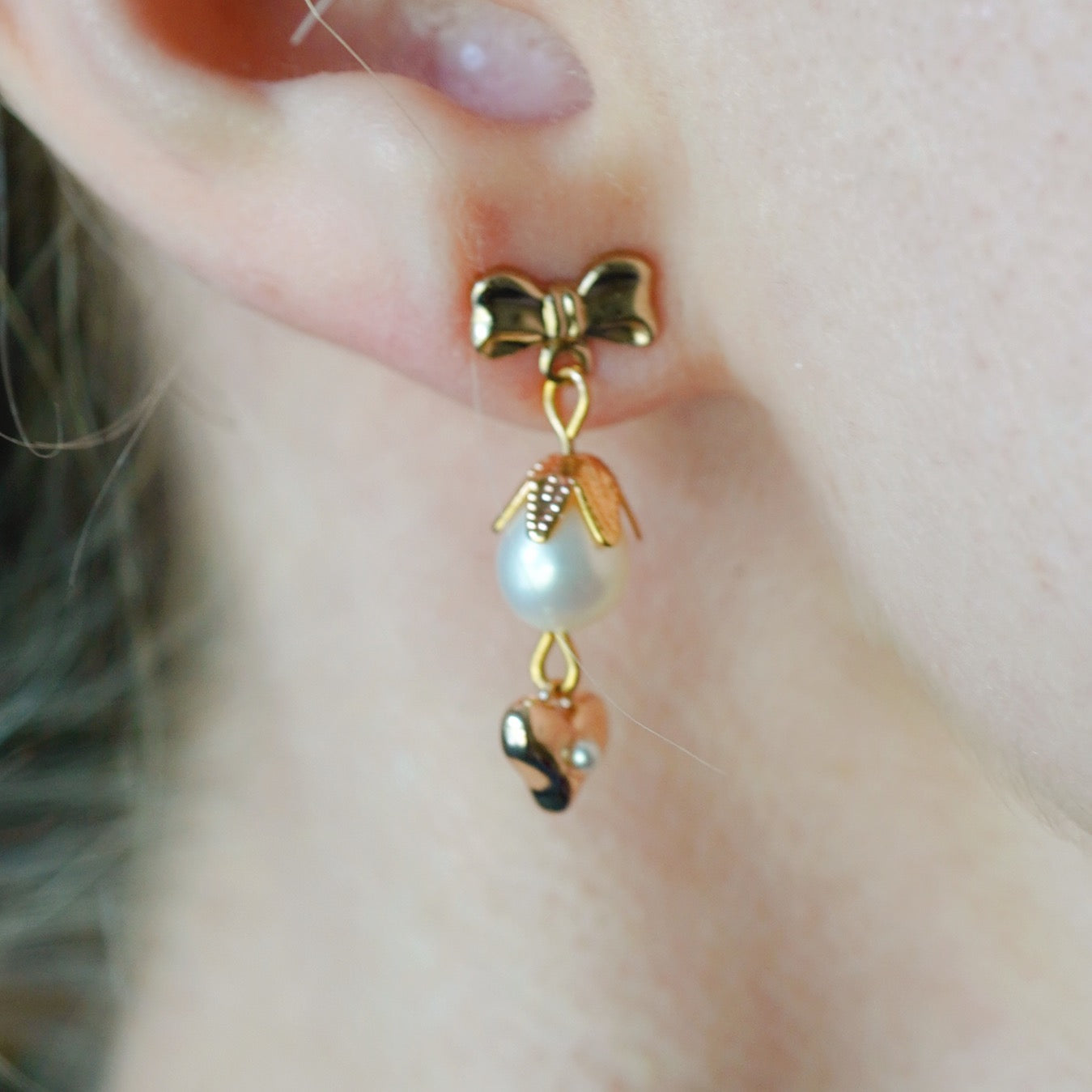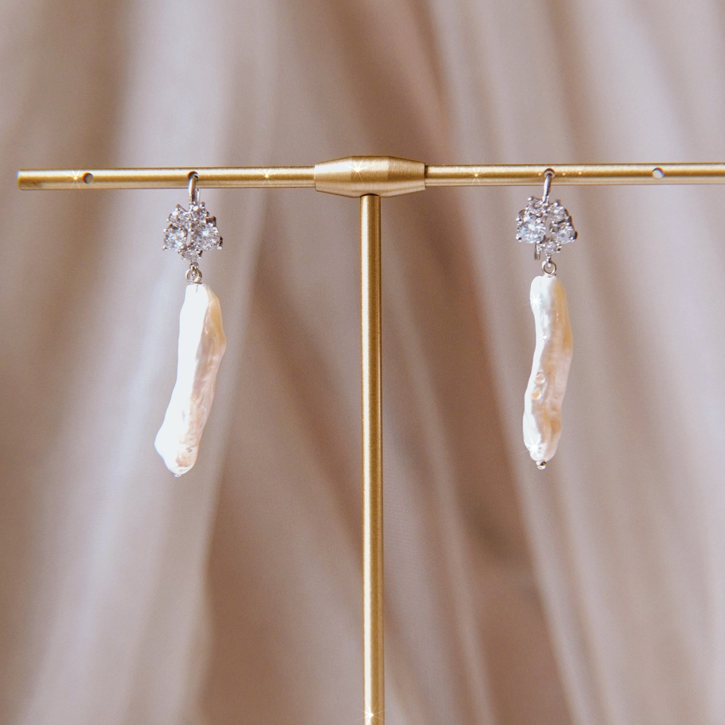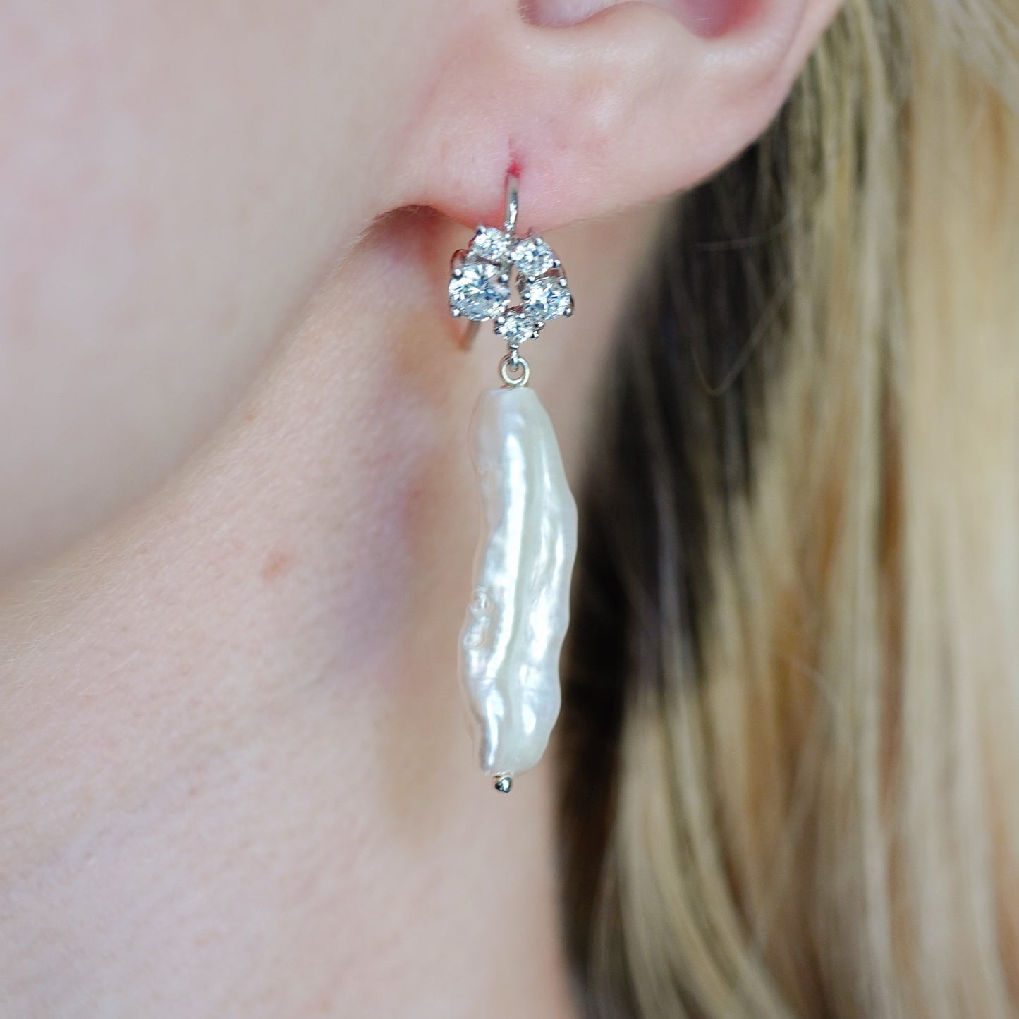 These beautiful pearl earrings come in a variety of limited edition and one-of-a-kind styles. Using a wide array of materials curated to match each style of freshwater pearl, each design is thoughtfully made to elevate your look for an evening out or an everyday touch of glamour. The materials vary by piece, with gold-filled, vermeil, and gold-plated elements. Natural stones like labradorite are featured on the Dragon's Egg pair with cubic zirconia stones featured on many others. The material each earring post is made out of is dictated in the style name with (GF) for gold-filled, (V) for Vermeil, and (GP) for gold-plated.