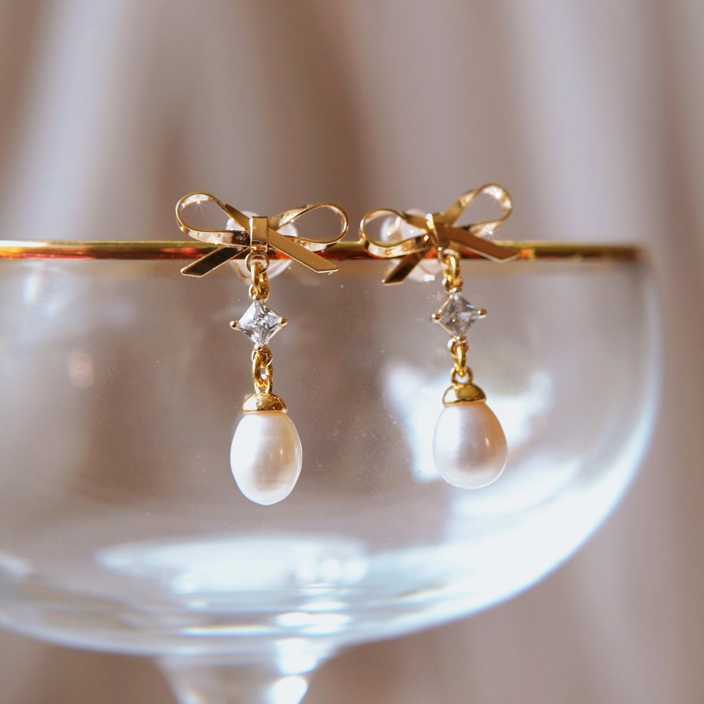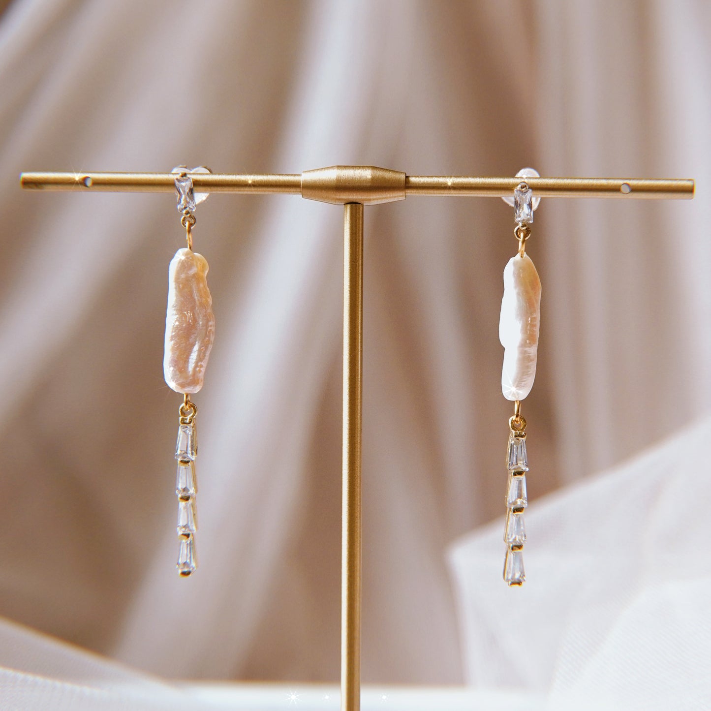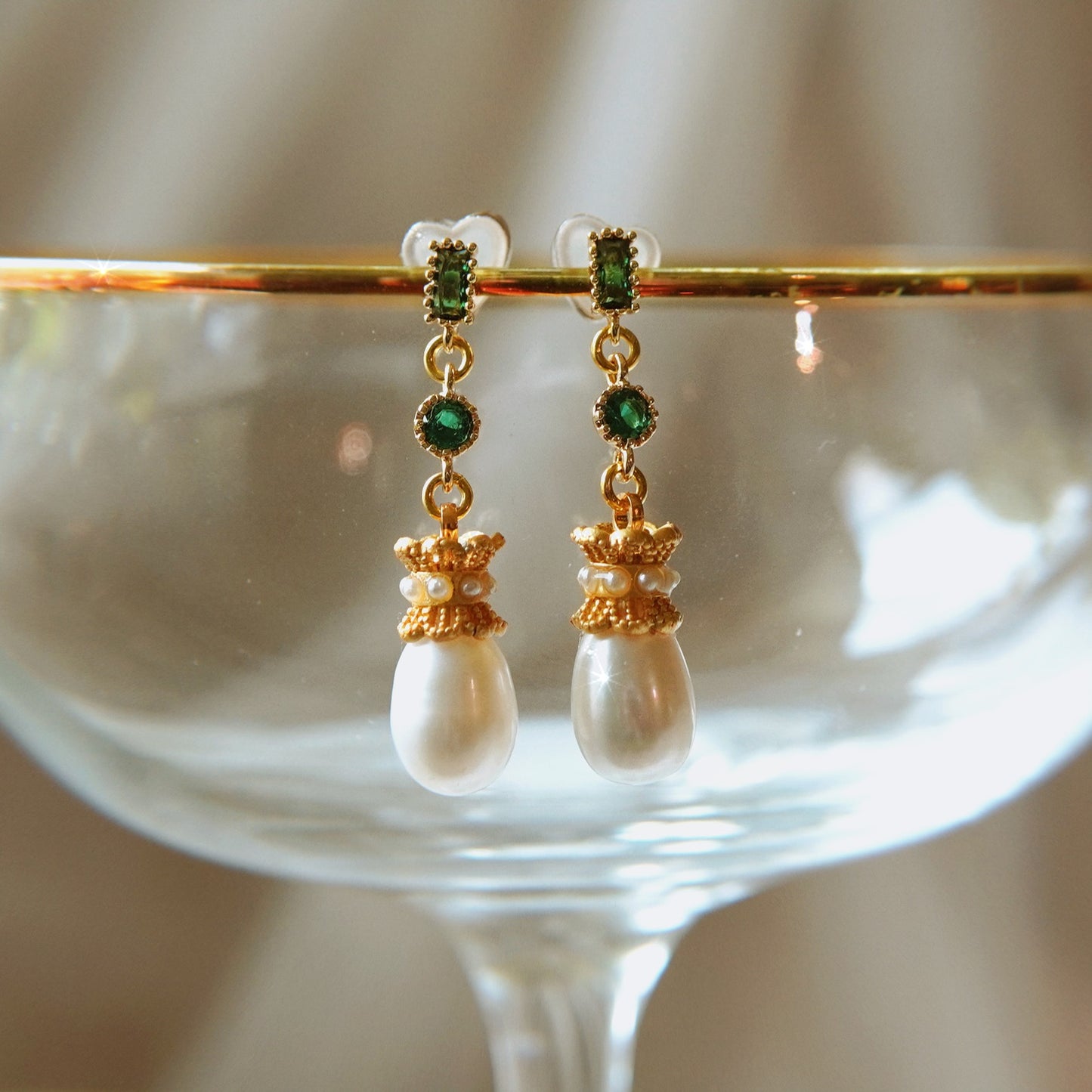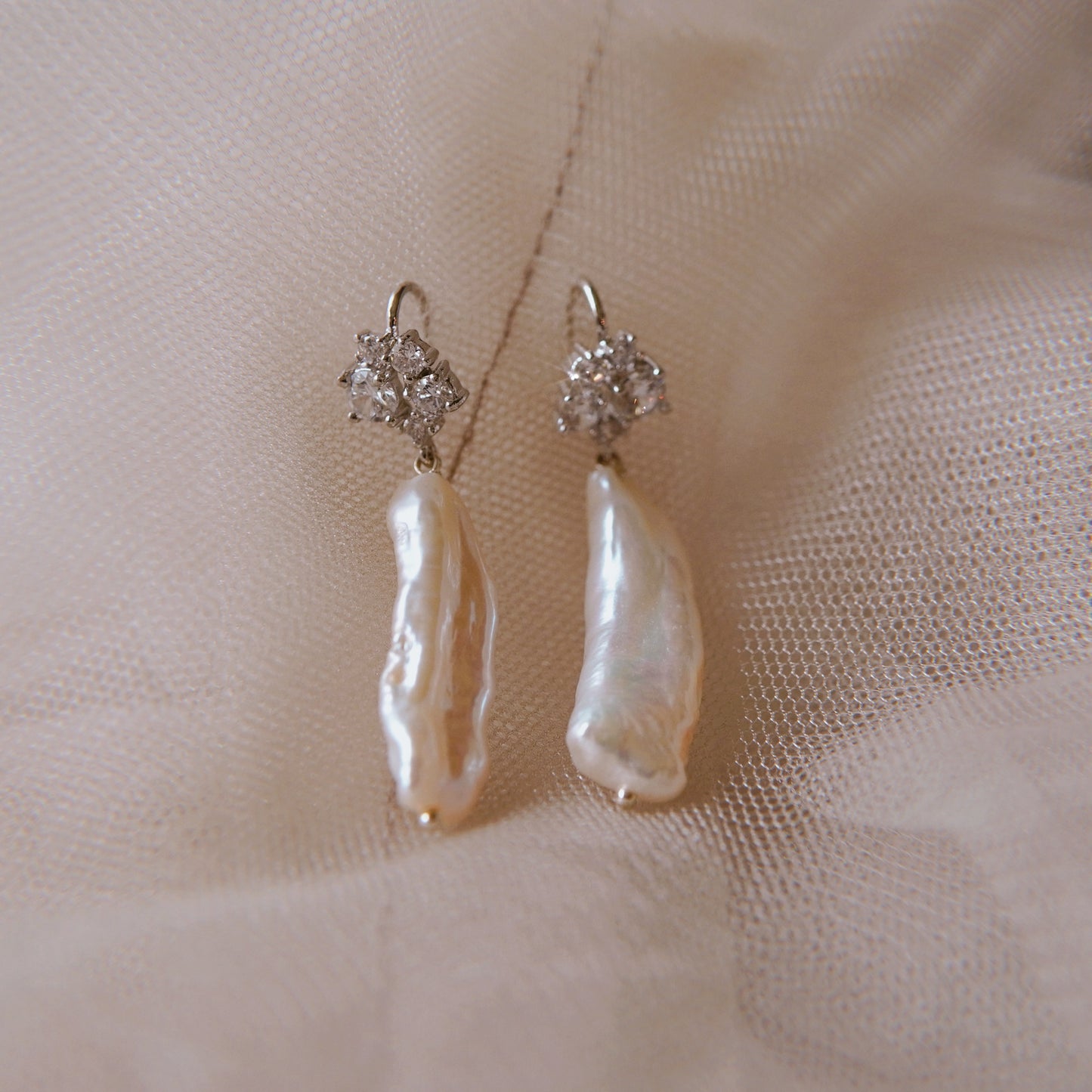 These beautiful pearl earrings come in a variety of limited edition and one-of-a-kind styles. Using a wide array of materials curated to match each style of freshwater pearl, each design is thoughtfully made to elevate your look for an evening out or an everyday touch of glamour. The materials vary by piece, with gold-filled, vermeil, and gold-plated elements. Natural stones like labradorite are featured on the Dragon's Egg pair with cubic zirconia stones featured on many others. The material each earring post is made out of is dictated in the style name with (GF) for gold-filled, (V) for Vermeil, and (GP) for gold-plated.