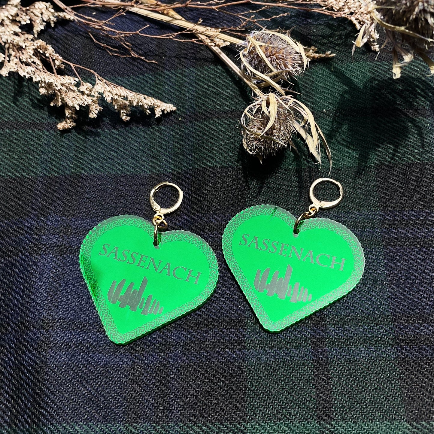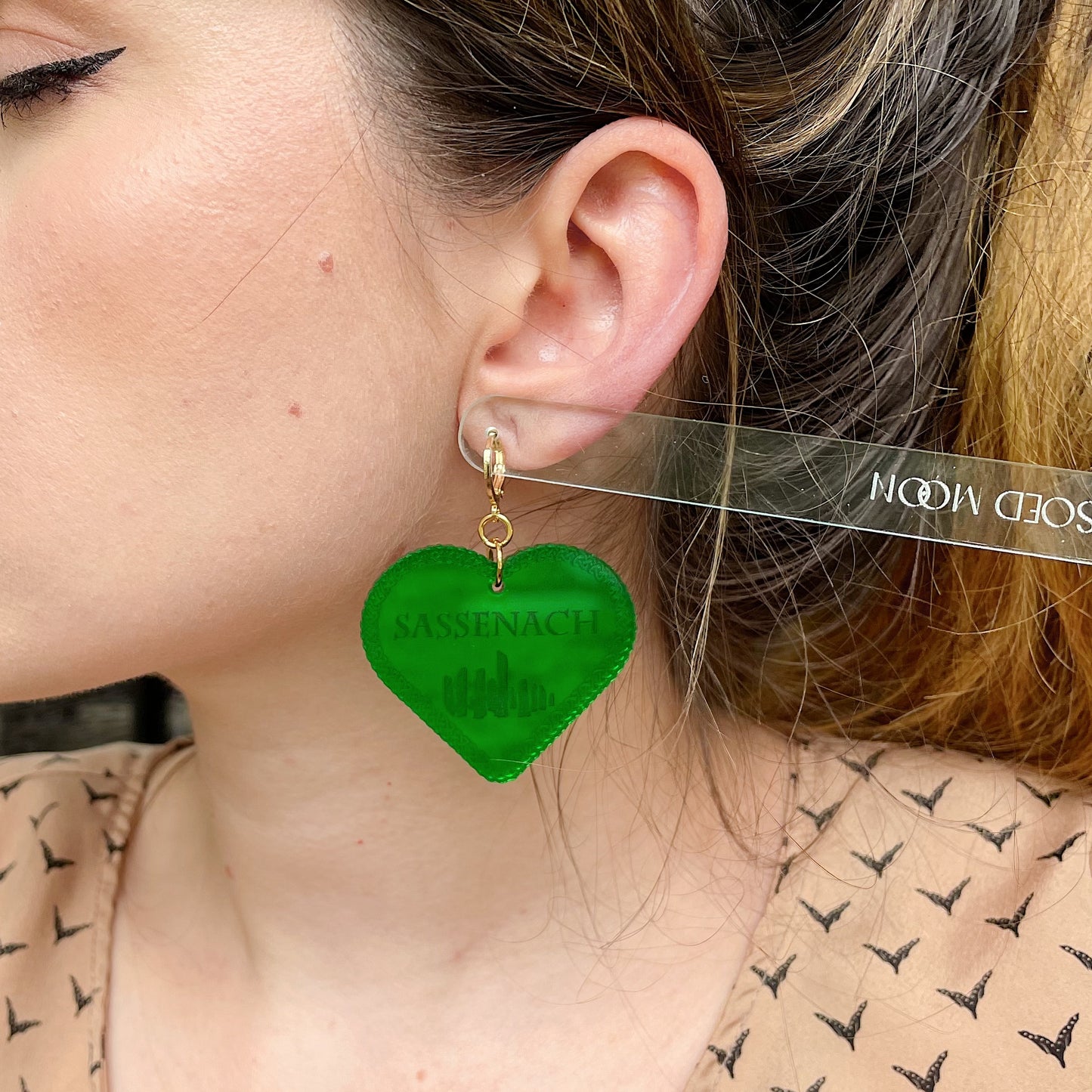 The perfect earrings to wear while time traveling a few hundred years to meet your new husband. The Sassanach earrings are made using engraved green mirrored acrylic and gold-plated huggie hoops. *Lassoed Moon is not liable for anyone tried as a witch while time traveling.