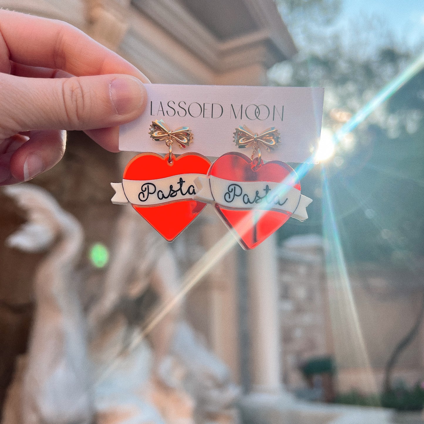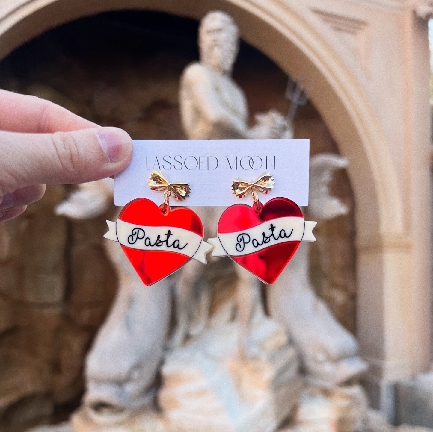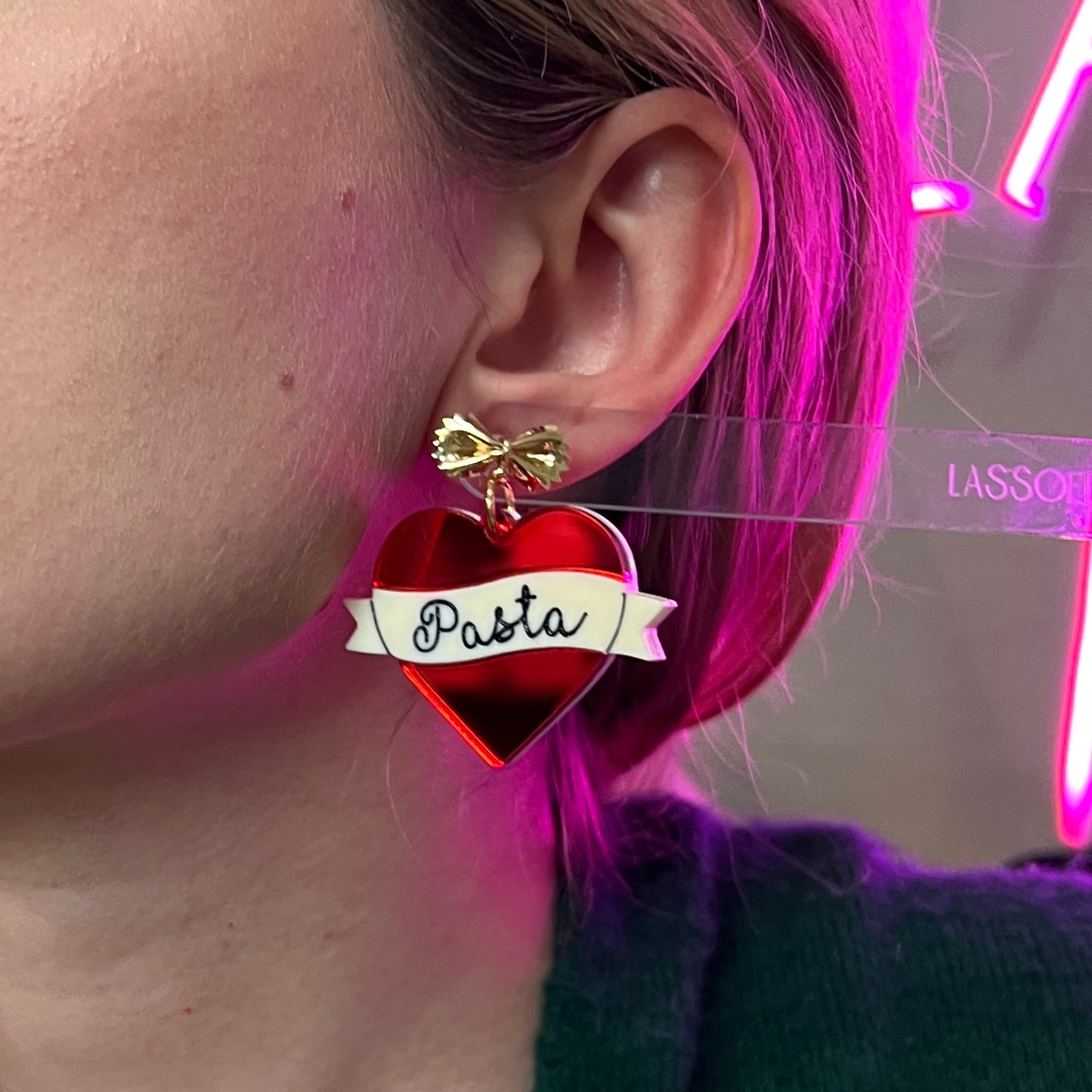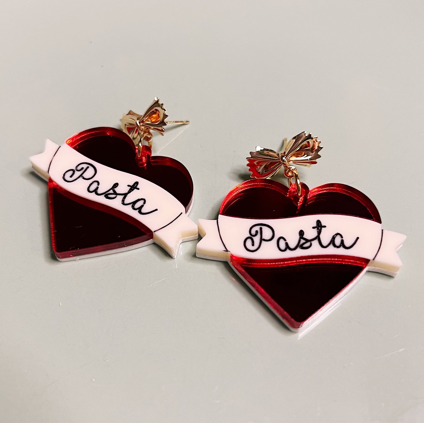 An earring fit for pasta loving royalty! Inspired by a traditional "Mom" heart and banner tattoo design, these earrings are made from laser cut red mirror and ivory acrylic, painted with black engraving, and layered on a white backing. The cheese on top is the gold-plated bowtie pasta shaped earring posts, chef's kiss!