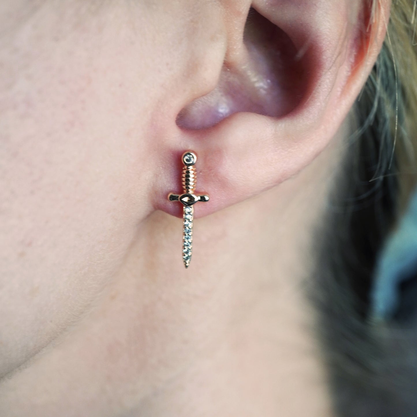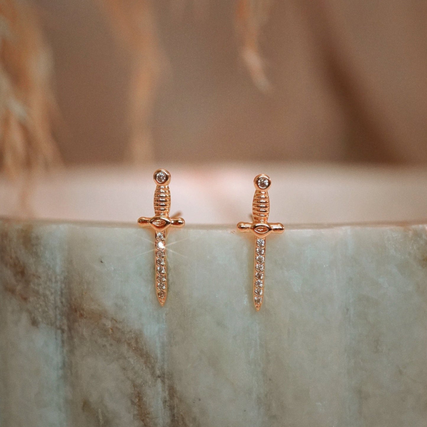These super small sword studs will help you succeed in all your tiniest battles! Classy, understated, and dainty enough for everyday, made with nickel free gold-plated brass, small heart-shaped silicone earring backs, and shipped in a gorgeous green velvet reusable jewelry pouch.