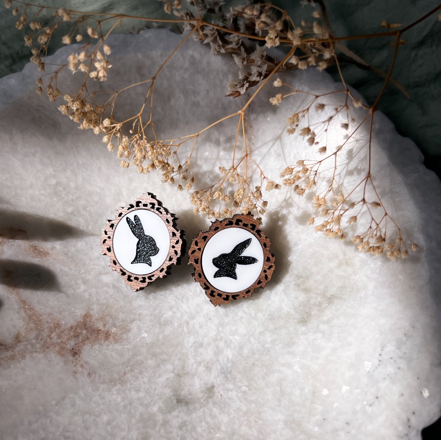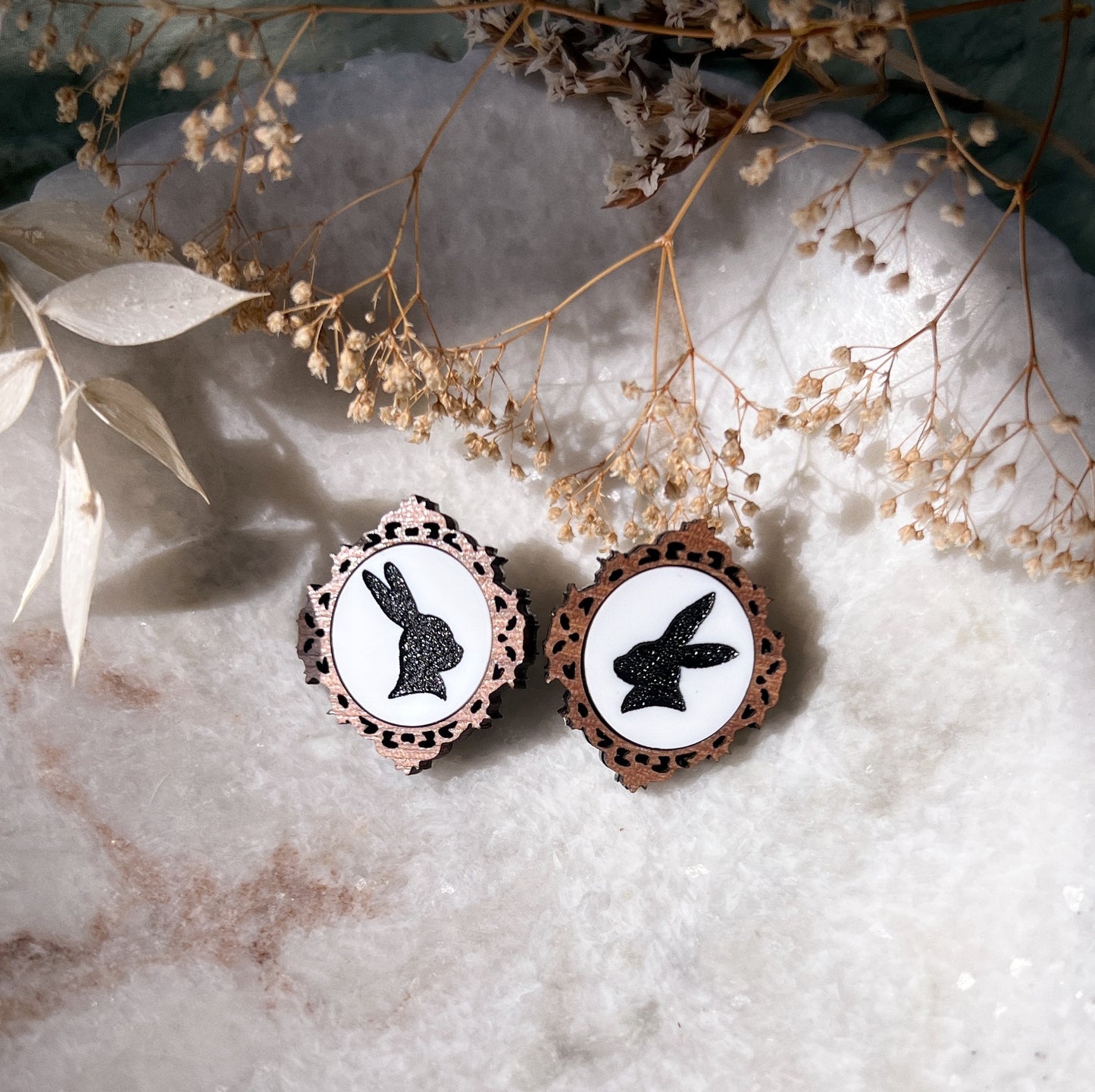 These sweet studs showcase small bunny silhouettes engraved onto white acrylic and surrounded by a walnut wood frame. Made with pure high-quality titanium posts (great for sensitive ears)!