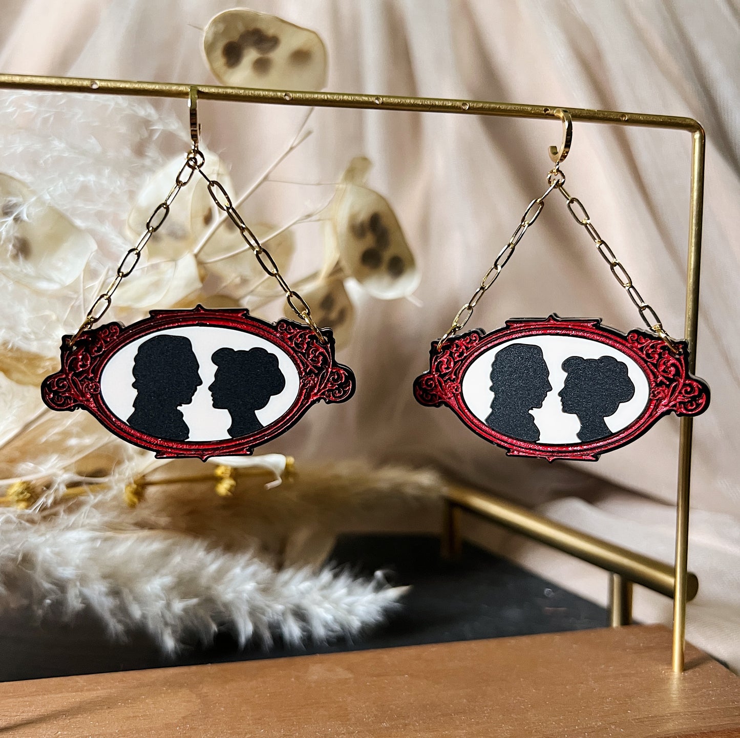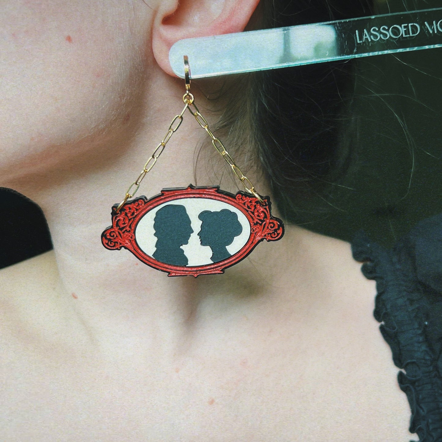 Inspired by the film Crimson Peak, these victorian style silhouette earrings show Thomas Sharpe and Edith Cushing performing a perfect waltz surrounded by a black and red filigree frame. The silhouette hangs from a gold-plated paperclip chain attached to a gold-plated leverback huggie hoops.