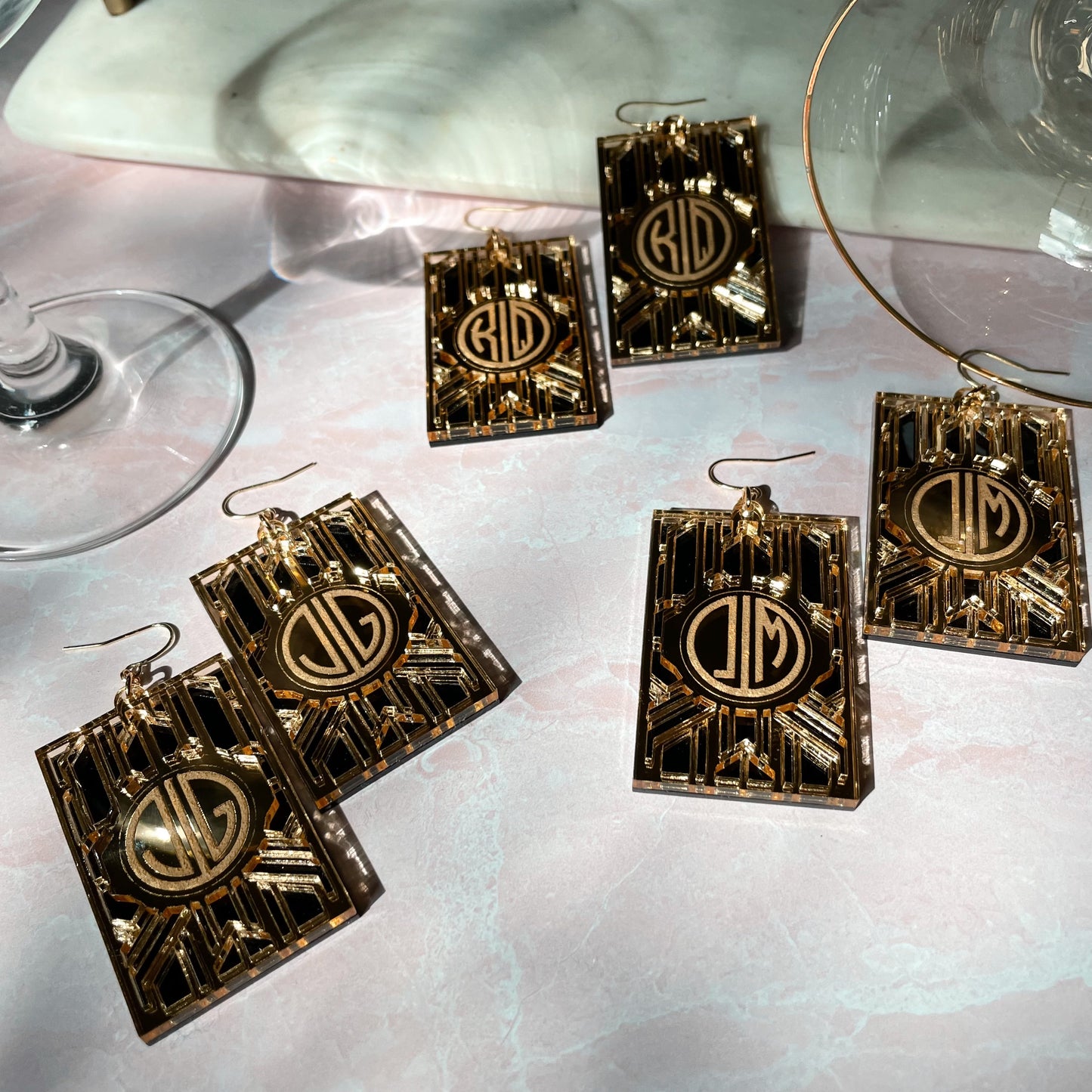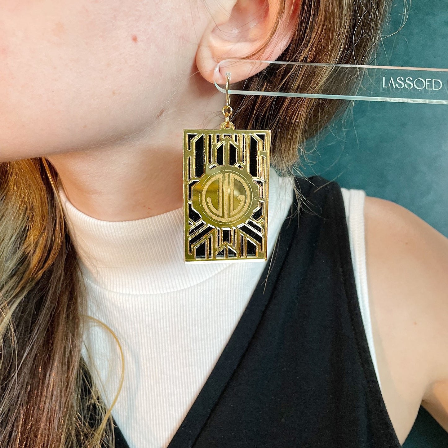 Pay tribute to Jay Gatsby who was "worth the whole damn bunch put together", by wearing these stylish art deco monogrammed earrings. Made with gold mirror acrylic, cut out in a geometric art deco pattern, layered on top of thin black acrylic, and dangling from 14K gold-plated plain ear wires.