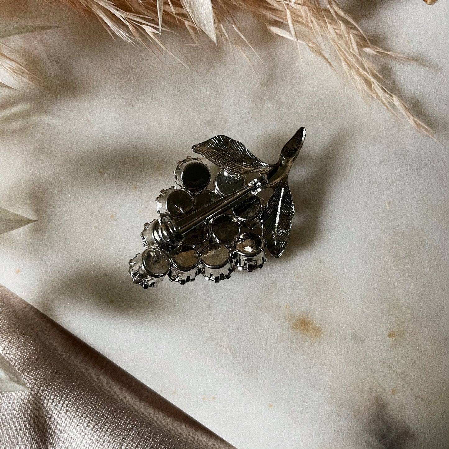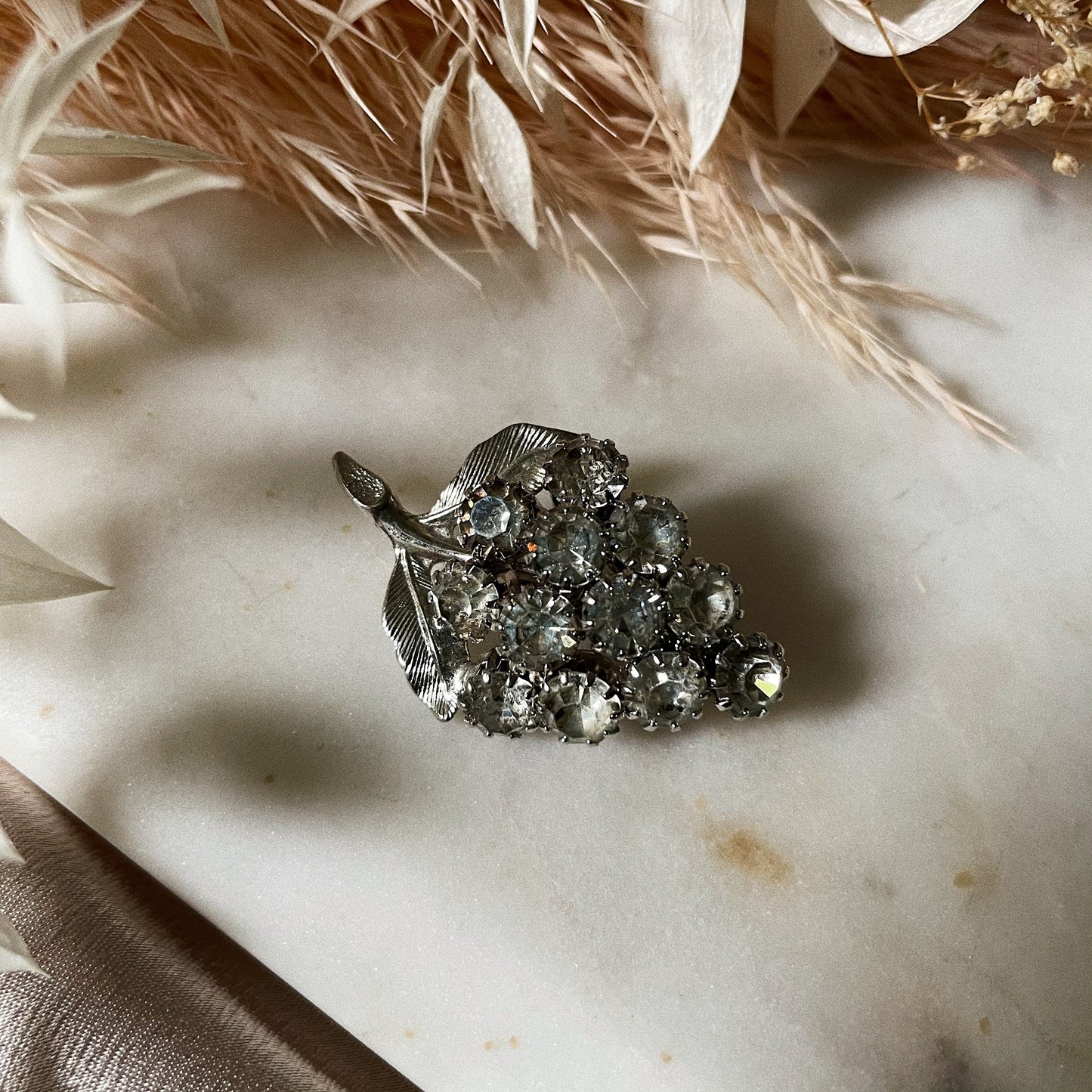 This beautiful brooch was made with clear crystals in the shape of a bunch of grapes set in silver. It is in good vintage condition and all original crystals are present, but there is some darkening within the crystals on the back.