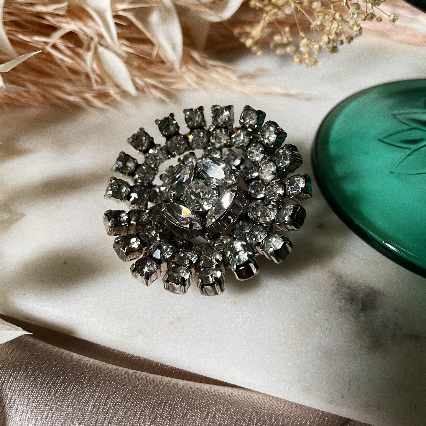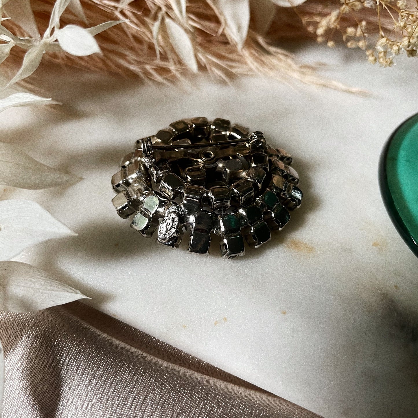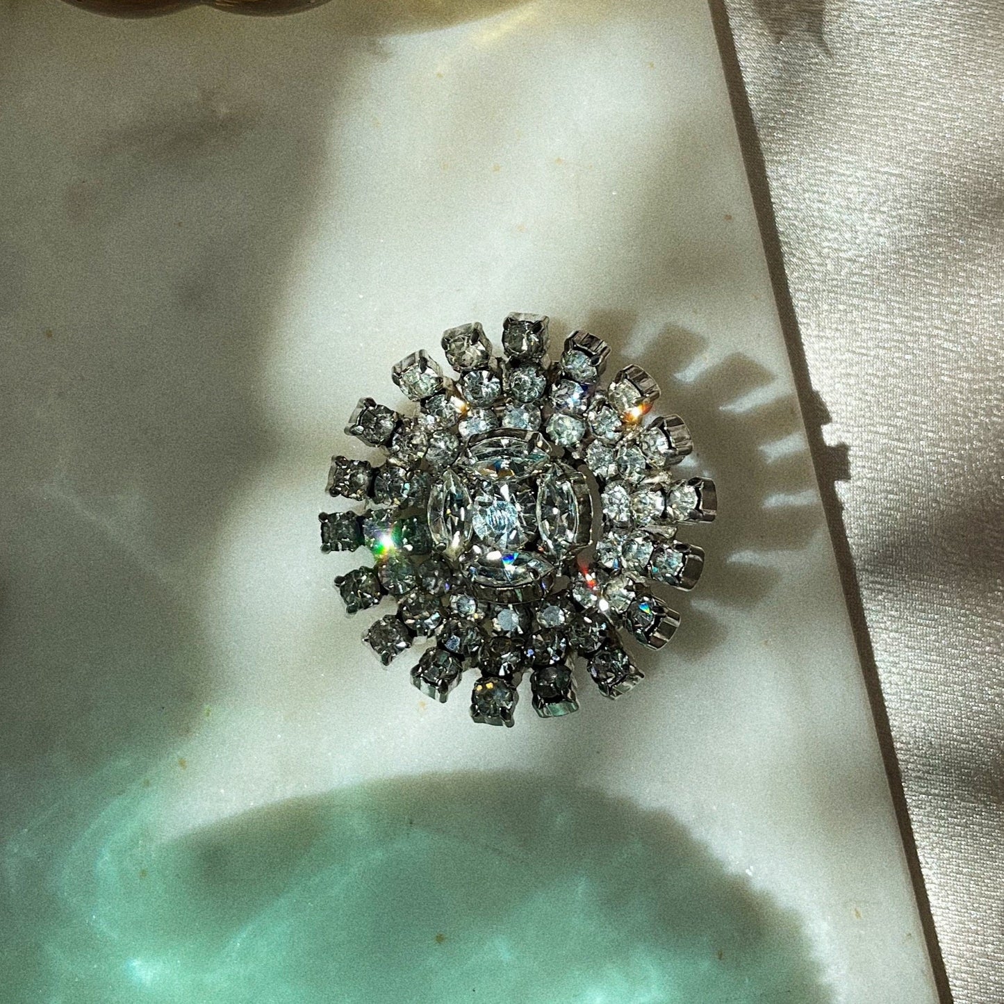 This beautiful brooch was made by Kramer of New York and features brilliant clear crystals in a flower shape. The stamped logo on the back indicates this brooch was made prior to 1955. The Kramer company was founded in 1943 and the founder, Louis Kramer, went on to design Jewelry for Christian Dior in the 1950's and 60's. This brooch is in great vintage condition and all original crystals are present.