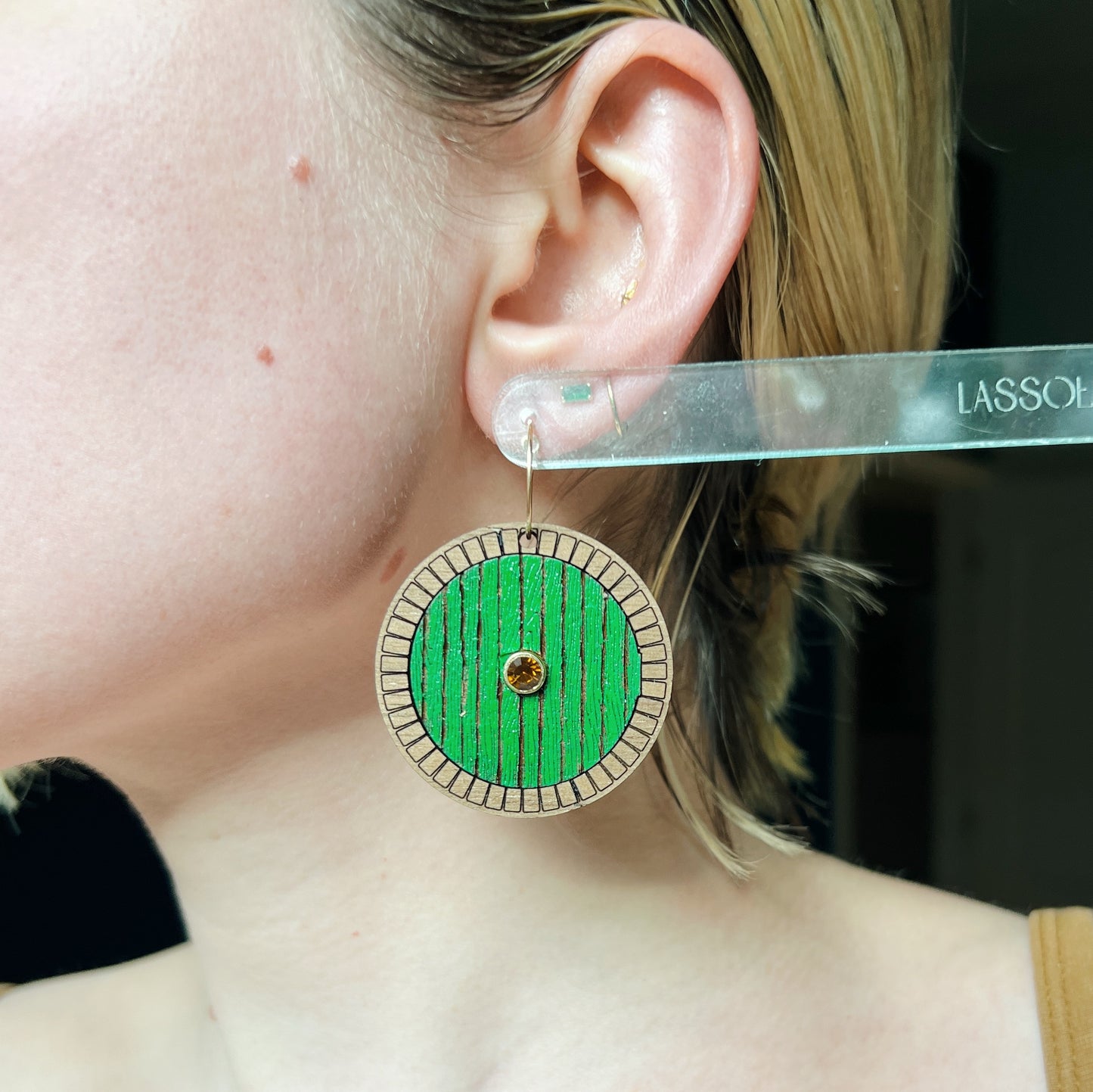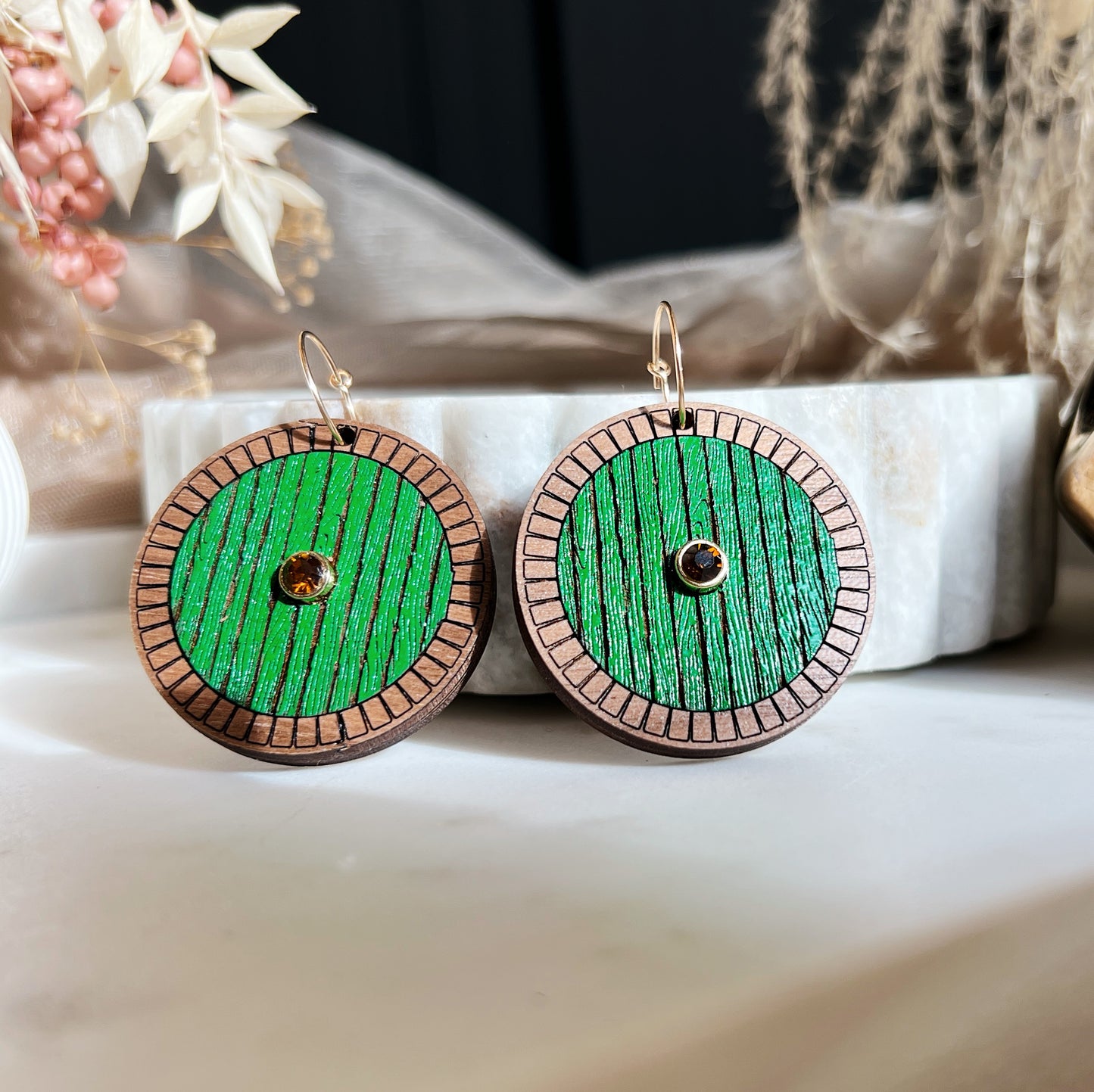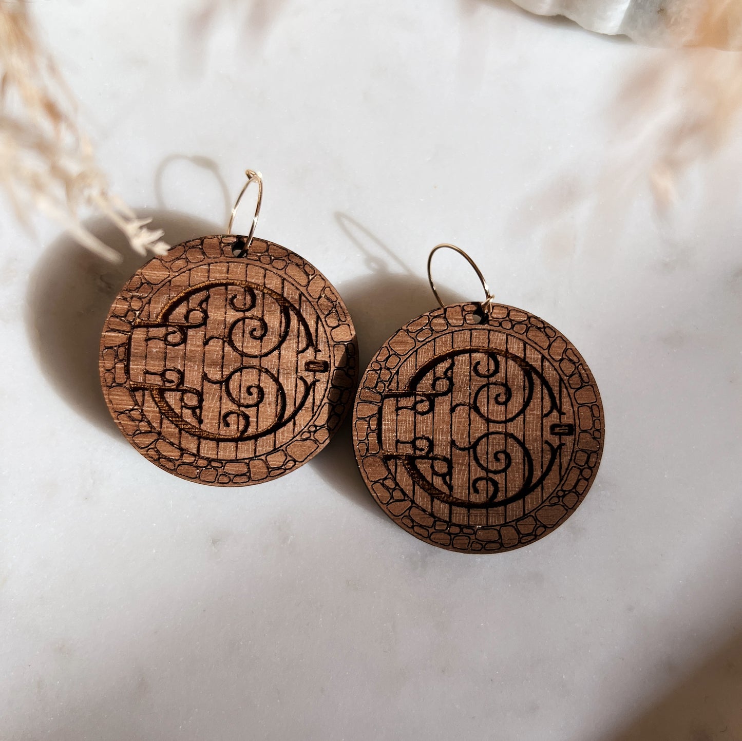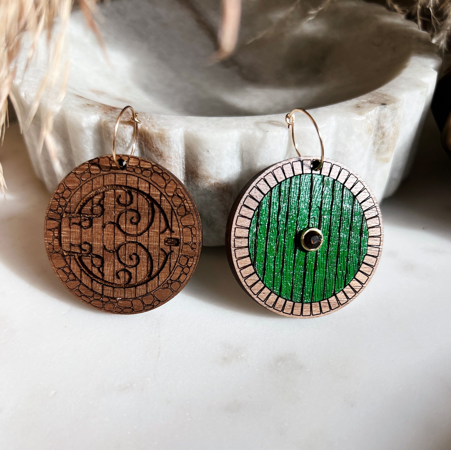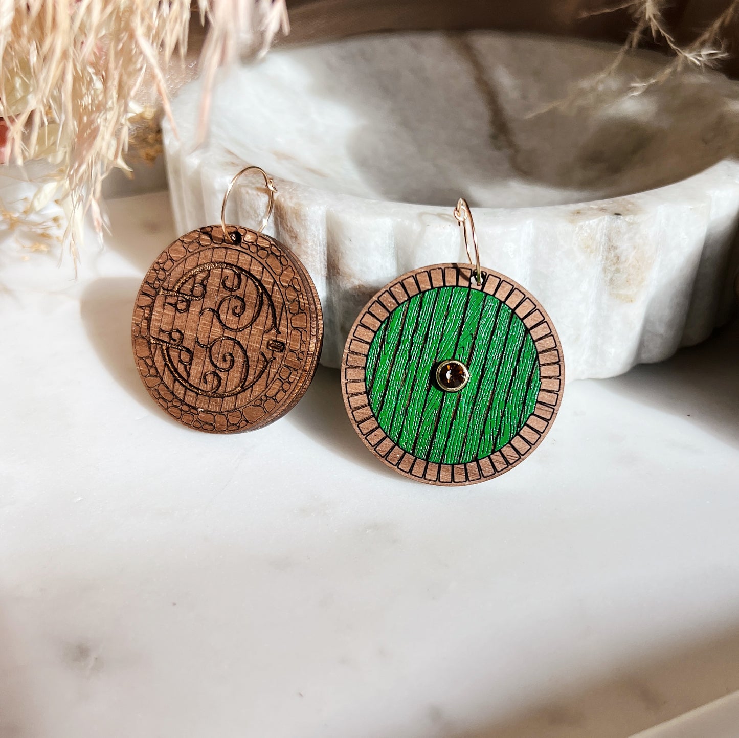 Wear these Hobbit Door Earrings to transport yourself to your own peaceful little Shire, hopefully with just as many delicious meal breaks. These earrings are made with layers of hand-painted and engraved walnut plywood hanging from dainty 14K gold-filled hoops. The earrings can be removed from the hoops and reversed if you'd like to show off the intricate engraving on the "inside" of the door, or just to match your outfit that day. The hoops can also be worn alone.